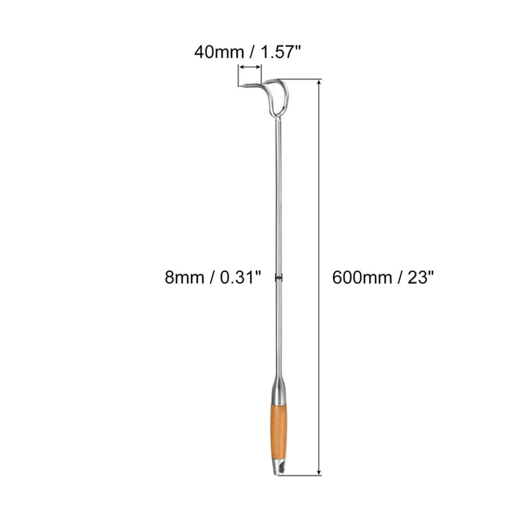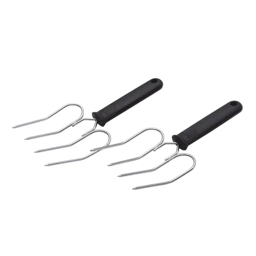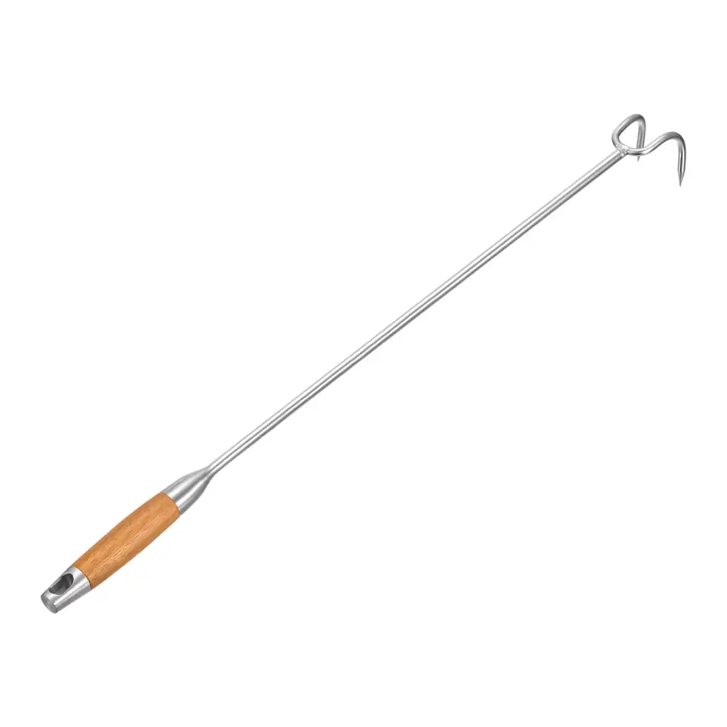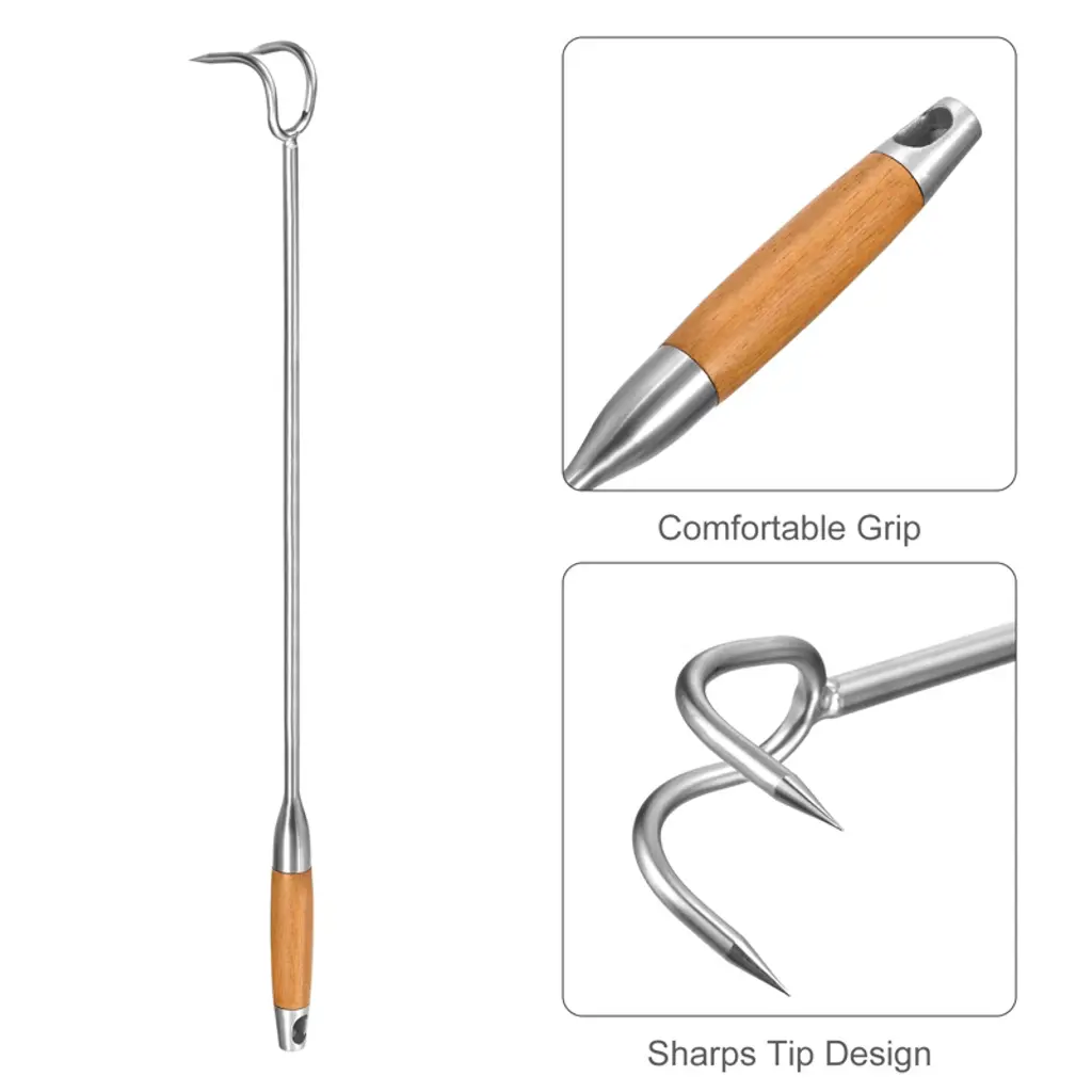 Food flipper hooks are designed for hooking, flipping, grabbing, or moving your meats, beef, steak, hot dog, chicken, and ribs quickly and safely. Made from stainless steel provides high strength, good wear resistance, and high-temperature resistance, it is rustproof, with no deformation, and durable to use. These meat hooks are widely in restaurant kitchens, grilling, grocery stores, outdoor barbecues, barbecue shops, home kitchens, dining rooms, and so on. The wooden handle is heat resistant, with a comfortable grip, and the long handle allows for safe roasting. The hook point is perfect for easy grabbing meats. Fitted with a copper loop for easy hanging storage.