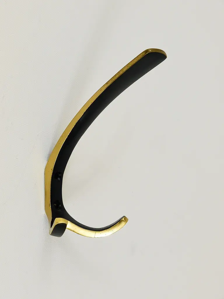 Up to two beautiful Austrian modernist brass wall hooks, executed in the 1950s by Hertha Baller, Austria. Made of black finished and partly polished brass, very solid, in good condition with nice patina. Sold and priced per piece.