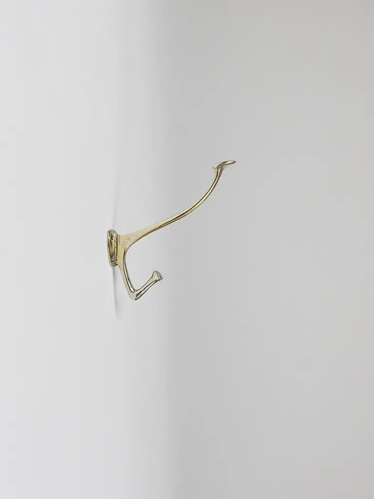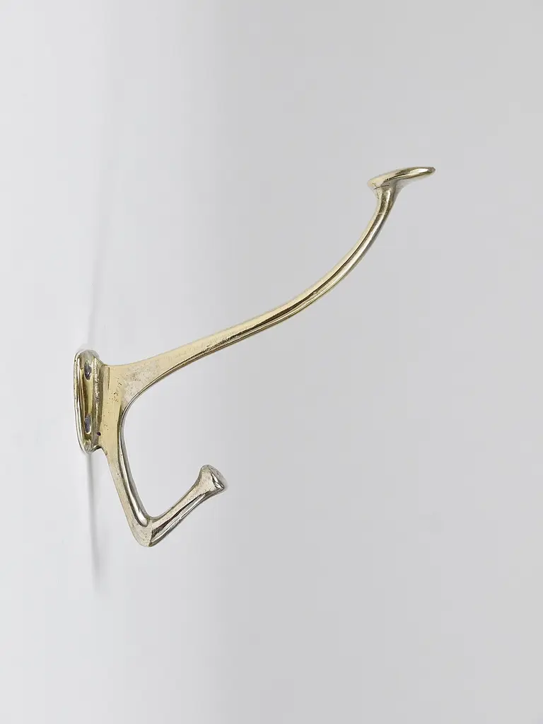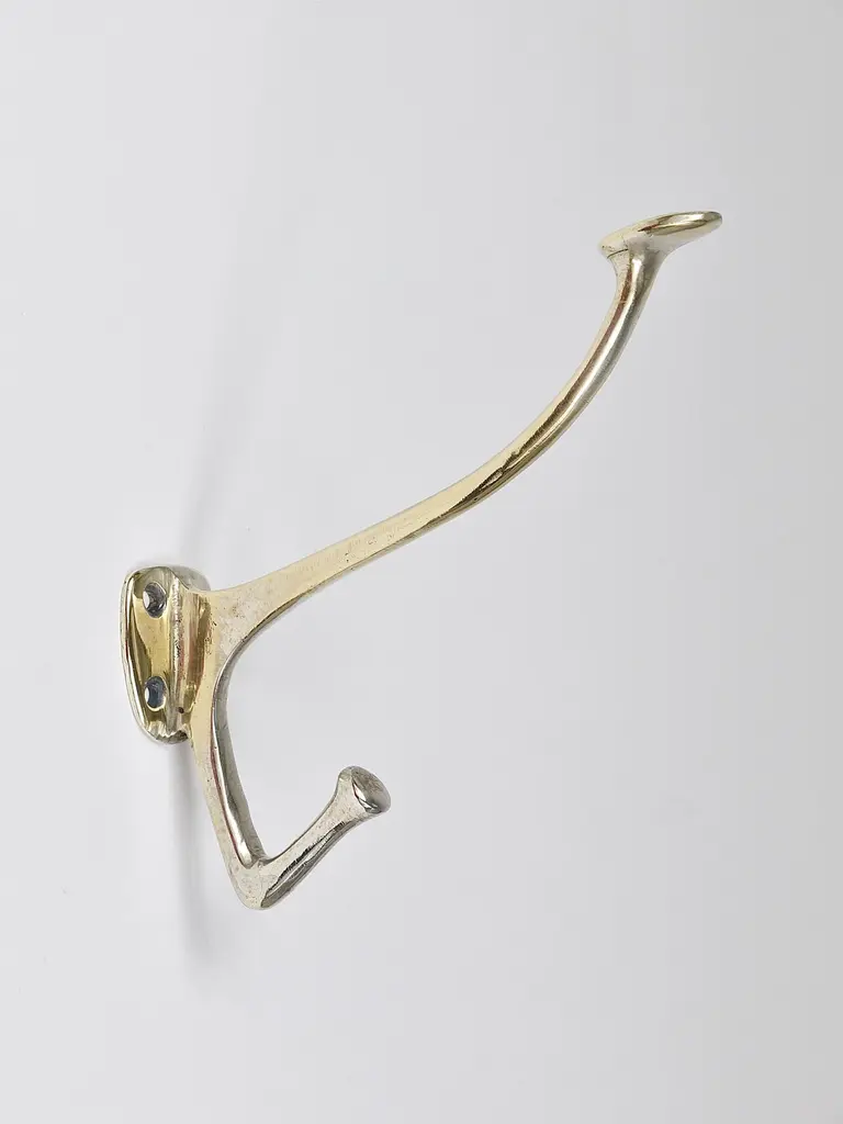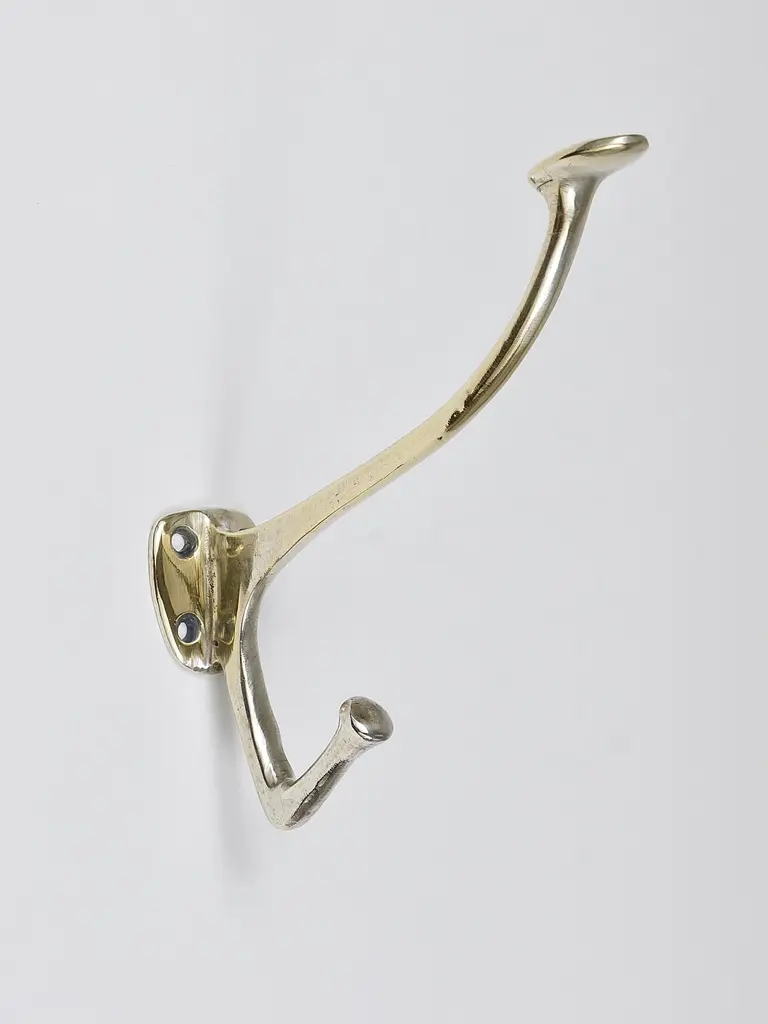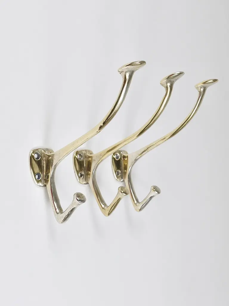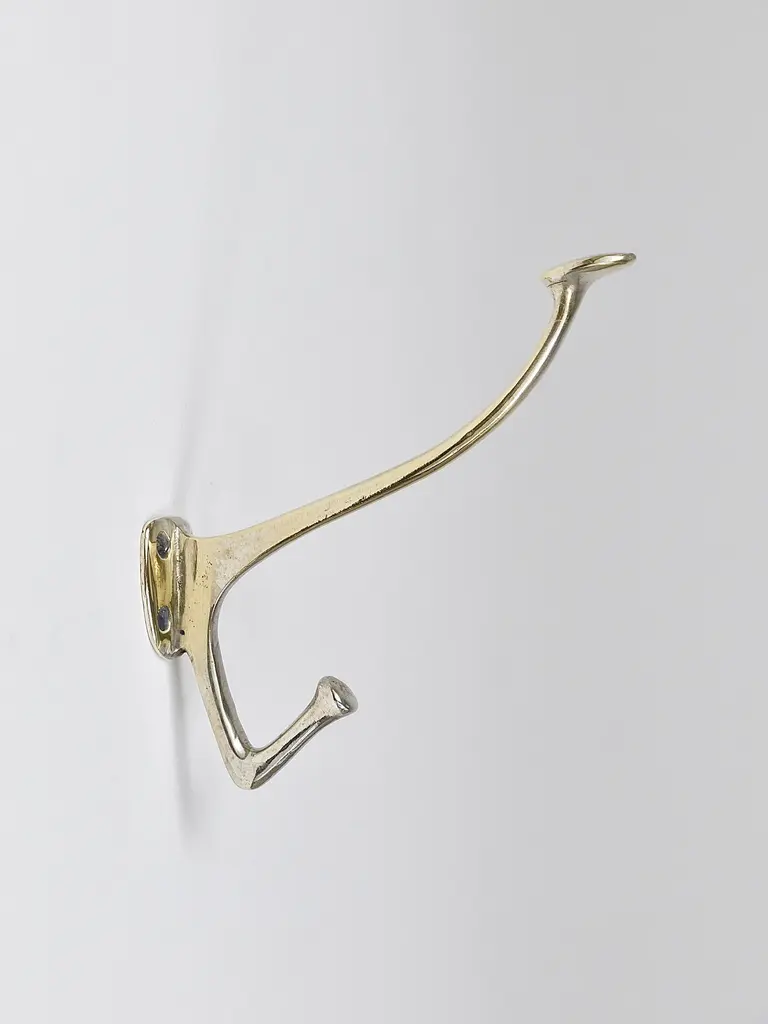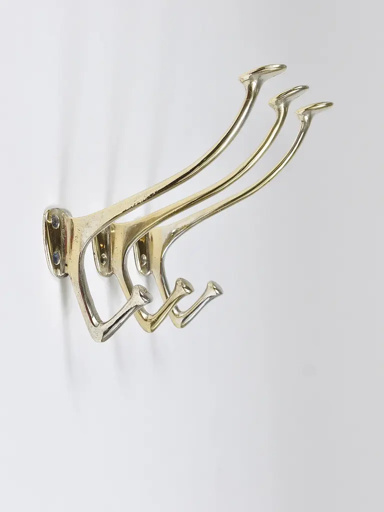 Up to six beautiful and elegantly curved Art Nouveau coat hooks. Sold and priced per piece. Designed circa 1916 by Adolf Loos (1870 - 1933) for the Jugendstil Café Capua in Vienna. Made of nickel-plated brass, in good condition with nice patina. Sold and priced per piece.