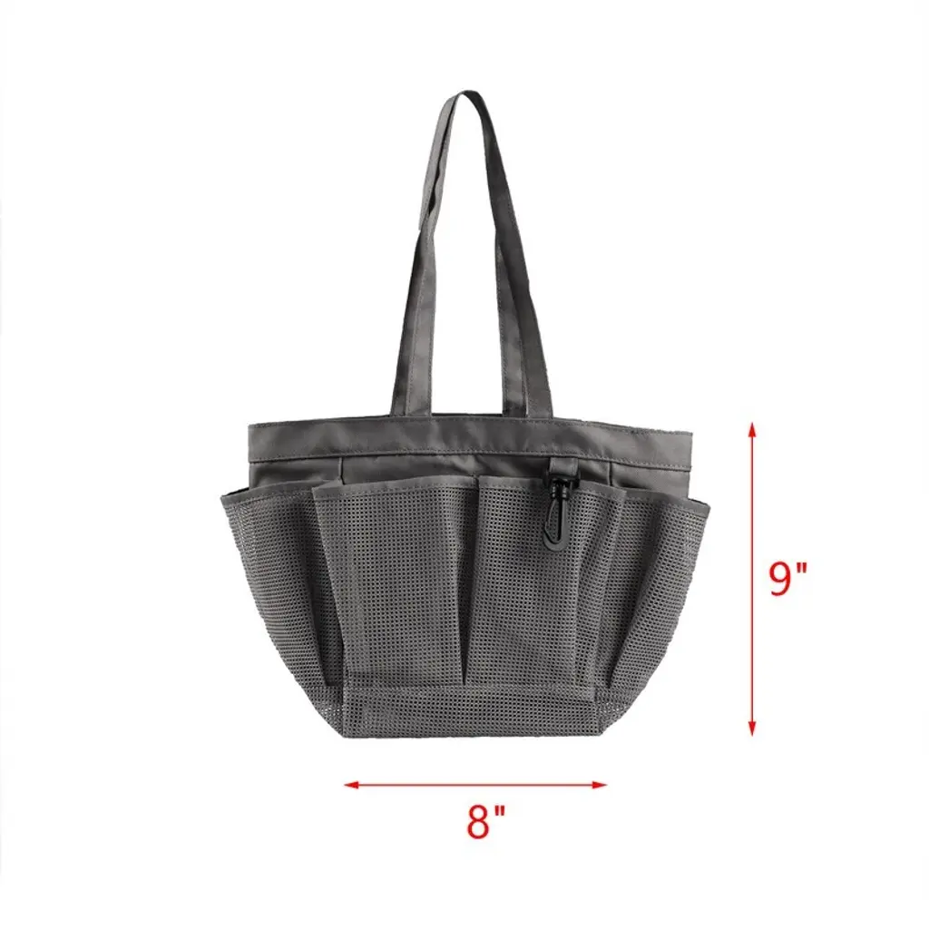 Product contains one mesh portable shower caddy, 1pc clear 3G 71x71 inch PEVA Shower Liner & 12pcs steel shower hooks. 5 Color Options for Shower Hooks: Matt Black, Brushed Nickel, Chrome, Oil Rubbed Bronze & Gold. STYLISH BAG FOR YOUR ESSENTIALS: Keep your shower essentials organized and handy with this Mesh Portable Shower Caddy. This mesh tote bag is a convenient way to keep your shower essentials organized and within reach. This shower bag features a large compartment and pockets for all your shower needs and has a convenient handle for easy carrying and hanging. QUICK DRYING SHOWER CADDY: With its convenient design, the Mesh Portable Shower Caddy is a suitable storage bag to keep your shower essentials organized and accessible. Made with water-resistant, breathable mesh fabric, this shower caddy is designed to quickly dry after each use. The lightweight design makes it easy to carry and store, while the mesh fabric allows for air circulation to help prevent dirt or mold buildup. WITH MULTIPLE STORAGE SPACES: Make your shower routine easier with this bathroom organizer bag. Featuring one large main storage area and six large pockets, you can easily store all of your shower necessities, including shampoo, conditioner, body wash, and more, in one convenient place. The handle straps make it easy to hang on a shower rod or hook, and the reinforced bottom ensures that your items stay secure. VERSATILE TOTE BAG: Whether you're heading to the gym, beach, or just need a convenient way to store your shower items, the Mesh Portable Shower Caddy is your on-the-go bag. This tote bag is suitable for college dorms, apartments, and any other small space. It's also great for traveling, as it folds up for easy storage and transport, plus a bonus key hook lets you easily hang your bag anywhere! ABOUT US: UTOPIA ALLEY is a woman-owned and operated business. Our goal is to provide our customers with furniture, home decor, essentials, and accessories made with durable products and exceptional craftsmanship. We believe in creating a stylish, comfortable space where you can relax, recharge, and feel inspired. Product Size: Mesh Tote Caddy: 9"x8". PEVA liner: 3G, 71 x 71". Shower hook: 1.9"x2.4", 1" space around shower rod.