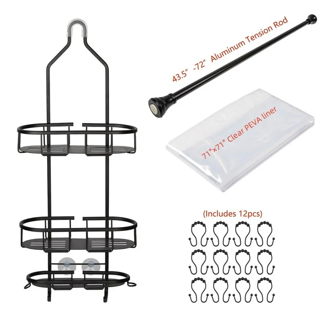 Product contains one aluminum shower caddy, 1pc clear 3G 71x71inch PEVA Shower Liner, 12pcs rustproof stainless steel black double roller ball shower hooks & 1pc 42-72" black aluminum shower tension rod. EASY TO INSTALL, NO TOOLS NEEDED: Upgrade your bathroom with this modern and stylish aluminum shower caddy - rustproof and featuring an attractive matte black finish. This shower caddy is perfect for all kinds of shower products and accessories, including over-showerhead caddies, holders, organizers, and trays. Quick to install and remove with its adjustable brackets, you'll be able to easily mount the caddy over the showerhead without any tools. ENJOY EASY AND NO MESS WATER DRAINAGE: This aluminum shower caddy's three individual shelves for storage, each with its own drainage slot. Overall dimensions of 11" L x 5" D x 26.5" H Shelf 1 & 2: 11" L x 5" D x 2.3" H Shelf 3: 11" L x 4" D x 0.9" H, allowing you to store all your items in an organized way. This shower caddy is a durable, space-saving, and adjustable design that is easy to maneuver and offers plenty of storage, and is built to last through all of your daily shower needs! RUST-PROOF ALUMINUM SHOWER CADDY: Never worry about rust again with this rustproof aluminum shower caddy. Reinforced with a resistant finish, you can use it for many years without ever worrying about rust and ensuring a long and rust-free life even with frequent use! That's one worry-free additional classic bathroom accessory you definitely need in your home to make your everyday easy. BATHROOM ESSENTIALS & PRODUCTS - This shower caddy is perfect for all kinds of modern bathroom products, including over showerhead caddies, corner shower stools, hanging shower caddies, shower caddies for large shower heads, shampoo holders, and all kinds of bathroom trays, holders and organizers. With its many storage spaces, all your toiletries will have their own space. Say goodbye to boring bathroom spaces. Say hello to a spacious and trendy-looking bathroom. STYLISH AND SLEEK DESIGN: Upgrade your bathroom with this modern and stylish aluminum shower caddy, perfect for keeping all your items organized and secure. This aluminum shower caddy adds a perfect and classic touch to your bathroom while keeping all your items neatly organized and secure. You will never be out of style again. This shower caddy suits whatever design you have in your bathroom whether it's rustic, modernized, or chic style. Product Size: Shower caddy: Overall: 11" L x 5" D x 26.5" H. Shelf 1 & 2: 11" L x 5" D x 2.3" H. Shelf 3: 11" L x 4" D x 0.9" H. Shower hook: 1.9"x2.4", 1" space around shower rod. PEVA liner: 3G, 71x71". Tension rod: Adjustable Size 44" to 72" L, 2.4" H.