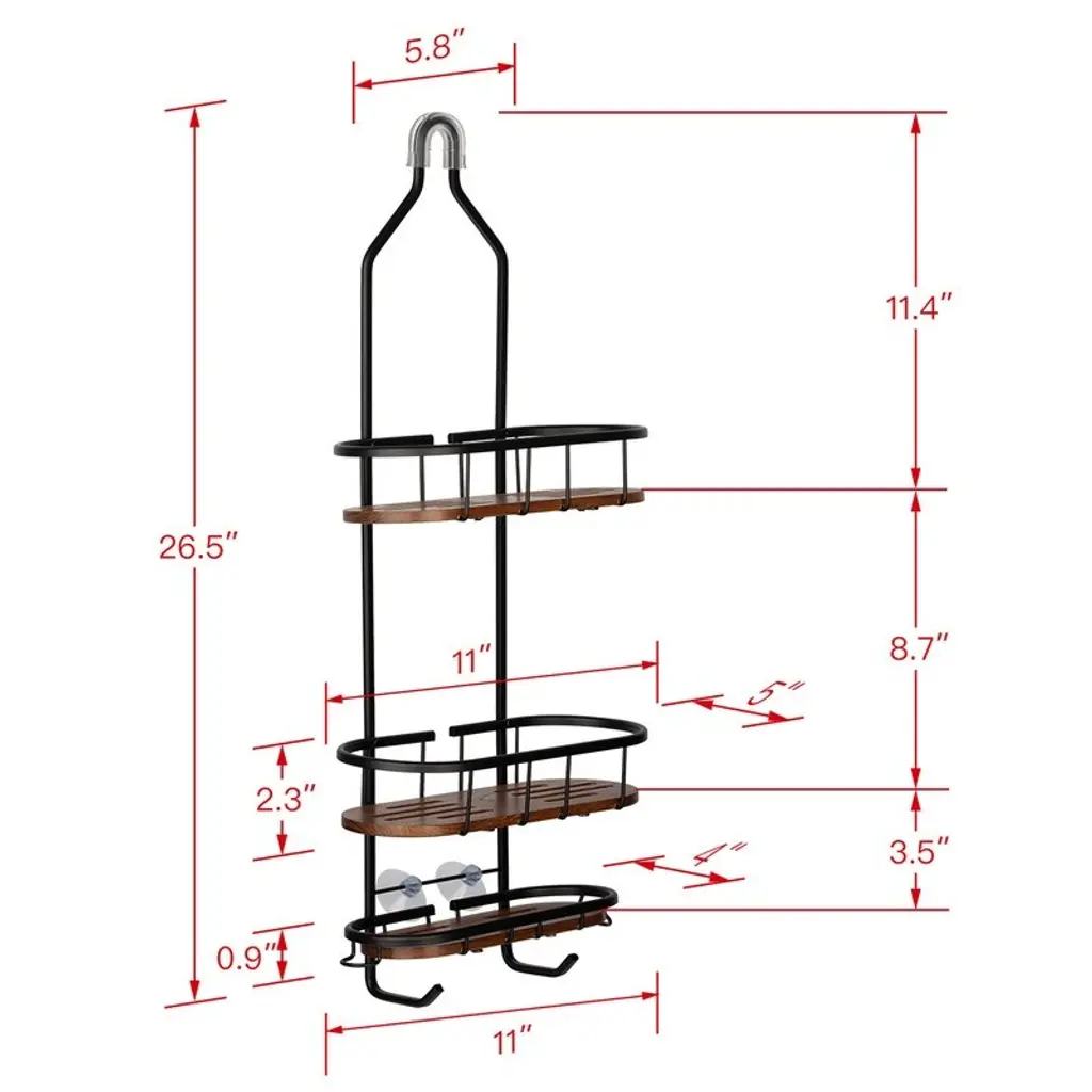 Product contains one aluminum shower caddy, 1pc clear 3G 71x71inch PEVA Shower Liner, 12pcs rustproof stainless steel black double roller ball shower hooks & 1pc 42-72" black aluminum shower tension rod. EASY ACCESS TO EVERYTHING: Our Tia Over the Shower Head Caddy is the perfect storage solution for your bathroom, featuring two individual shelves for housing all your shower essentials like shampoo bottles, soaps, and sponges. You will never have a hard time looking for your toiletries because these shower caddy storages are easy to access while keeping your essentials safe and secure from fall. QUICK AND SIMPLE TO INSTALL: No need to be skilled and professional in installing this shower caddy. This shower caddy is perfect for all kinds of shower products and accessories. Quick to install. you'll be able to easily mount the caddy over the showerhead without any tools. You can enjoy a neat and organized bathroom in no time and a hassle-free organization! GENEROUS STORAGE SPACE: Overall: 11" L x 5" D x 26.5" H Shelf 1 & 2: 11" L x 5" D x 2.3" H Shelf 3: 11" L x 4" D x 0.9" H. This shower caddy provides more shower space and organization, making it perfect for guest bathrooms and everyday use. You will never have a hard time with your bathroom organization because you can put all your bathroom toiletries like shampoos, body washes, loofahs, lotions, conditioners, and more. GET IN STYLE: Be organized with our Over The Shower Head Caddy and enjoy rustproof, aluminum construction and real teak base for a spa-like bathroom experience. Its matte black finish and sleek design make it a perfect fit for any bathroom. With no tools required for installation, you can easily hang this shower caddy over your shower head for effortless storage and organization. RUST-PROOF CADDY: Perfect for housing your toiletries and creating more shower space, this caddy is perfect for both small and large shower heads. Plus, with its durable construction and rustproof finish, this caddy will remain in your bathroom for years, even in wet environments. Get ready to enjoy a more organized and elegant bathroom with Utopia Alley Over the Shower Head Caddy. Product Size: Shower caddy: Overall: 11" L x 5" D x 26.5" H. Shelf 1 & 2: 11" L x 5" D x 2.3" H. Shelf 3: 11" L x 4" D x 0.9" H. Shower hook: 1.9"x2.4", 1" space around shower rod. PEVA liner: 3G, 71x71". Tension rod: Adjustable Size 44" to 72" L, 2.4" H.