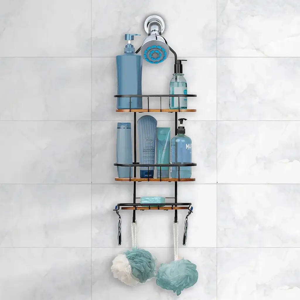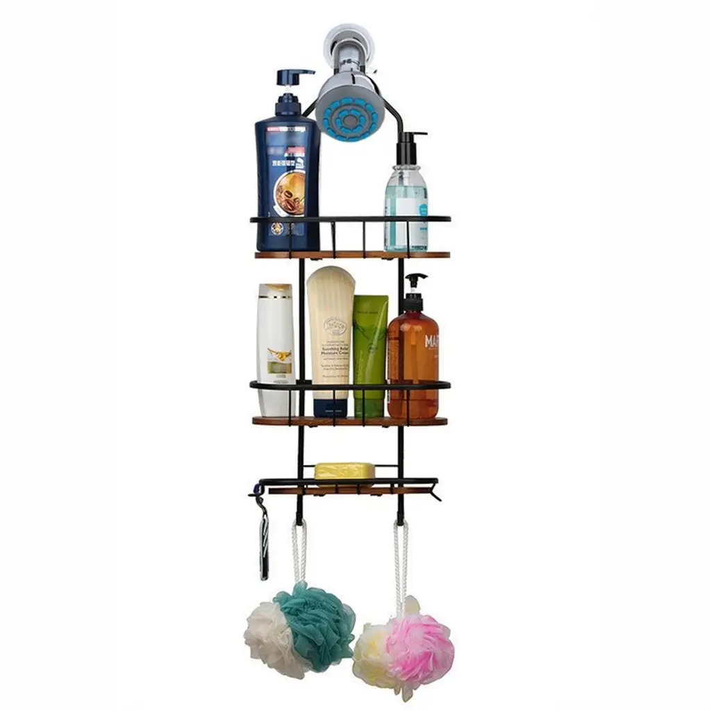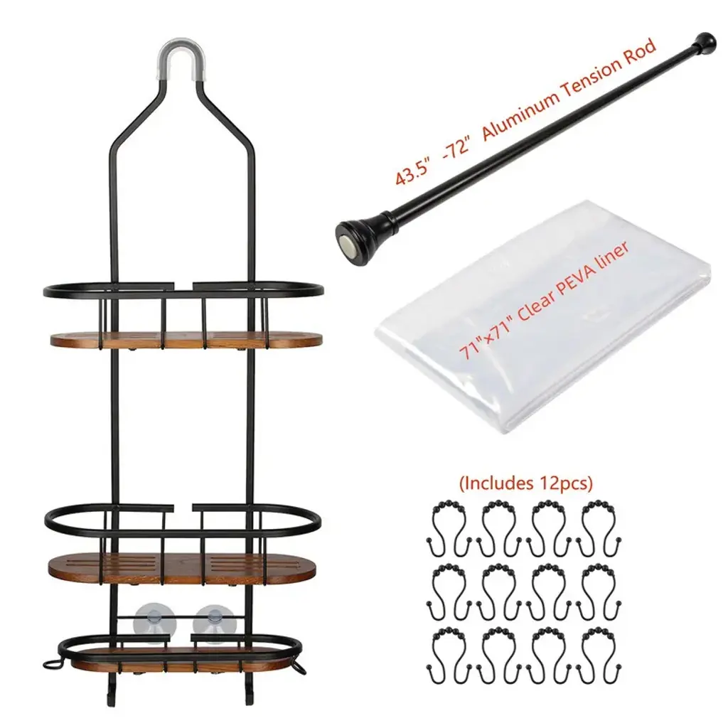 Utopia Alley Rustproof Teak Shower Caddy Organizer With 3 Shelves, Includes Shower Rod, Shower Liner And Shower Hooks, Black - Matt Black - 11*5*26.5"