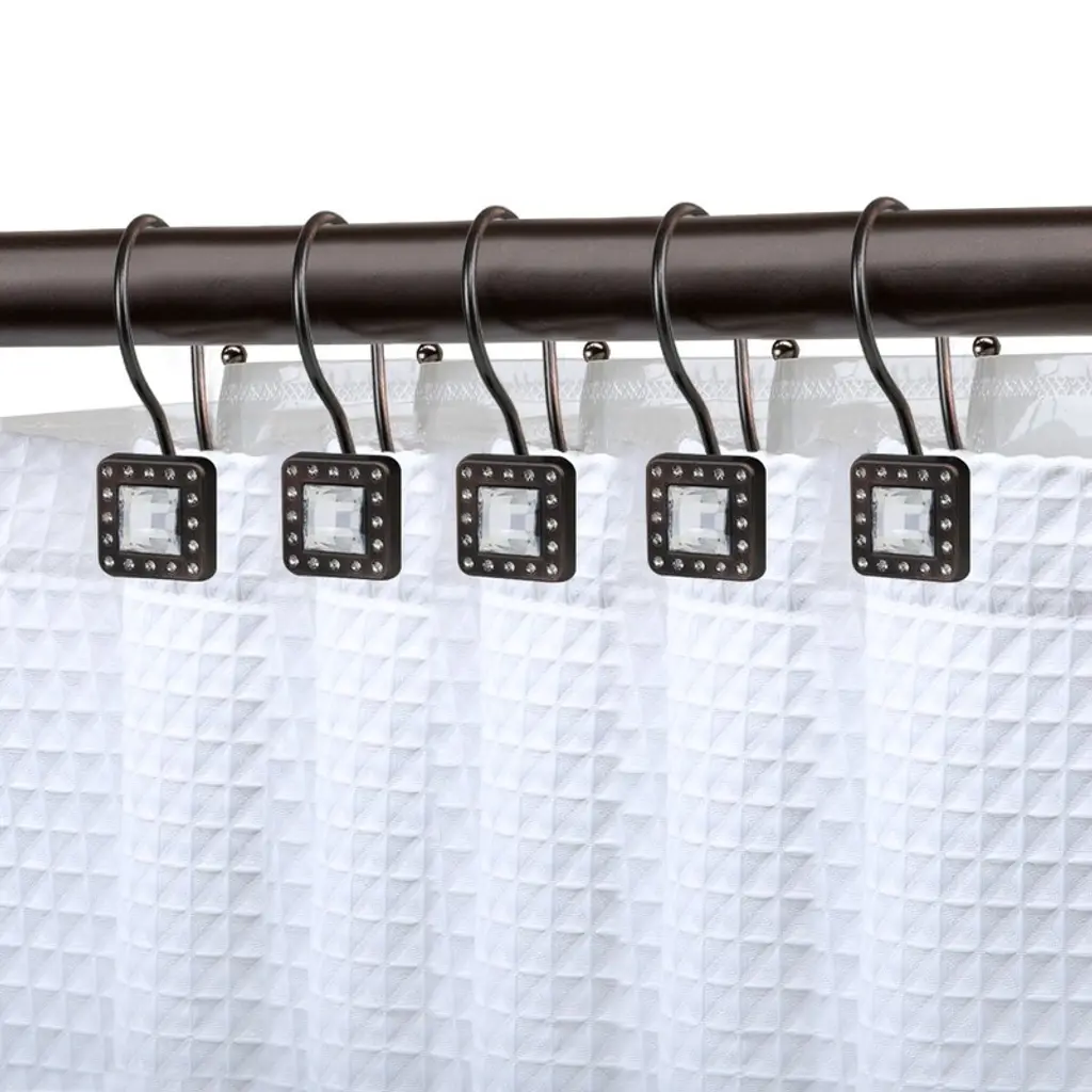 DOUBLE SHOWER CURTAIN HOOKS: This double shower curtain hook has style and function in one. Use it to hang your favorite shower curtain while keeping the liner hidden. This double shower hook is designed to be installed next to each other, with one side holding up the liner and the other holding up the shower curtain. It's simple, sleek, and practical, making it an important part of your bathroom design. DURABLE & RUST PROOF MATERIAL: These durable shower curtain hooks are made of rust-proof, heavy-duty material that won't easily bend, break or rust. They are made from a zinc alloy to keep them secure and modern. These rust-proof hooks are sturdy, which means you don't need to replace them frequently anytime soon, and they can be used for many years. EASY TO INSTALL: Taking your shower curtain off is a bit of a squeeze, but putting it back on should be a breeze! Our sleek shower curtain hooks are easy to install and coordinate with many bath hardware finishes; simply put it on the shower rod. Our curtain hooks in a set of 12 are designed for easy removal, so you can swap them out when it's time for a new look or you need to replace your shower curtain or liner. AVAILABLE COLORS: Amp up your bathroom space and get organized with these shower curtain hooks. Beautifully suited for any bathroom, these crystal-designed hooks come in a wide range of colors; Polished Chrome, Oil Rubbed Bronze, Brushed Nickel, Matte Black, and Gold. ABOUT US: UTOPIA ALLEY is a woman-owned and operated business. Our goal is to provide our customers with furniture, home decor, essentials, and accessories made with durable products and exceptional craftsmanship. We believe in creating a stylish, comfortable space where you can relax, recharge, and feel inspired.