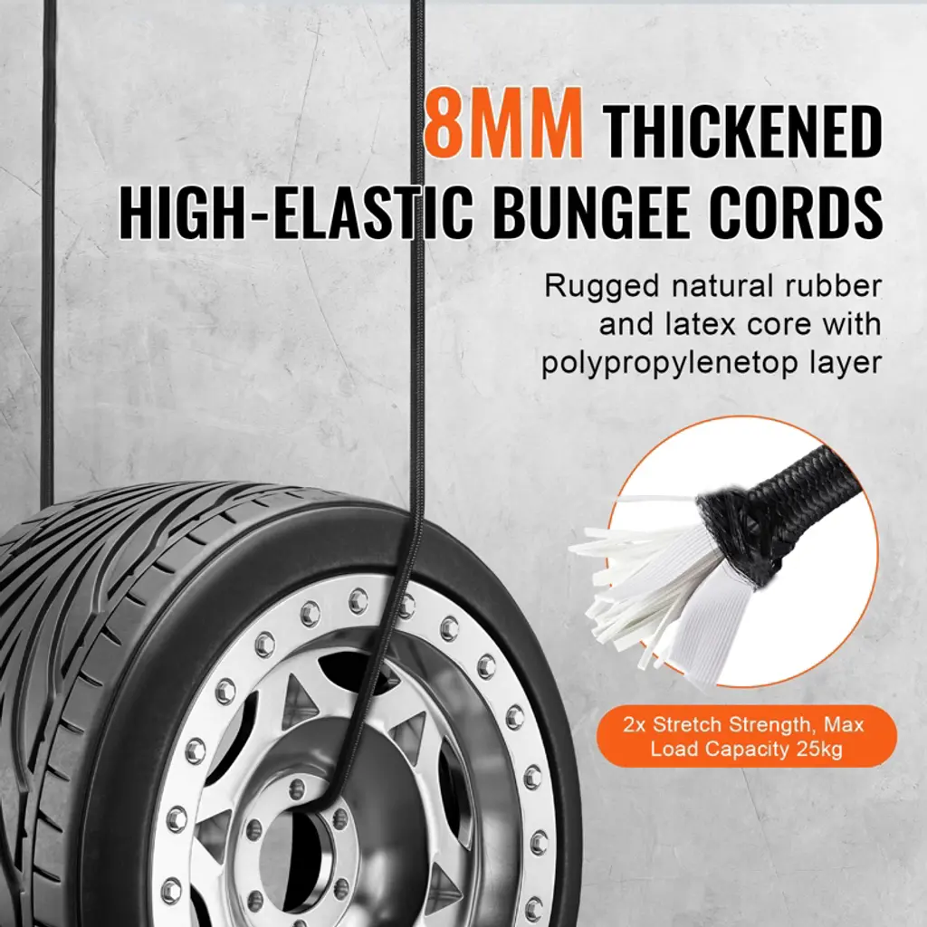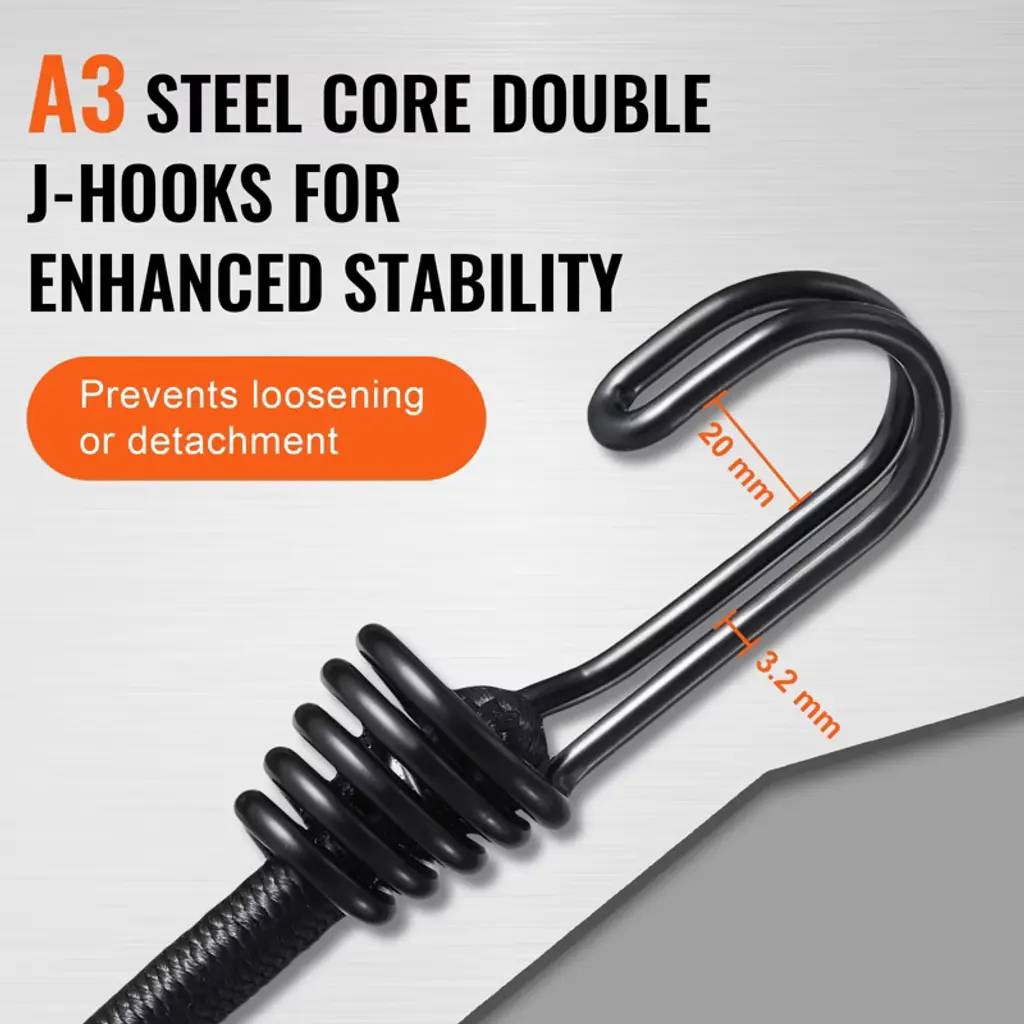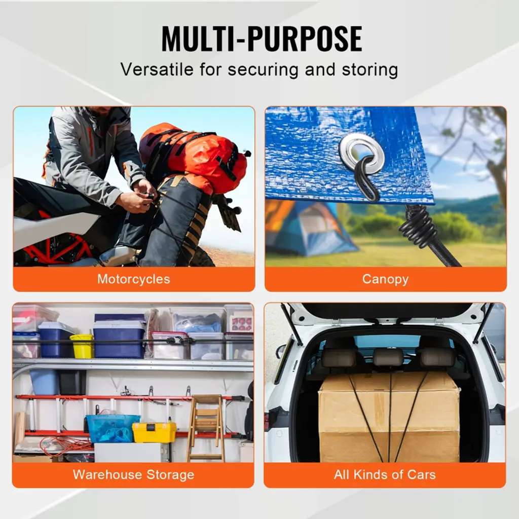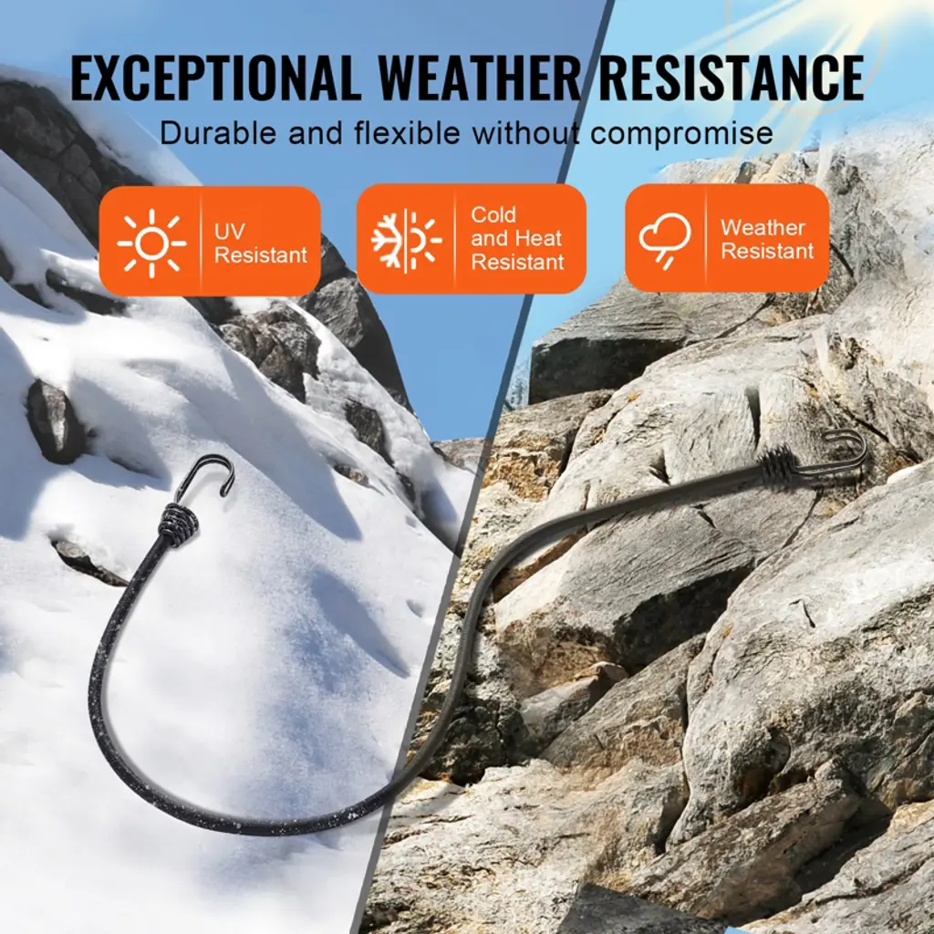 Feature: Adaptability: The high elasticity design of these bungee cords allows them to easily secure or store items of various shapes and sizes. Whether round, square, or irregular, they conform perfectly, enhancing convenience. Durability: Outstanding weather resistance ensures that these heavy-duty bungee cords maintain stable performance in extreme conditions, whether high heat, freezing temperatures, humidity, or dryness, without aging or breaking easily. Versatility: Suitable for home organization, outdoor adventures, or logistics, these bungee straps easily handle any task, fulfilling a wide range of needs for securing or storing items. Stability: The high-strength, abrasion-resistant hooks of these bungee cord sets provide exceptional stability when securing items. Even during transport or storage, bumps and vibrations won't loosen or detach your cargo. Flexibility: These bungee ropes are incredibly lightweight and can be easily packed into a backpack or tote, making them perfect for outdoor travel. Simply wrap and secure to quickly fasten items of various sizes, ensuring everything stays organized and safe. Package Content 1 x Instruction Manual 1 x Carrying Storage Bag (32 x 25 cm)
