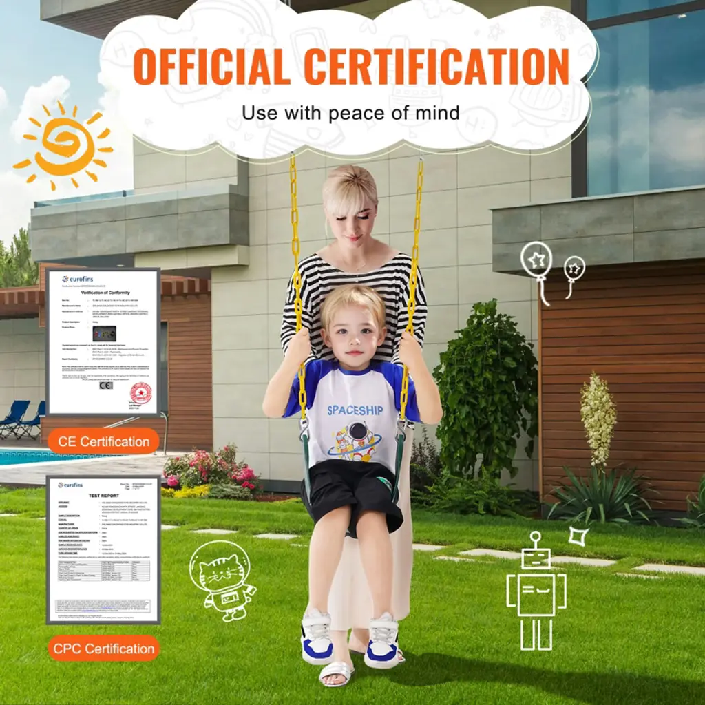 Feature: 300 lbs High Load Capacity: The VEVOR 2-piece heavy duty soft board baby swing seats support a maximum weight of 300 lbs (136 kg), accommodating older children for extended use. It includes heavy-duty chains, non-slip seats, and snap hooks to ensure safe play. Suitable for 36 Months+ Children: Ideal for toddlers, children, or teenagers aged 36 months and older, this porch swing is a perfect addition to any child's playhouse! Widely used in backyards, playgrounds, trees, swing sets, and more, it encourages children to spend more time outdoors and enjoy a happy childhood, making it an excellent gift for kids. Durable and Reliable: The seats of the swing sets for backyard is made from durable EVA, designed to withstand outdoor conditions and provide hours of safe fun. The iron chain is coated with yellow plastic for a soft, pinch-free grip, paired with galvanized steel snap hooks and a stable triangular structure, ensuring ultimate comfort and safety during play. Ideal Gift: This 2-piece baby swings for infants are perfect for any child's playhouse! Widely used in backyards, playgrounds, trees, swing sets, and more, it encourages children to spend more time outdoors and enjoy a happy childhood, making it an excellent gift for kids. Safety Certified: Our swing set is CE/CPC certified for your peace of mind. Safety is our top priority when children are playing. There is no need to worry about the quality. Package Content: 2 x Swing Seats 1 x Pair of Snap Hooks with Screw 1 x User Manual