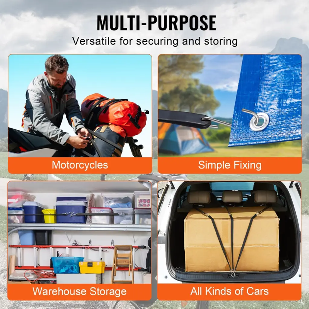 Feature: Adaptability: The high elasticity design of these bungee cords allows them to easily secure or store items of various shapes and sizes. Whether round, square, or irregular, they conform perfectly, enhancing convenience. Durability: Outstanding weather resistance ensures that these heavy-duty bungee cords maintain stable performance in extreme conditions, whether high heat, freezing temperatures, humidity, or dryness, without aging or breaking easily. Versatility: Suitable for home organization, outdoor adventures, or logistics, these bungee straps easily handle any task, fulfilling a wide range of needs for securing or storing items. Stability: The high-strength, abrasion-resistant hooks of these bungee cord sets provide exceptional stability when securing items. Even during transport or storage, bumps and vibrations won't loosen or detach your cargo. Flexibility: These bungee ropes are incredibly lightweight and can be easily packed into a backpack or tote, making them perfect for outdoor travel. Simply wrap and secure to quickly fasten items of various sizes, ensuring everything stays organized and safe. Package Content 1 x Instruction Manual