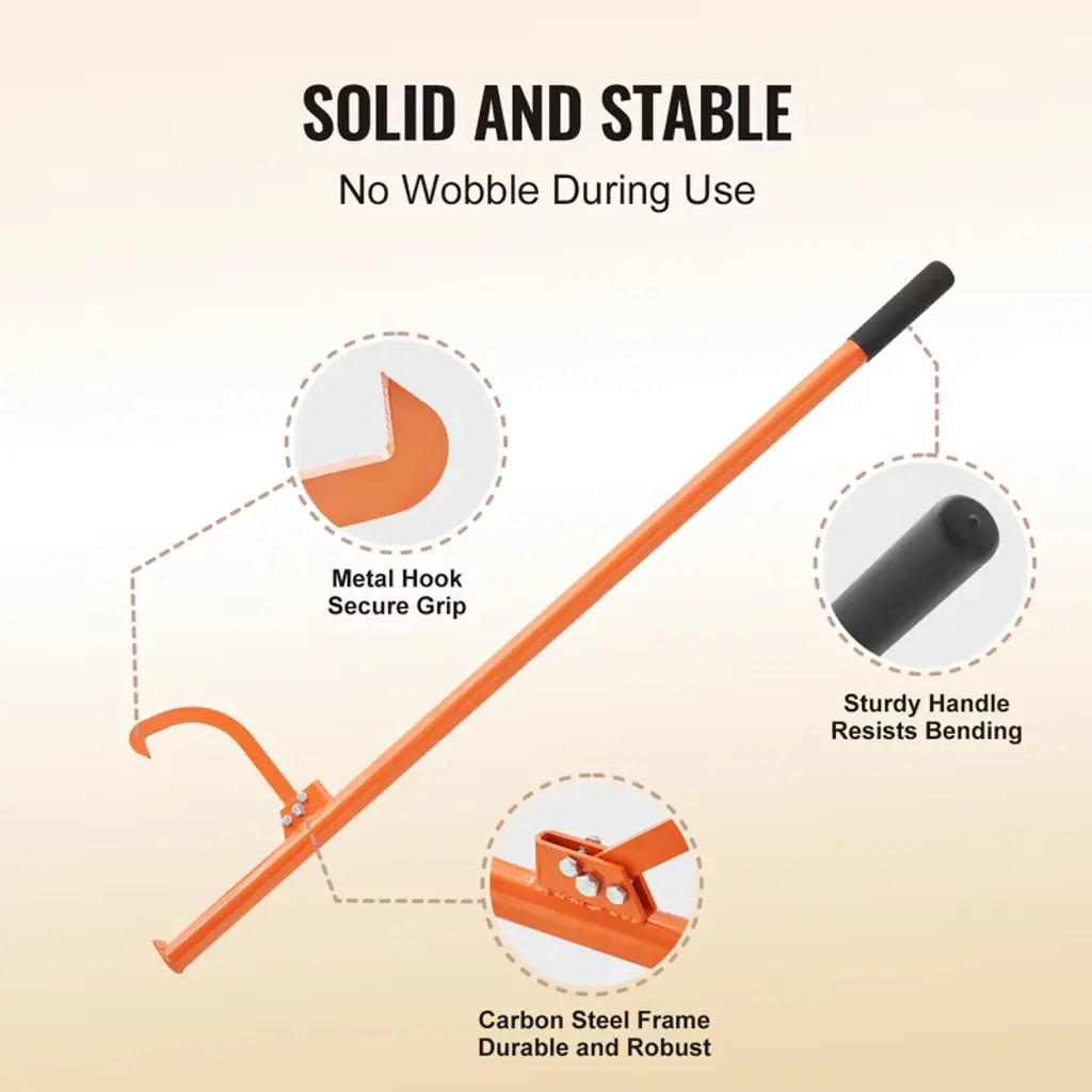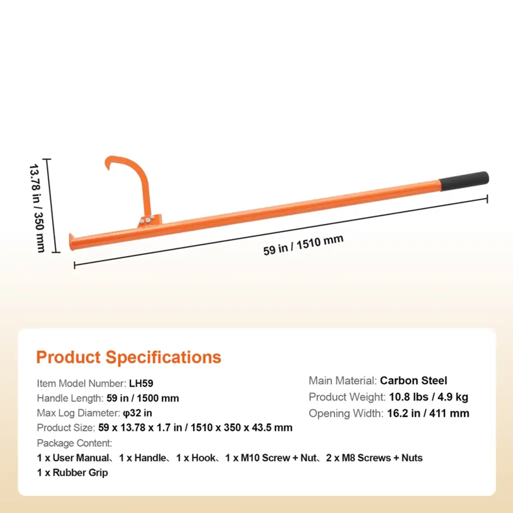 Feature: Log Lifter for Easy Handling: Our log jack uses leverage to effortlessly stack and transport wood, making it an essential tool for moving logs in forests, yards, and sawmills. Compatible with Various Log Sizes: The cant hook comes with adjustable iron hook that accommodates logs up to φ32", allowing for easy handling of different sizes. Ergonomic Handle: With handles measuring 59", covered in rubber grips, this logging jack provides a comfortable and secure hold while lifting and dragging logs, reducing strain and preventing fatigue. Durable Material: Constructed from heavy-duty carbon steel with robust welds, this timberjack is designed for durability. The log lifter comes with orange powder-coated surface that protects against rust and corrosion, extending its lifespan. Easy Assembly and Use: Assembly this logging tool is straightforward with screws and nuts, requiring no additional power tools, making it simple for one person to set up. Package Content: 1 x User Manual 1 x Handle 1 x Hook 1 x M10 Screw + Nut 2 x M8 Screws + Nuts 1 x Rubber Grip
