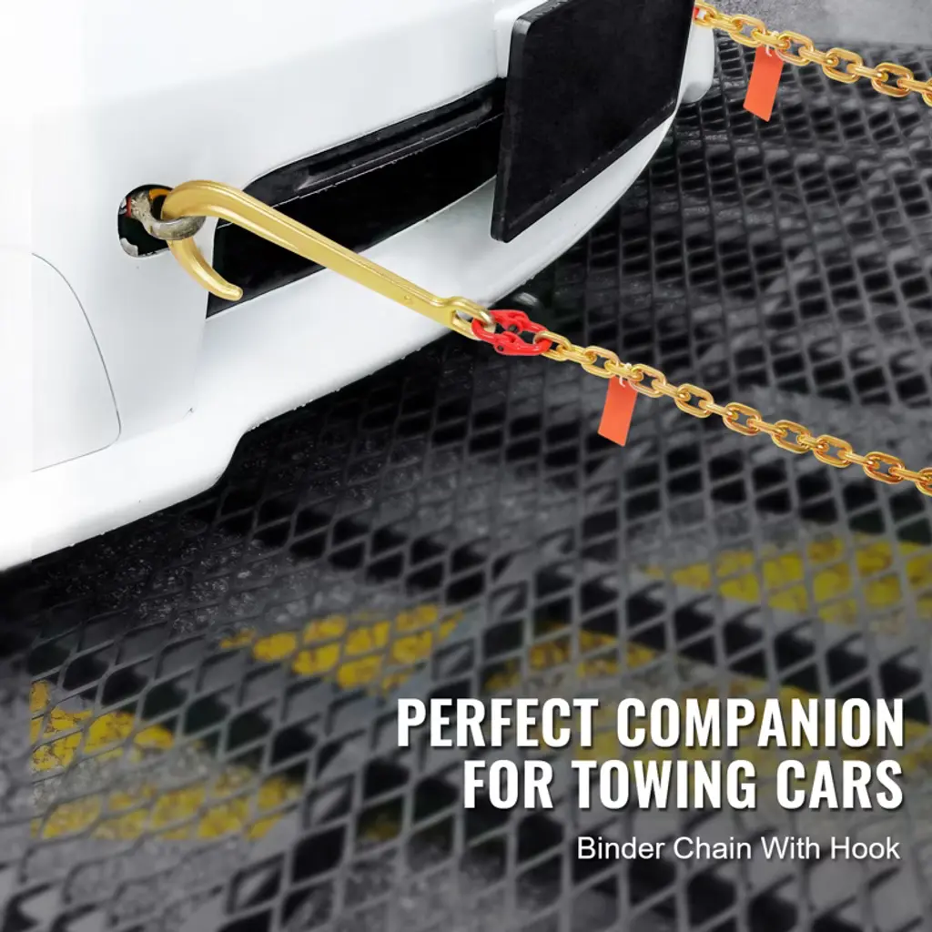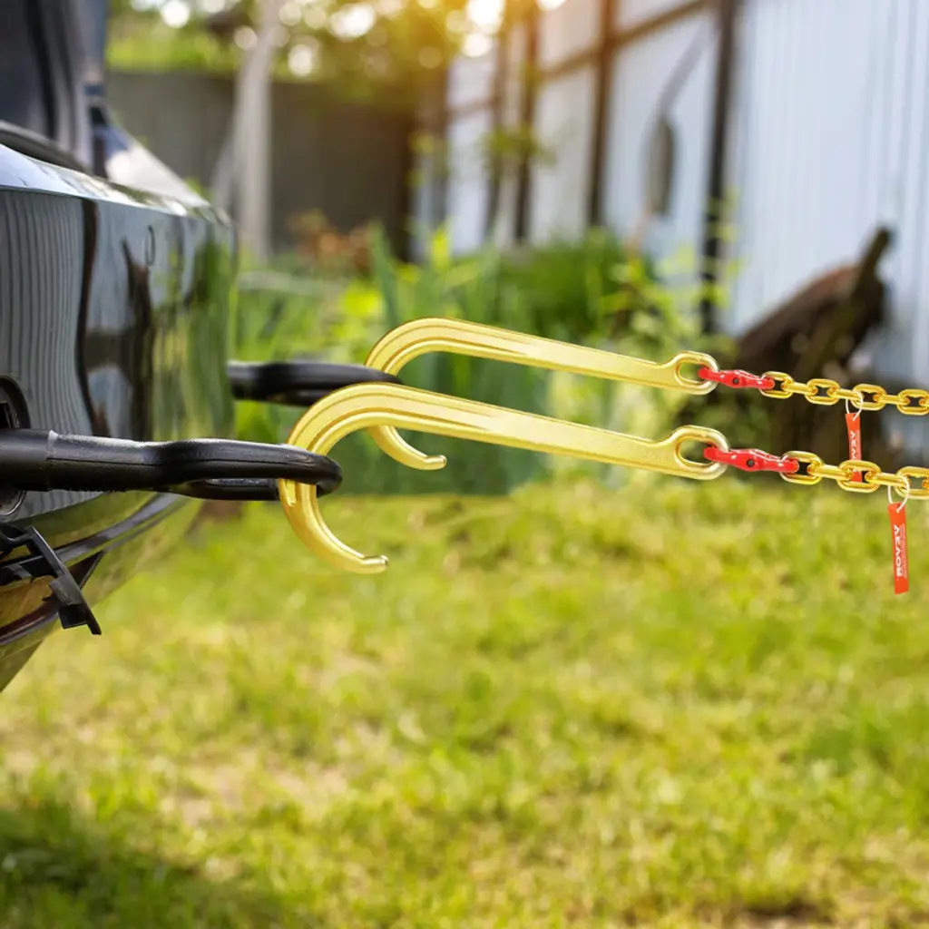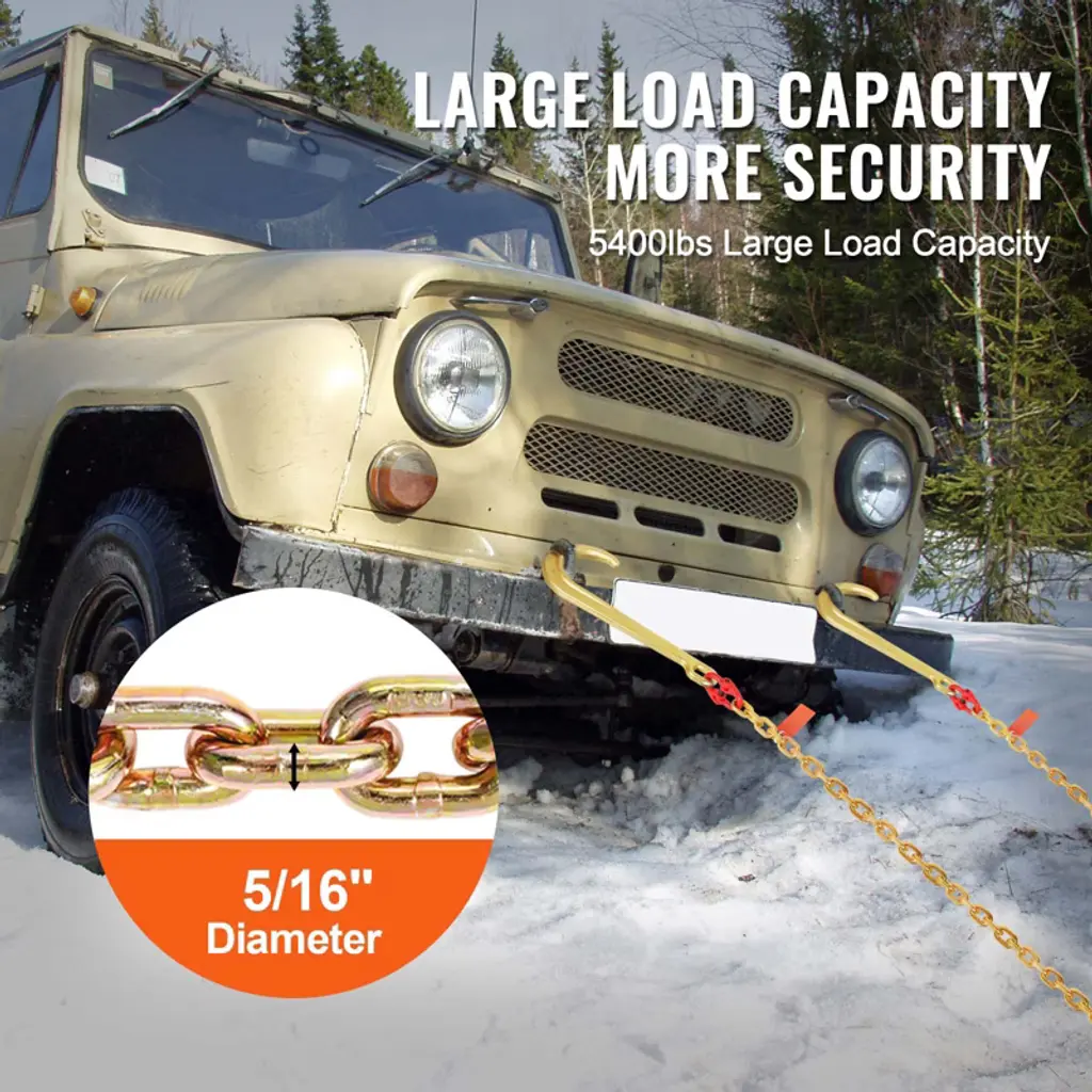 Feature: G80 Standard: This J hook chain tie-down device is Grade 80. It has outstanding tensile strength and can resist the wear and tear of heavy objects. Thanks to its high security factor, you can use our chain with confidence. Premium Material: The chain and hook are all galvanized for rust resistance and a beautiful appearance. It can remain as good as new after long-term use. Moreover, the hook is designed to fit various scenarios. 5400 lbs Load Capacity: Our J hook tow chain has a load limit of 5400 lbs. Chain Diameter: 5/16 in; Chain Length: 6 ft. Thanks to these features, you can use it with no worries. Friendly Note: The object must be hung in the center of the hook. The edge of the hook must not be hung in. The J hook towing chain shall not be twisted, inverted, or twined. Apply It Anywhere: The wrecker chain is widely used in various traction and mobile activities. It is equipped with a large J hook, R hook, T hook, small J hook, and grab hook, suitable for different vehicles and scenarios. Package Content 2 x Tow Chains 1 x D-Shackle
