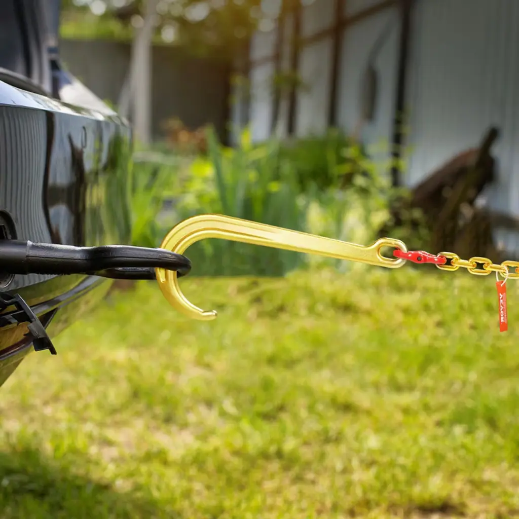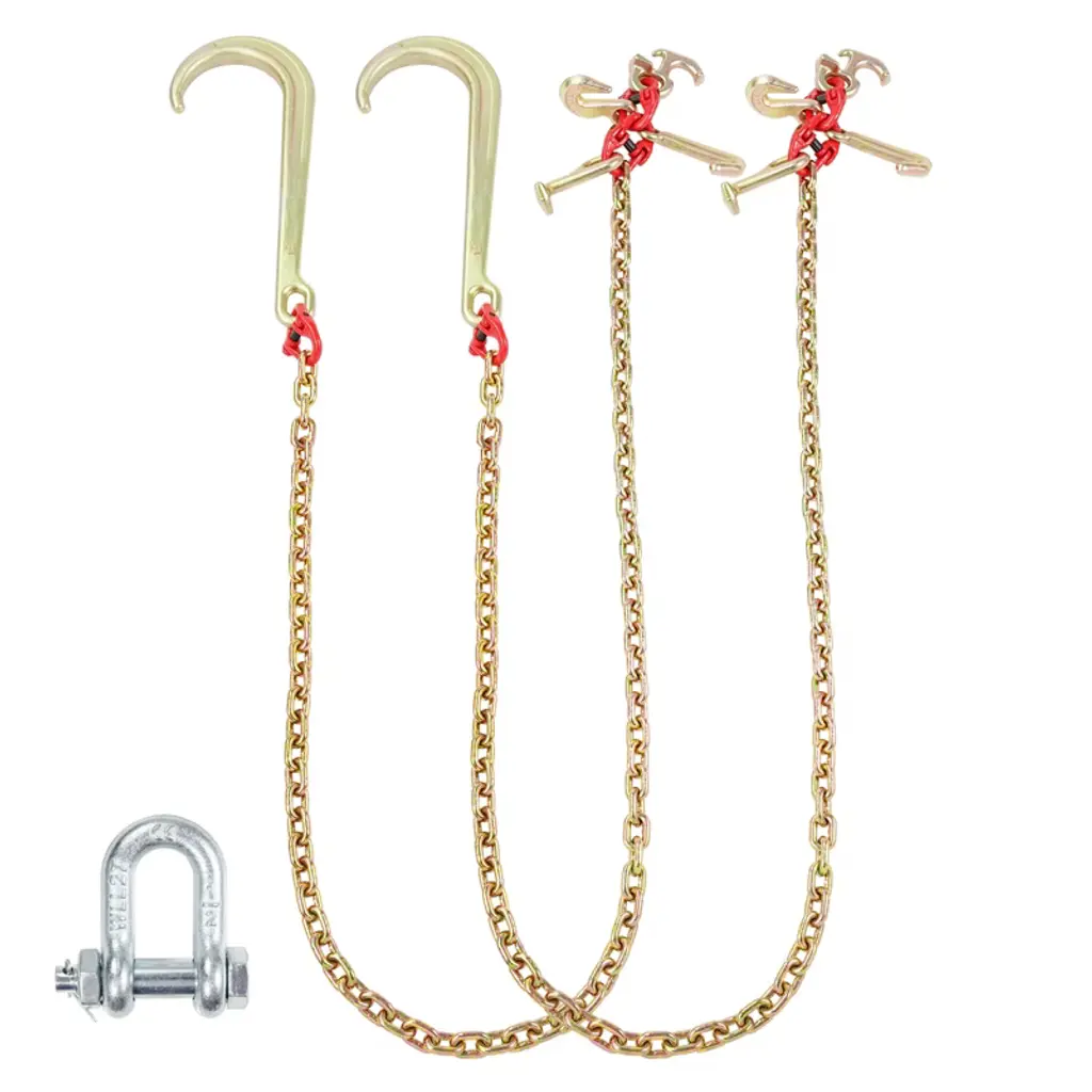 Feature: G80 Standard: This J hook chain tie-down device is Grade 80. It has outstanding tensile strength and can resist the wear and tear of heavy objects. Thanks to its high security factor, you can use our chain with confidence. Premium Material: The chain and hook are all galvanized for rust resistance and a beautiful appearance. It can remain as good as new after long-term use. Moreover, the hook is designed to fit various scenarios. 5400 lbs Load Capacity: Our J hook tow chain has a load limit of 5400 lbs. Chain Diameter: 5/16 in; Chain Length: 6 ft. Thanks to these features, you can use it with no worries. Friendly Note: The object must be hung in the center of the hook. The edge of the hook must not be hung in. The J hook towing chain shall not be twisted, inverted, or twined. Apply It Anywhere: The wrecker chain is widely used in various traction and mobile activities. It is equipped with a large J hook, R hook, T hook, small J hook, and grab hook, suitable for different vehicles and scenarios. Package Content 1 x Tow Chain 1 x D-Shackle