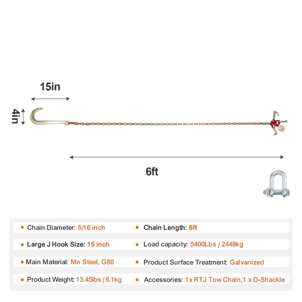 Vevor J Hook Chain, 5/16" X 6' G80 15" Long Shank J Hook Tow Chain With Rtj Cluster Hook & Grab Hook, 5400 Lbs Safe Working Load
