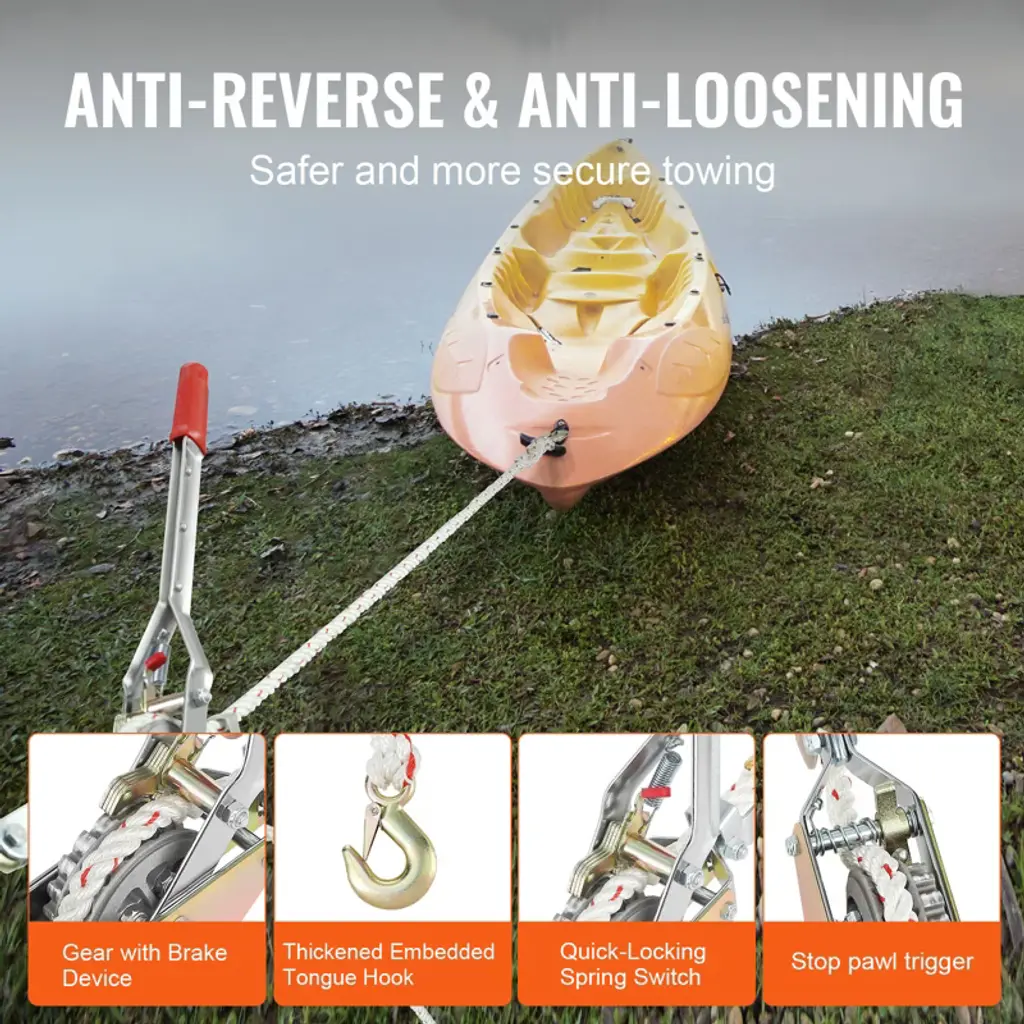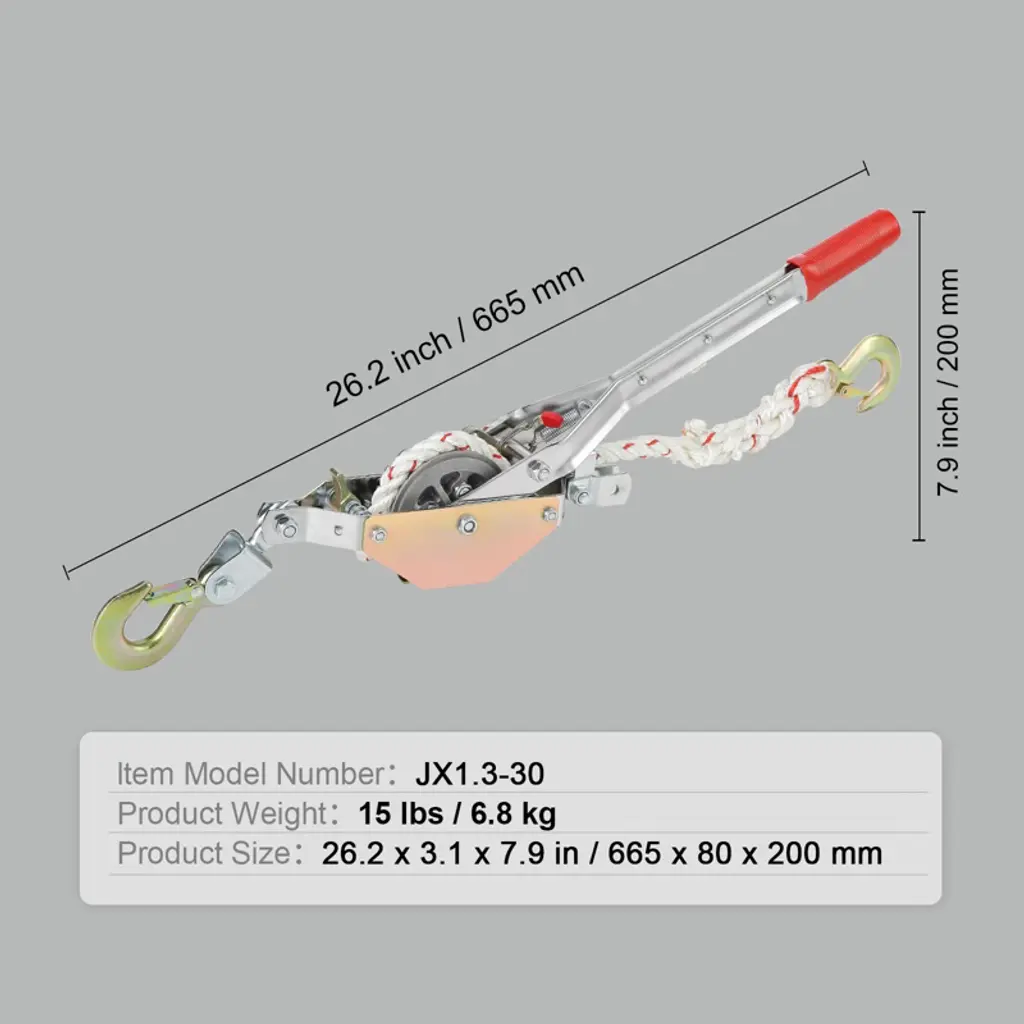 Feature: 3/4 Ton Load Capacity: Get a Grip on Tough Jobs! Our power puller packs a solid 3/4 ton (1653 lbs) of pulling muscle. It is perfect for everything from outdoor rock anchoring to lakeside boat towing and even tree stump removal. 100 ft High-Strength Polyester Rope: Say hello to our 100 ft polyester rope of this ratchet power puller. It's braided with multi-strands for strength and has a 0.6"/15 mm diameter to withstand weather and wear. So, you can pull to your heart's content, rain or shine. Integrated Gear Structure: Forget about jams or snags. Our come along puller's gear is crafted from die-cast aluminum for rust and corrosion resistance. The integrated structure allows for smooth, obstruction-free release of the unlimited length of rope and prevents foreign objects from getting stuck. No More Backtracking: With our anti-reversal gear, your polyester rope stays put. No more accidental unwinds or transport fails. Plus, the power puller tool has double locks in place for that extra peace of mind. You need to unlock both the pawl spring switch and the stop pawl trigger to release the rope. One-Hand Wonder: Tired of fumbling with complicated mechanisms? Our ratchet power puller tool has an extended handle to make pulling a breeze—just a quick back-and-forth with one hand, and you're set! Plus, our grip is rubberized for your comfort and security. Package Content 1 x Rope Puller 1 x User Manual