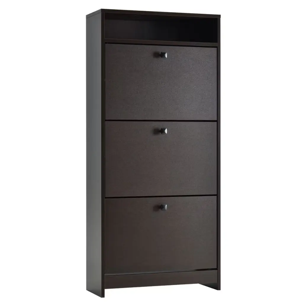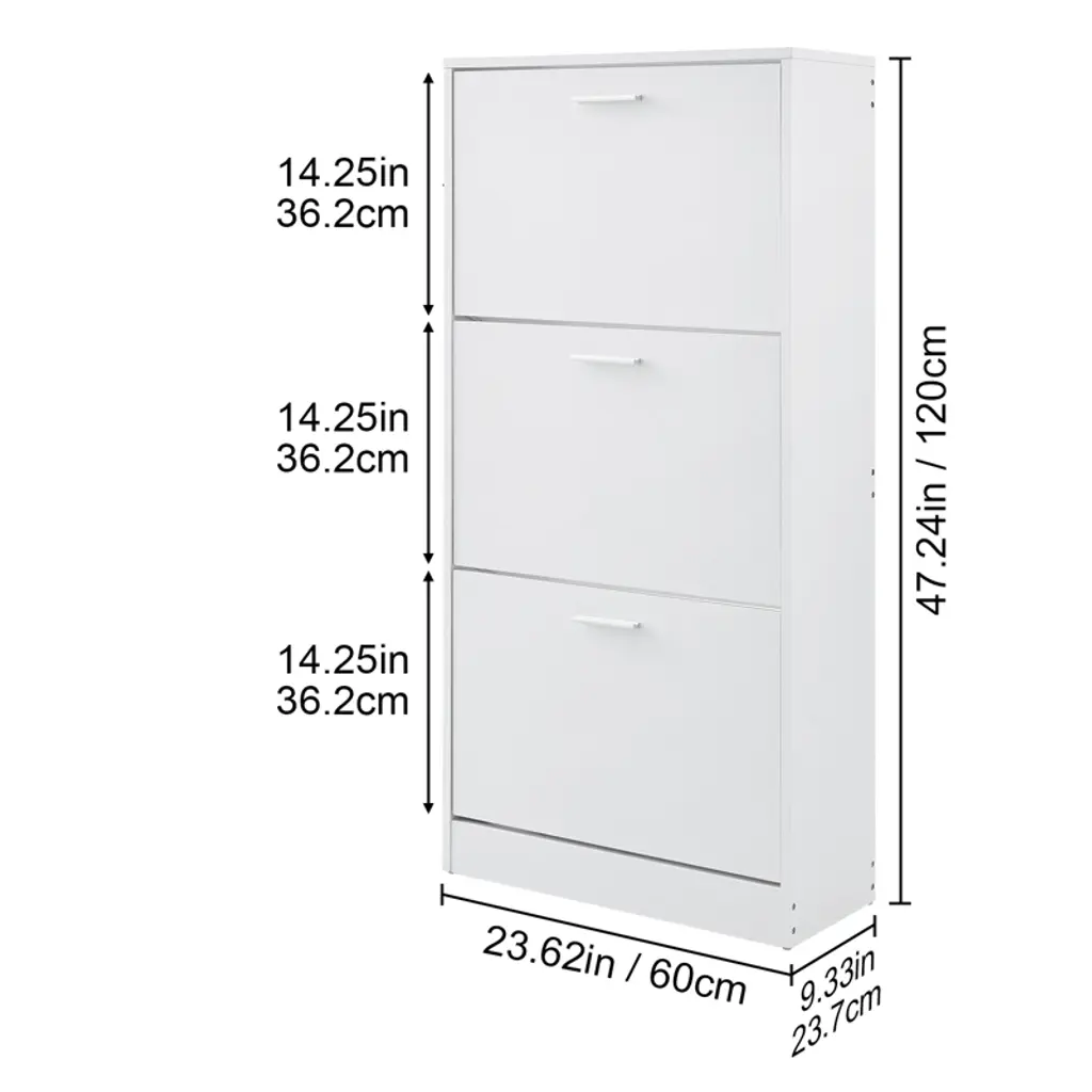 Feature: Smart Shoe Storage Solution: Utilizing innovative space-saving design, our shoe cabinet allows you to effortlessly access your shoes and neatly conceal them when not in use, keeping your entryway area tidy. Ample Storage Space: With three flip drawers, we've maximized storage space. Compared to a similar-sized shoe storage cabinet, we can accommodate more shoes of various styles, including high heels and short boots. Minimalist & Versatile Design: Featuring a classic white finish, real wood legs, and aluminum alloy handles, our shoe cabinet for entryway boasts a simple yet stylish design that matches perfectly with various home decor styles, enhancing overall coordination and aesthetics. High-Quality and Durable: Crafted from premium materials, this shoe cabinet with drawer features thickened side and back panels of 15 mm/0.59", significantly enhancing stability and durability. It can effortlessly withstand the weight of multiple pairs of shoes. Easy Assembly: The shoe organizer cabinet is designed for straightforward assembly, complete with detailed instructions and illustrations to make the process hassle-free. The anti-toppling feature ensures added stability and safety, providing you with a reliable shoe organization solution. Package Content 1 x Shoe Cabinet 1 x Set of Installation Accessories