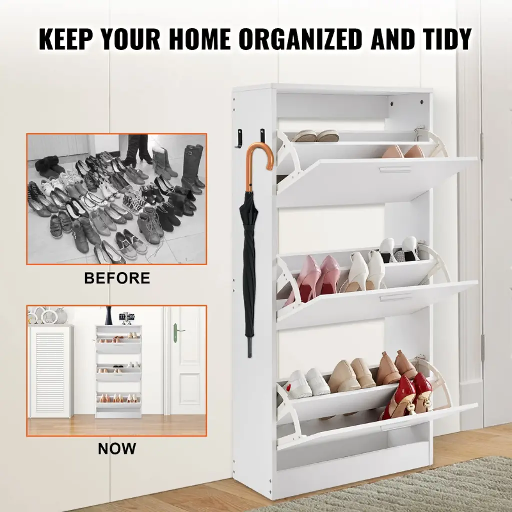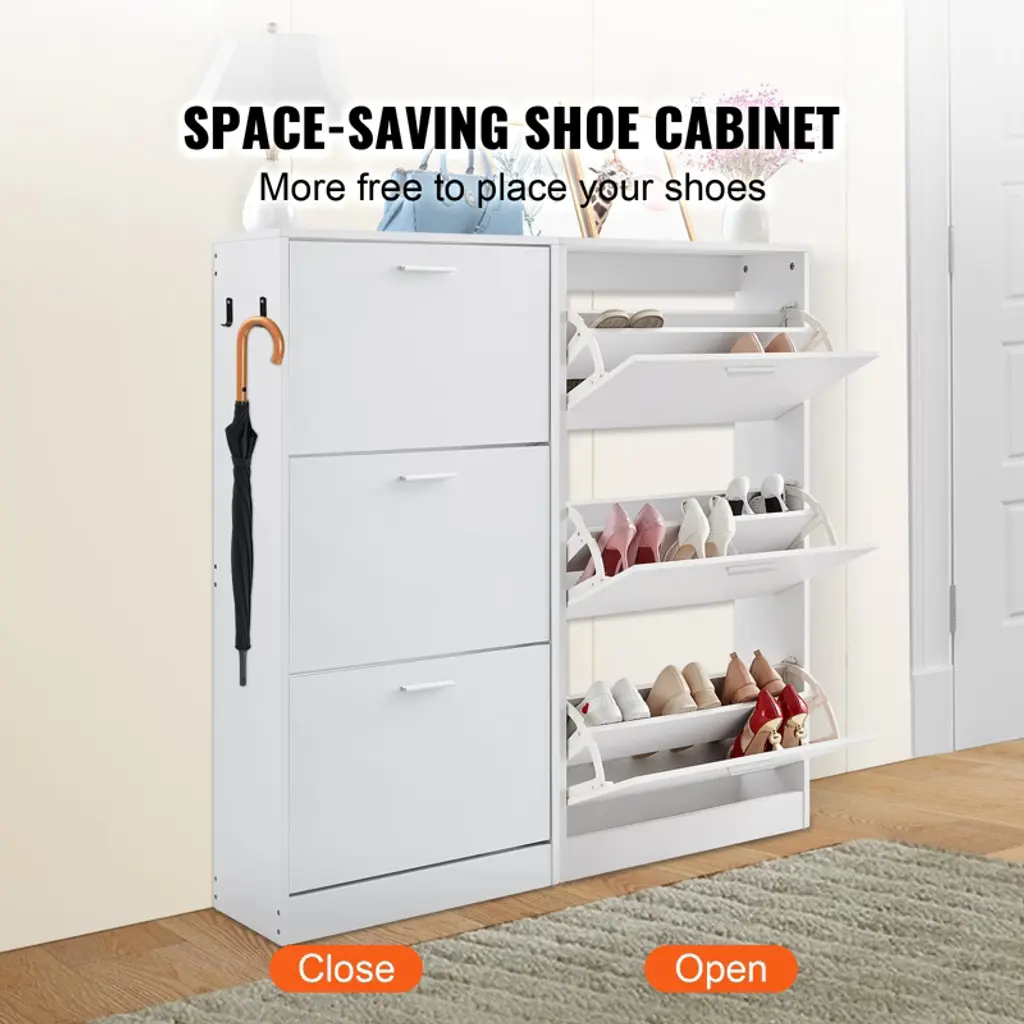 Vevor Shoe Cabinet With 3 Flip Drawers, Shoe Storage Cabinet For Entryway, Free Standing Shoe Storage Organizer With Side Hooks For Heels, White