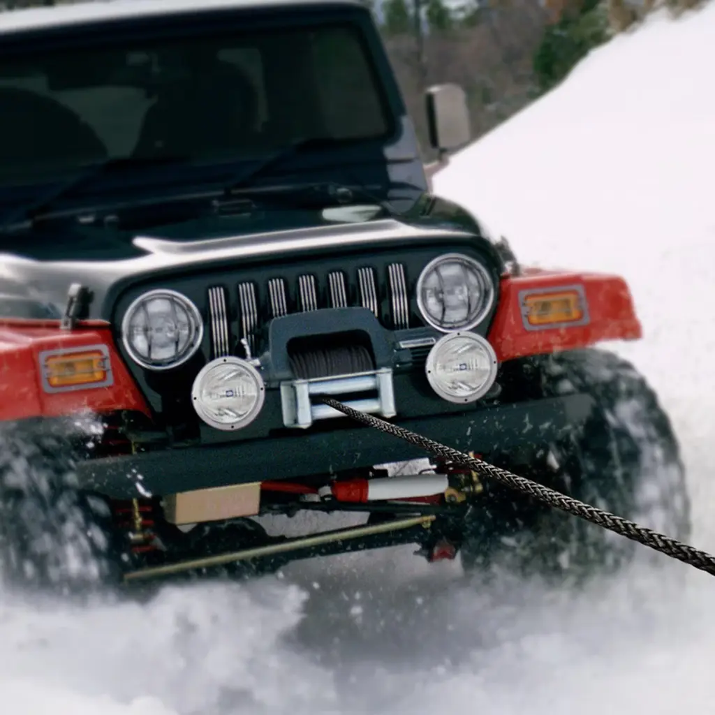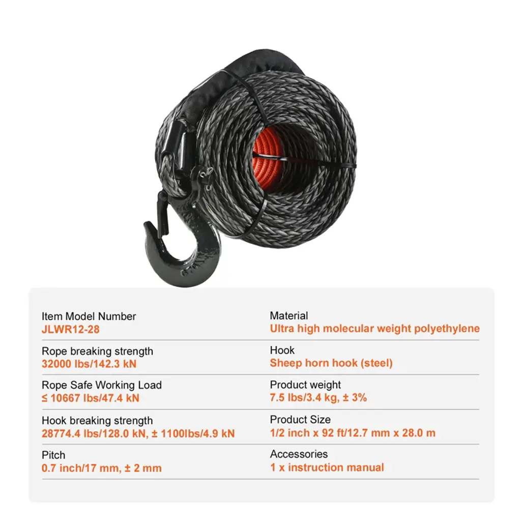 Feature: Tough 1/2" x 92' Synthetic Rope: Boasting a 32,000 lbs/142.3 kN breaking strength, it's a perfect match for vehicles up to 10,667 lbs/4,838.5 kg. Made from 12-strand high molecular polyethylene, each weave is a mere 0.7"/17 mm apart. With a PU coating for extra toughness, this rope stays light and strong. Compared to traditional steel ropes, it provides security without the snap-back. Robust Ram's Horn Hook: Forged from top-notch steel and boasting a breaking strength of 28,774.4 lbs/128.0 kN, our winch rope hook is designed to last. The powder coating fends off rust for longer wear. No more worries about heat or slips – our hook comes with a handy pull strap for a cool, secure grip every time. Unique Design at Both Ends: Double the protection, double the durability! Our synthetic winch rope starts with a 5 ft/1.5 m nylon protective sleeve to shield against rough edges, and ends with a 6 ft/1.8 m orange warning sleeve as a smart reminder of your winching limit. Simple Installation: Installation's a breeze with our 4-step setup! Just tie, thread, and go – but avoid pulling out the entire winch synthetic rope during use. To prevent the rope from being cut by sharp edges on the guide plate, we recommend ensuring at least 3/8" to 1/2" of clearance between the opening of the fairlead and the edges of the mounting plate. Suitable for Your Vehicle: Find your perfect fit with our winch line! Available in various breaking strengths to match your needs. This φ1/2" (12.7 mm) rope is a great companion for winches up to 18,000 lbs/79.5 kN (1.5 times the full load weight of the vehicle). Whether you're braving the wilds in your off-roader or lifting heavy loads in forestry, it's got your back in any situation. Package Content 1 x Winch Rope 1 x User Manual