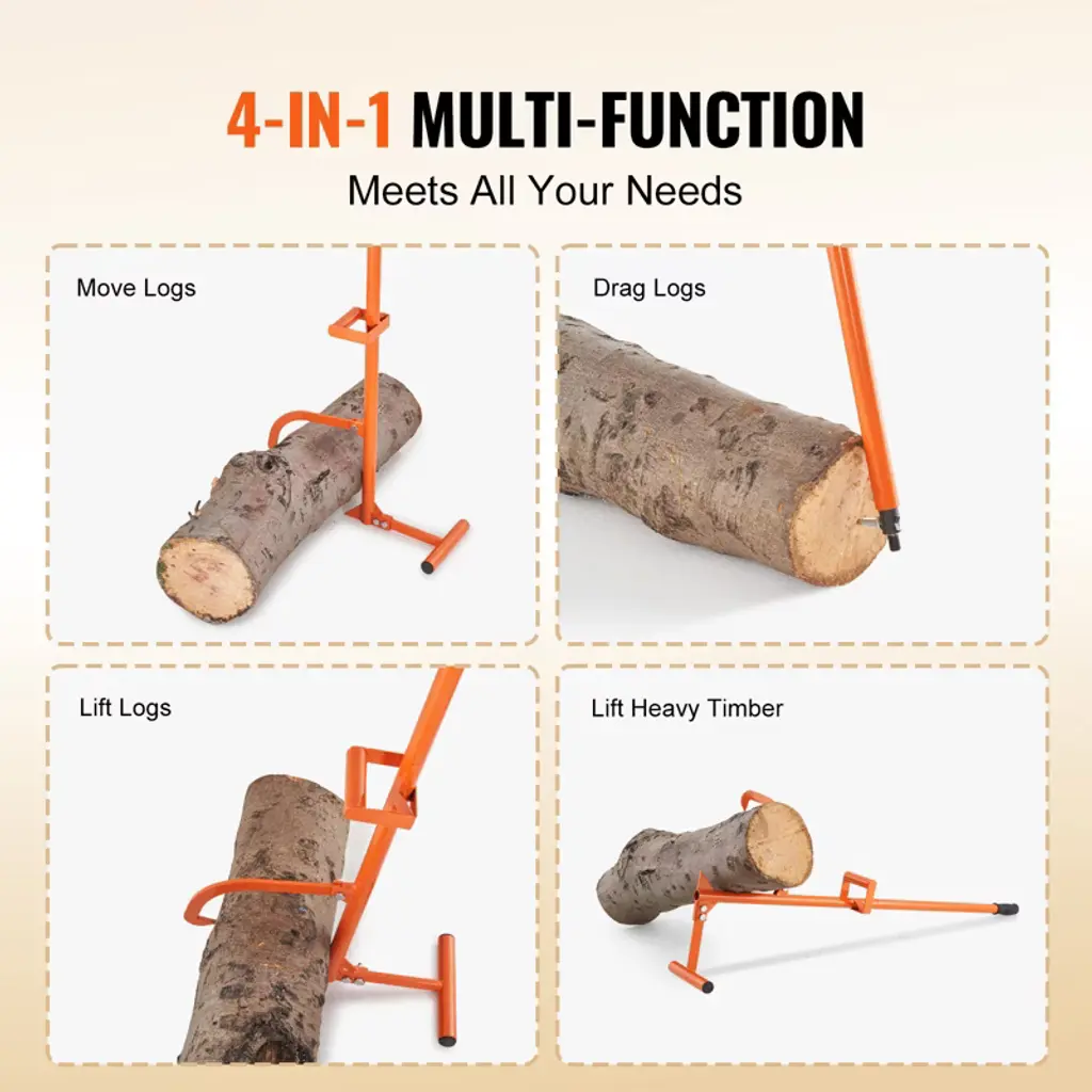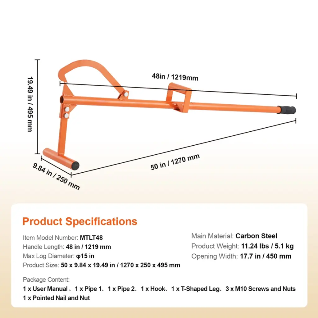 Feature: 4-in-1 Multi-Functionality: Our versatile timberjack comes with various attachments, enabling you to move, lift, drag, and handle logs effortlessly. It’s perfect for stacking, transporting, and cutting wood in forests, yards, and sawmills. Compatible with Various Log Sizes: The adjustable iron hook on the timberjack accommodates logs up to φ15", allowing you to easily lift logs of different sizes. Ergonomic Handle: The timberjack features handles measuring 48'', covered in rubber for a comfortable, secure grip. This ergonomic design reduces strain while lifting logs and helps prevent fatigue. Durable Material: Constructed from heavy-duty carbon steel with robust welds, this timberjack is built for longevity. The orange powder-coated surface offers rust and corrosion resistance, extending its service life. Easy Assembly and Use: Assembly is straightforward with screws and nuts, requiring no additional power tools, allowing for simple one-person setup. Package Content: 1 x User Manual 1 x Pipe 1 1 x Pipe 2 1 x Hook 1 x T-Shaped Leg 3 x M10 Screws and Nuts 1 x Pointed Nail and Nut