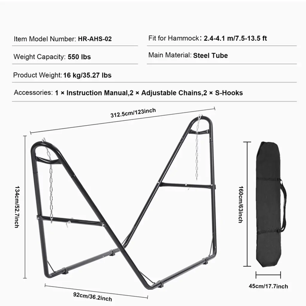 Feature: Universal Fit Stand: This hammock stand accommodates various types and sizes of hammocks, suitable for hammocks ranging from 7.5 to 13.5 feet (2.4m-4.1m) in length, providing versatile usage to meet your diverse needs. Overall dimensions: 123'' (L) x 36.2'' (W) x 52.7'' (H). Three Hanging Options: Our hammock frame allows you to adjust the hammock's tightness and height to your preference. It comes with two adjustable chains that make it easy to set the desired length. Note: Hammock not included. 550 lbs Capacity & Stability: Reinforced with dual rods on each side and a rod between each leg and the bottom tube, forming a robust double rods and triangular structure capable of supporting up to 550 lbs. The non-slip pads of the portable hammock stand ensure stability and safety, especially when children climb in and out. Powder-Coated Steel Tube: Our stand for hammock features a double-layer powder-coated surface for rust resistance, allowing for all-weather use. To extend product lifespan, it's recommended to wipe it down after rain and store promptly after use. Easy Assembly & Portability: The quick-release buckle design allows for tool-free assembly, completing the setup in about 10 minutes. Our steel hammock stand comes with a 600D Oxford fabric storage bag for easy movement and flexible use in your garden, by the pool, or on the balcony. Package Content 1 x Hammock Stand 1 x Instruction Manual 2 x Adjustable Chains 2 x S-Hooks