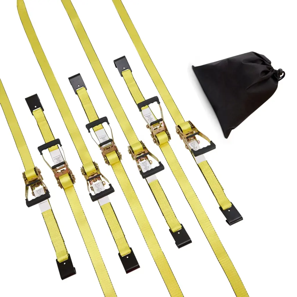 Feature: Hold On Tight: With a whopping load capacity of 6,000 pounds and a breaking strength of 18,000 pounds, our winch straps have your back for those heavy-duty towing adventures. They are ideal for any occasion ranging from cargo hauling to vehicle towing and tree removal. Crafted to Last: We're talking premium polyester with a special coating that's both stylish and strong. These are not your average truck straps; they are a blend of durability, stability, and reliability, providing lifetime performance. Ready to endure all those journeys ahead! Snap & Go with Flat Hook: One end of the flatbed strap is equipped with a black flat hook. Slide our sleek flat hook onto any vehicle with bed rails. Oh, and did we mention it? It laughs in the face of rain and sunlight, thanks to its resistant coating. So Simple, So Neat: Forget those complicated swan-neck hooks; the flat hook on this trailer strap is far more convenient. Wrap it around the towing vehicle's fixed pocket or bed rails, and then secure the other end to the side of the trailer. After use, it's simple to store without taking up excessive space. One Strap, So Many Uses: From steel plates and production crates to the new household appliances you've been eyeing, these flatbed trailer straps fit the bill. They are perfect for pickup trucks, enclosed vans, and even at your favorite packaging factory. Package Content 4 x Winch Straps 1 x User Manual