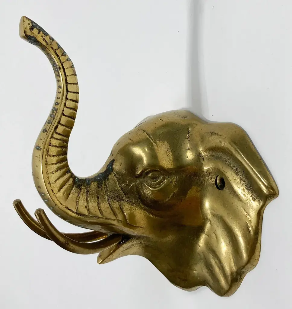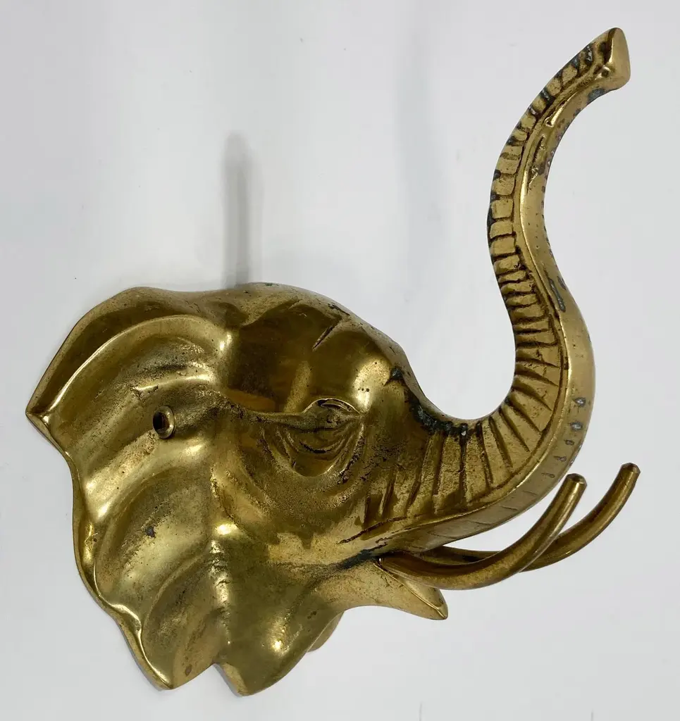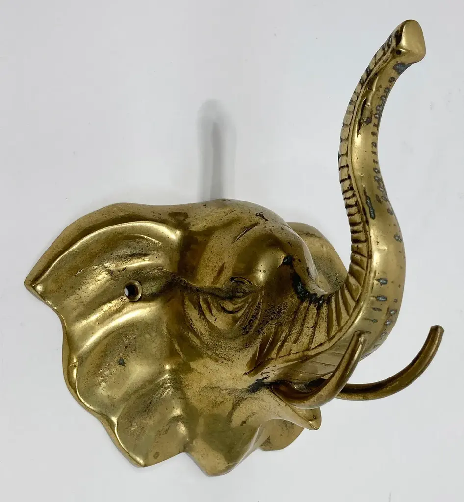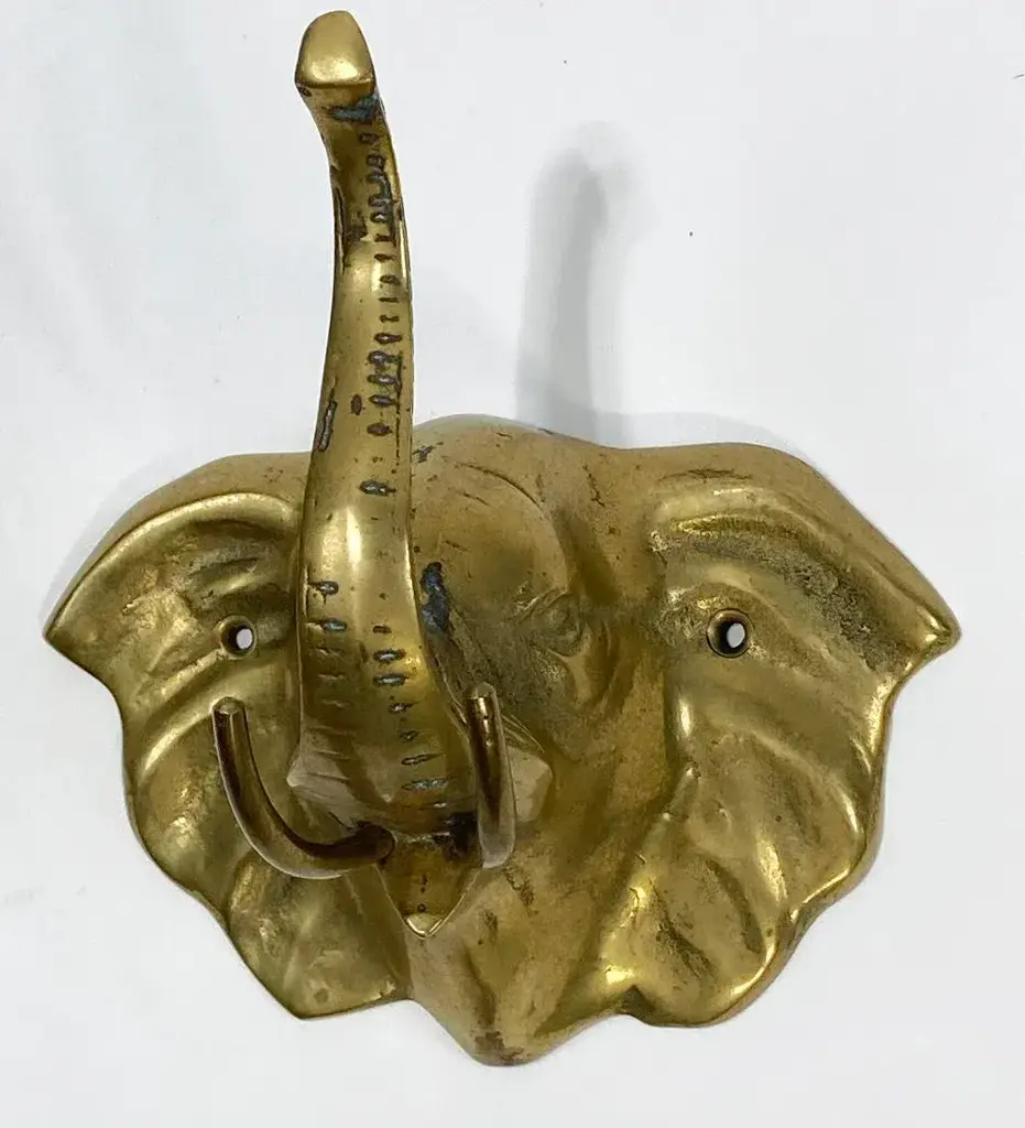 Charming vintage brass elephant wall hook with 'trunk up' for good luck. No maker's mark. Hardware screws to attach to wall not included. Patina.