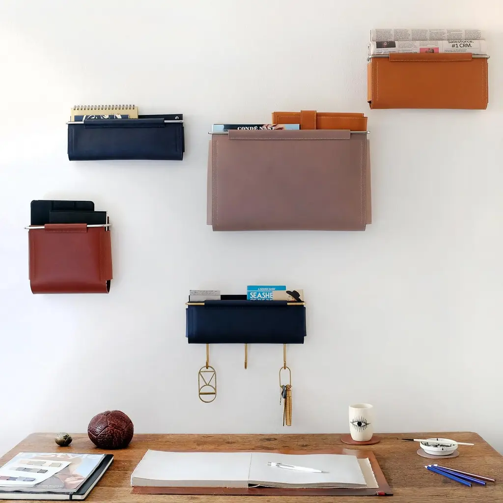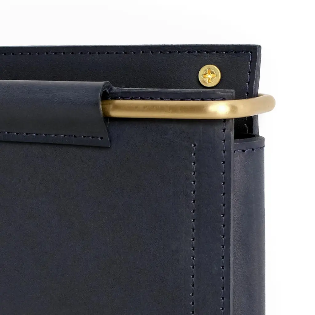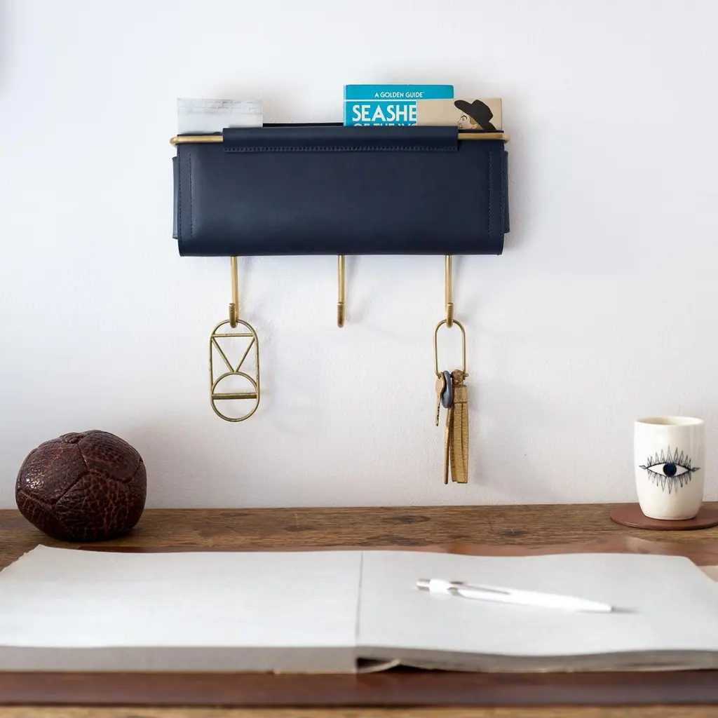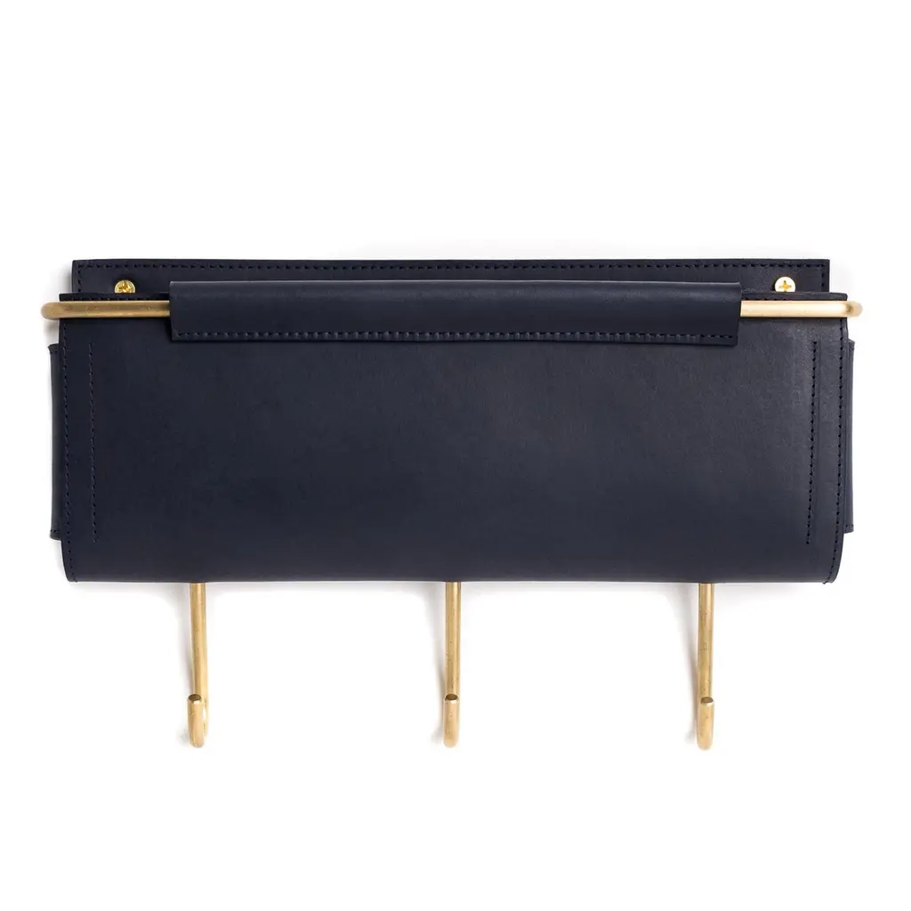Combining style with modern utility Ledger Wall Pockets are a sleek and functional storage solution designed to organize and declutter. Crafted from smooth vegtan leather and a sturdy brass frame, they offer a minimal aesthetic while providing an alternative and practical way to store mail, paperwork, magazines, books and devices. Three hooks affixed to the bottom of the pocket offer convenience for hanging keys, leashes, and other everyday essentials. Install these wall pockets individually or arrange them to enhance the look of your living or workspace. Handcrafted to order in Long Island, NY. Color/Materials: Navy Ojai Leather and Brushed Brass - Ojai leather is a protected vegtan.Dimensions: 12"L x 1.5"W x 5"H (hooks add an additional 3" to the pocket height) Installation: Two wall-screws mount the metal support frame to the wall with standard anchors and hold these structured pockets in place. Style No. IPO1703-12x1.5x5-x3-V03BS Production time is approximately 8 weeks. Rush fee is 25%.