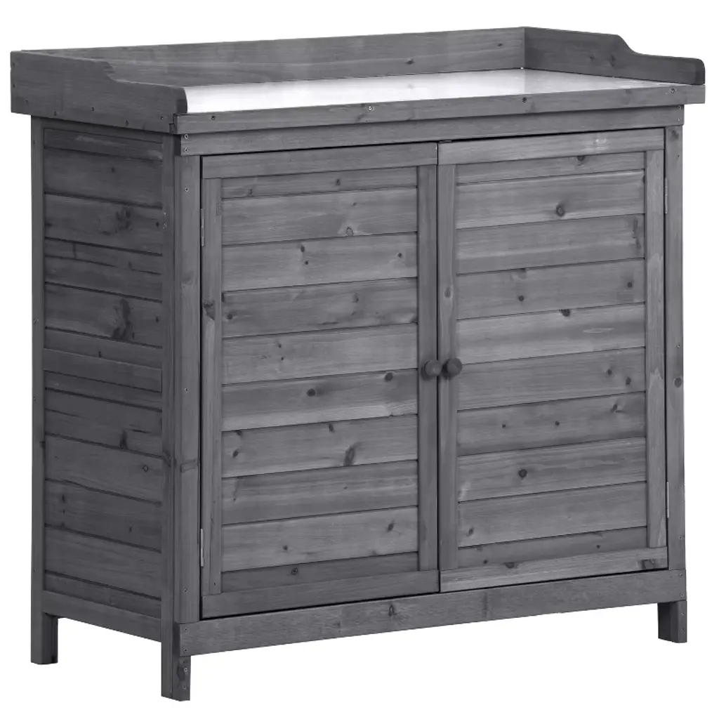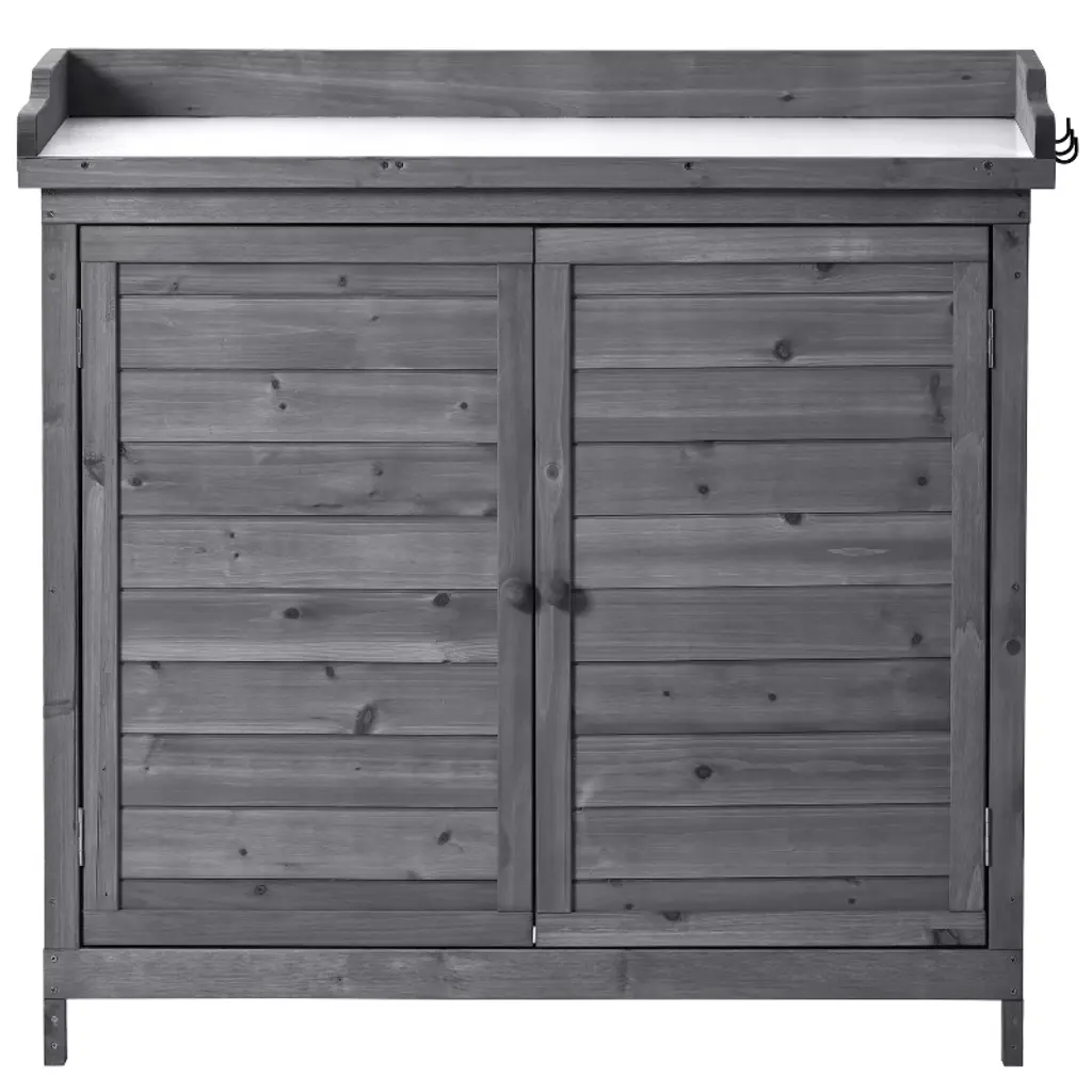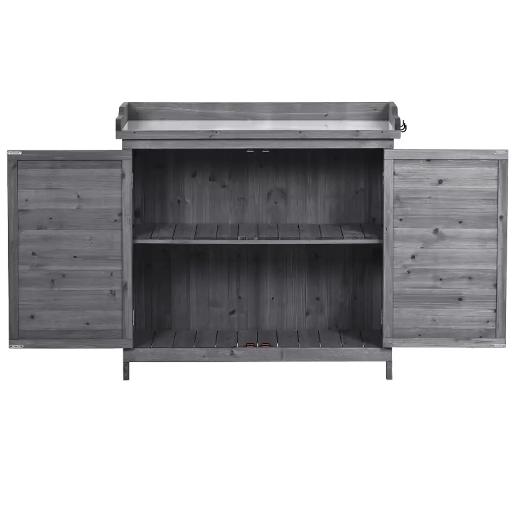 Get ready for a flourishing garden with this rustic outdoor potting bench table, crafted from 100% fir wood for exceptional durability and strength. Designed to provide a spacious and organized workspace, it features a galvanized zinc tabletop that is waterproof and easy to clean — perfect for messy gardening tasks. With its stable structure, the tabletop supports up to 44 lbs, while the cabinet shelves hold up to 22 lbs. The 2-tier storage cabinet offers ample space for pots, soil bags, and tools, keeping everything within easy reach. Thoughtfully equipped with removable shelves for customizable storage and three convenient side hooks, this potting bench ensures your gardening essentials are always handy. Its versatile design makes it not only an excellent gardening station but also a functional buffet table for outdoor gatherings. Enjoy both practicality and rustic charm in your garden, patio, or deck.