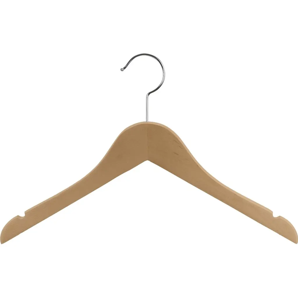 Wooden Junior Top Hanger With Natural Finish, Flat 14 Inch Space Saving Wood Hangers With Notches & Chrome Swivel Hook - Box Of 50