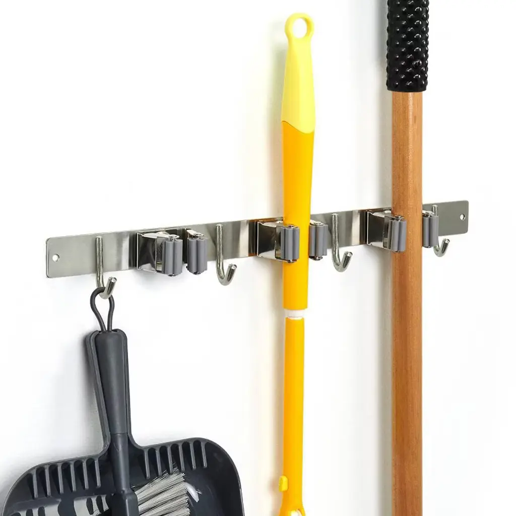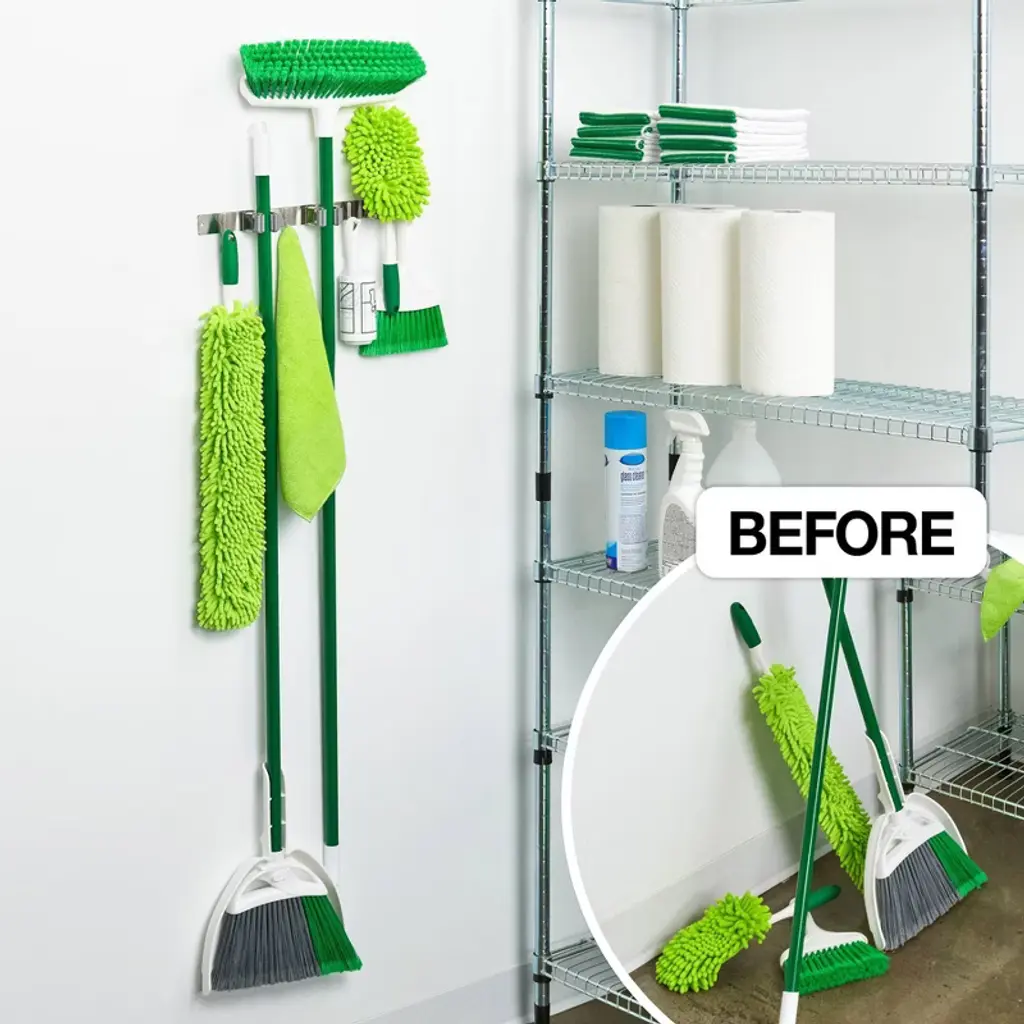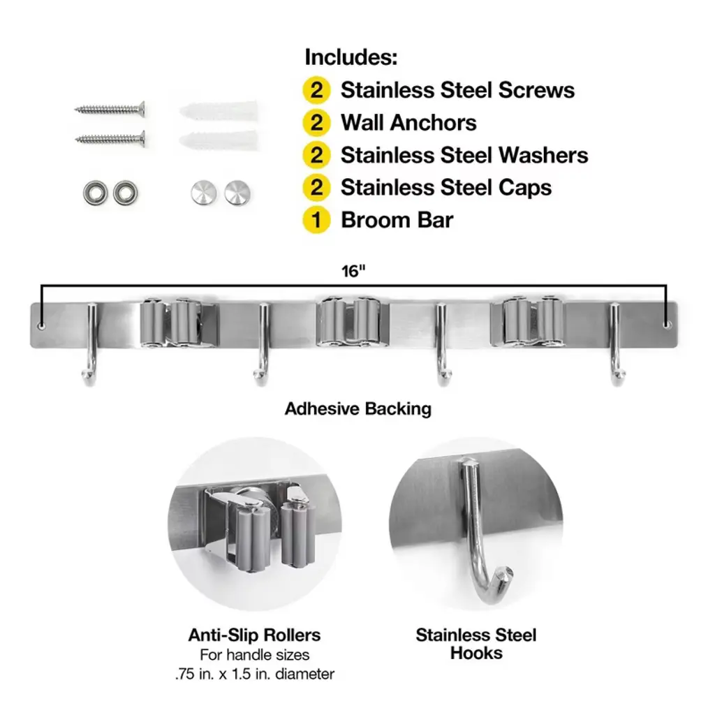 Cheers, to a clutter-free closet. Your cleaning supplies want to go to a place where everybody knows their name, and they're always glad they came. With both broom holders and hooks, the Broom Bar is the perfect happy hour spot for your brooms, mops, dustpans, rakes, shovels and more!To make it easy, there are 2 mounting options- peel & stick adhesive or screws and wall anchors (all included).