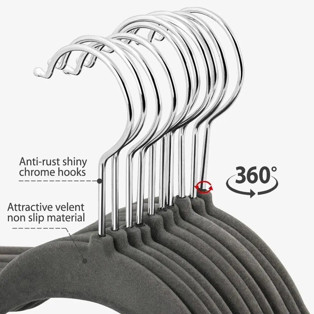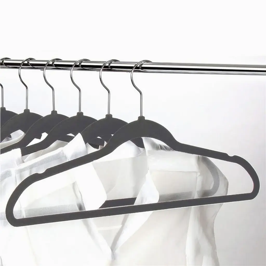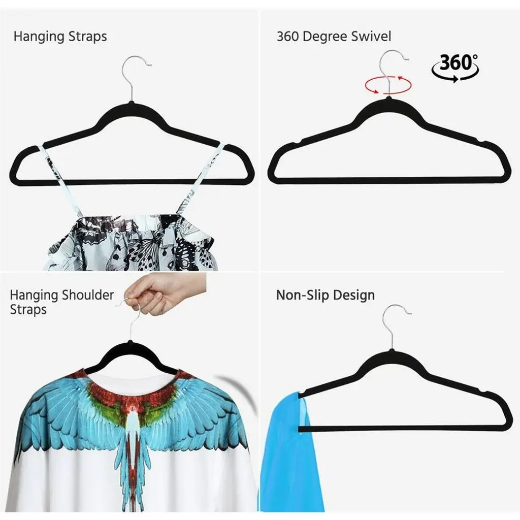 The flocking surface will help keep your clothes in place and doesn't rub off onto your clothes. Durable and non-slip velvet hangers are perfect to hold your pants, ties, skirts, scarves and light fabric clothing. 360° swivel hooks make it easy to organize your clothes. Its space saving design helps make full use of the storage space in your closet. Features: 1. 【Sturdy Non-slip Hangers】Made of velvet flocked plastic hanger and chrome finished metal hook, our sturdy hanger is capable of holding up to 11lb/5kg, providing strong cloth storage solution to your summer clothes or winter coat.2. 【Anti-slip Features】The velvet flocking on the hangers increases friction between hanger and clothes and gently grips garments from slipping off.3. 【Thoughtful Designs】Contoured shoulder line helps preserve clothes shape and avoid creases. The notches help keep straps in place, a special design for your slip dress and camisoles.4. 【Notched Arms】Features notched arms, these velvet hangers can hold small straps and keep blouses in place.5. 【Contoured Shoulder Line】For some lightweight fabrics, plastic and thin metal hangers are not ideal cause they may stretch out fabrics as they bend. Our hangers with contoured should line can preserve clothes shape.6. 【360° Swivel Hook】The 360-degree swivel hook fits standard closet rods and meets different hanging requirements.7. 【Space-saving Design】Ultra thin design maximizes your closet space by cutting down 50% hanging space comparing with normal hangers. Make full use of your your closet.8. 【Versatile Hangers】No matter for domestic use or for commercial use, this hanger set is an ideal and nice-looking choice for your needs.9. 【Not Just for Clothes】No more hurry workday morning. You only need one velvet hanger to keep your suits handy and tidy. The horizontal bar help hold your trousers/long skirts neat and without creases.10. 【Practical Hanger Set】100 practical velvet non-slip hangers featuring metallic swivel hooks and notched shoulders help you utilize your closet easily and quickly.11. 【Extra Hanging Space】The upper tie bar design collects your accessories like ties, bowknots and scarves Specifications: Material: Premium Plastic, Zinc Alloy, Velvet Dimension (Approx.): 17.72 × 9.29 × 0.2'' (L×W×Thickness) Load Capacity (Each Hanger): 1 5 kg G.W. (Approx.):16.4 lb Quantity: 100PCS Note: 1. This hanger is for dry clothes only. 2. In order to get rid of floating bristles on the surface, please use damp cloth to wipe it or rinse in clean water. When it is dry, you can keep them in your closet.