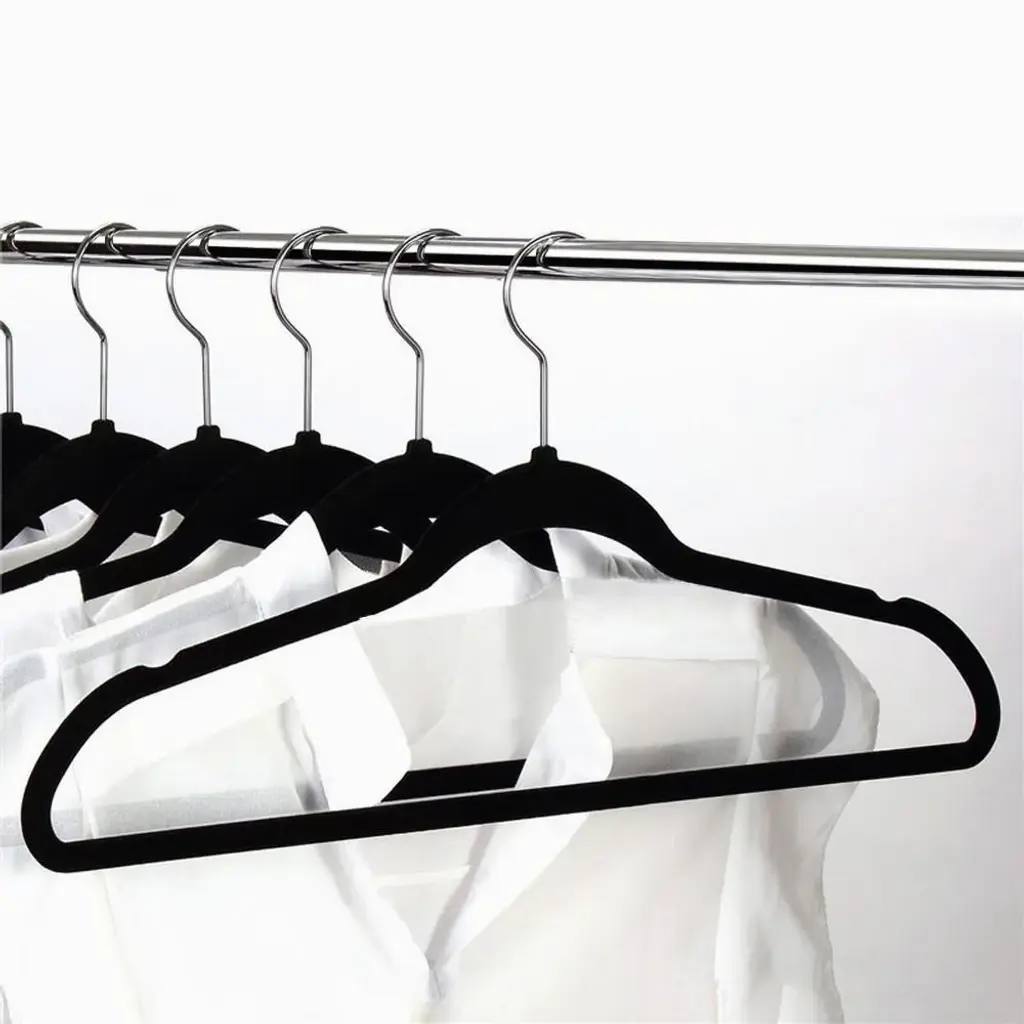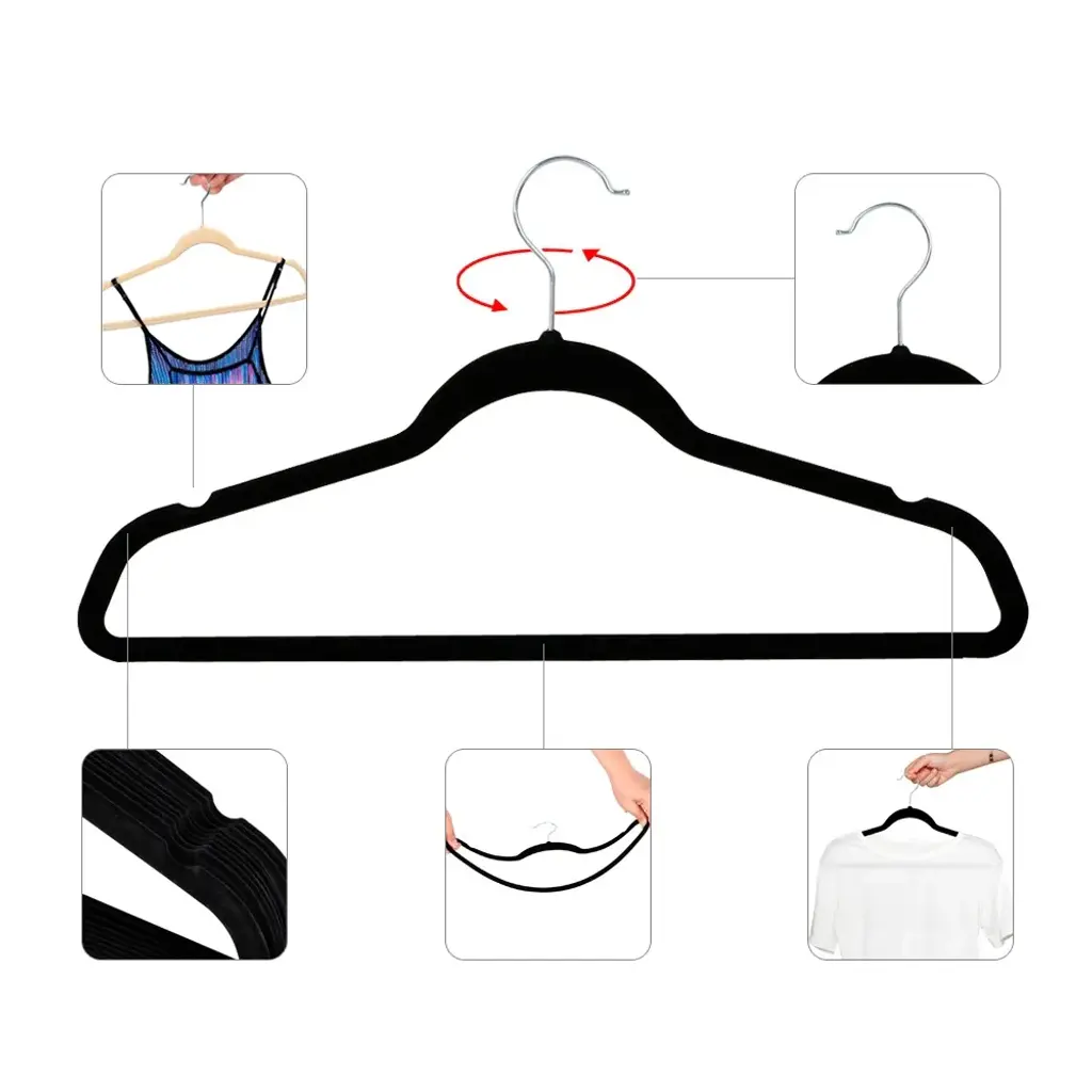The flocking surface will help keep your clothes in place and doesn't rub off onto your clothes. Durable and non-slip velvet hangers are perfect to hold your pants, ties, skirts, scarves and light fabric clothing. 360° swivel hooks make it easy to organize your clothes. Its space saving design helps make full use of the storage space in your closet. Features: 1. 【Sturdy Non-slip Hangers】Made of velvet flocked plastic hanger and chrome finished metal hook, our sturdy hanger is capable of holding up to 11lb/5kg, providing strong cloth storage solution to your summer clothes or winter coat.2. 【Anti-slip Features】The velvet flocking on the hangers increases friction between hanger and clothes and gently grips garments from slipping off.3. 【Thoughtful Designs】Contoured shoulder line helps preserve clothes shape and avoid creases. The notches help keep straps in place, a special design for your slip dress and camisoles.4. 【Notched Arms】Features notched arms, these velvet hangers can hold small straps and keep blouses in place.5. 【Contoured Shoulder Line】For some lightweight fabrics, plastic and thin metal hangers are not ideal cause they may stretch out fabrics as they bend. Our hangers with contoured should line can preserve clothes shape.6. 【360° Swivel Hook】The 360-degree swivel hook fits standard closet rods and meets different hanging requirements.7. 【Space-saving Design】Ultra thin design maximizes your closet space by cutting down 50% hanging space comparing with normal hangers. Make full use of your your closet.8. 【Versatile Hangers】No matter for domestic use or for commercial use, this hanger set is an ideal and nice-looking choice for your needs.9. 【Not Just for Clothes】No more hurry workday morning. You only need one velvet hanger to keep your suits handy and tidy. The horizontal bar help hold your trousers/long skirts neat and without creases.10. 【Practical Hanger Set】100 practical velvet non-slip hangers featuring metallic swivel hooks and notched shoulders help you utilize your closet easily and quickly.11. 【Extra Hanging Space】The upper tie bar design collects your accessories like ties, bowknots and scarves Specifications: Material: Premium Plastic, Zinc Alloy, Velvet Dimension (Approx.): 17.72 × 9.29 × 0.2'' (L×W×Thickness) Load Capacity (Each Hanger): 1 5 kg G.W. (Approx.):16.4 lb Quantity: 100PCS Note: 1. This hanger is for dry clothes only. 2. In order to get rid of floating bristles on the surface, please use damp cloth to wipe it or rinse in clean water. When it is dry, you can keep them in your closet.