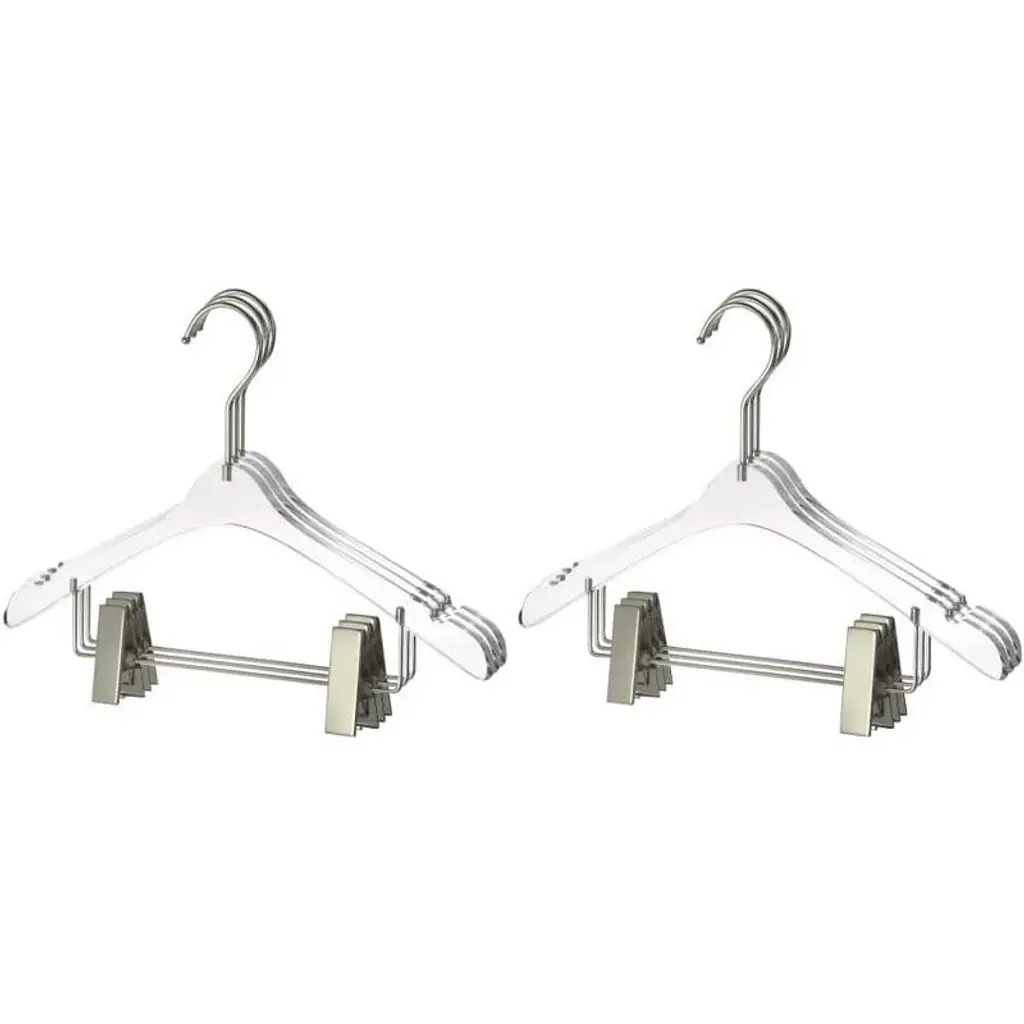 "SLEEK & MODERN - Our Acrylic Hangers are an essential for every closet. They're made of crystal-clear acrylic for a luxurious look and feel. HANGER SHAPE - Flat body can hold all shapes and styles of coats, skirts, trousers and dresses to keep your clothing in their perfect shape. DESIGNED FOR WARDROBE AND CLOSETS - These are the best organization accessories to make your closet look better and tidy. The thick clear acrylic construction and unique design ensures static hold of your clothes. PACKAGE INCLUDES - Set of 6, 12, or 32 Acrylic/Lucite hangers. PERFECT STANDARD DIMENSIONS - Men's hanger measures 17.3 in. Length, Kid's hanger measures 14 in. Length, Baby's hanger measures 12 in. Length."
