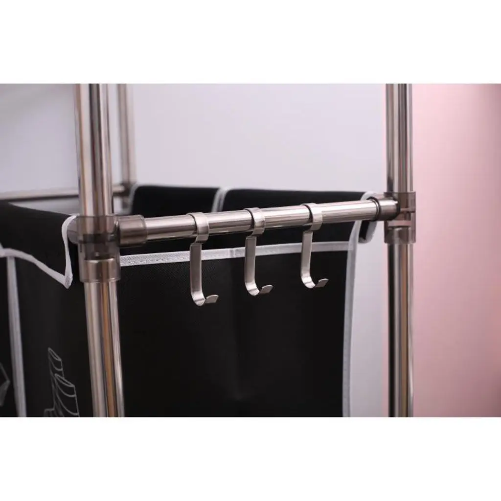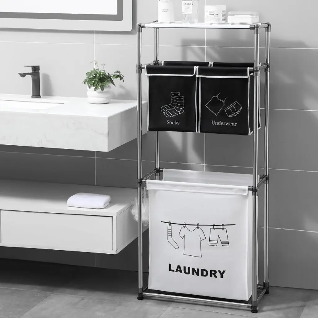 Transform your laundry organization with the Yukimo 3 Tier Laundry Hamper, a comprehensive sorting system designed for modern households. This innovative laundry sorter features a spacious three-tier design that combines practical bag storage with convenient shelves and hooks, creating an all-in-one solution for your laundry needs. With dimensions of 23.20 inches in length, 11.40 inches in width, and 53.50 inches in height, this hamper offers substantial capacity while maintaining a space-efficient footprint. The system includes three removable Oxford bags with reinforced bottom plates that prevent sagging and maintain shape, providing 100L total capacity for sorting lights, darks, and specialty items. Four heavy-duty TPR casters with two locking wheels ensure smooth mobility between rooms while maintaining stability during use. Constructed from waterproof MDF board and a sturdy iron frame, this laundry hamper combines durability with aesthetic appeal that complements any home decor style. Additional features include wide shelves perfect for storing laundry detergent, fabric softeners, and toiletries, plus three convenient metal hooks for hanging towels, hats, or clothing accessories. Simple assembly with clear instructions means you can quickly set up this organizational system and begin streamlining your laundry routine immediately. The Yukimo 3 Tier Laundry Hamper provides an efficient and stylish solution for keeping your laundry sorted, accessible, and neatly organized in bedrooms, bathrooms, or laundry rooms.