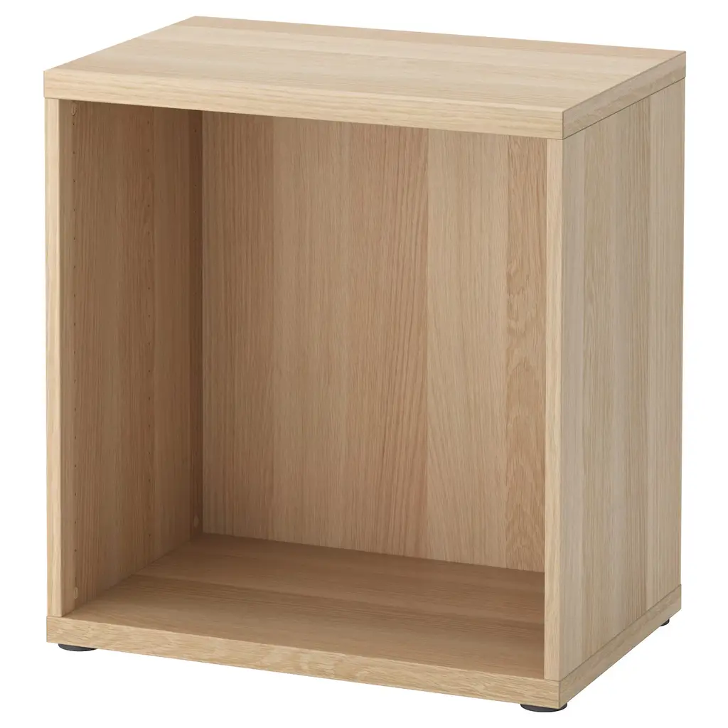 BESTÅ Frame - white stained oak effect 23 5/8x15 3/4x25 1/4 ". You can choose to stand the frame on the floor or mount it on the wall to free up floor space. If you want to organize inside you can complement with BESTÅ interior fittings. Steady on uneven floors, thanks to the adjustable feet.