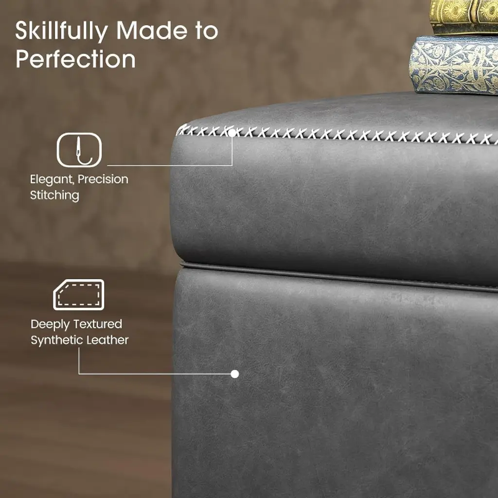 Elevate your living space with the 43.5" Faux Leather Storage Ottoman Bench—a stylish and functional piece designed for everyday comfort and convenience. Upholstered in sleek synthetic leather with refined stitching, this mid-century modern bench serves as both elegant seating and a practical storage solution. The spacious interior holds up to 25 gallons of household items, while dual safety hinges ensure smooth and secure opening. Whether placed at the foot of your bed, in the entryway, or in the living room, this ottoman offers reliable support with a 670 lb weight capacity. Easy to assemble, with only the legs requiring installation, it’s a smart choice for adding charm, comfort, and order to your home.