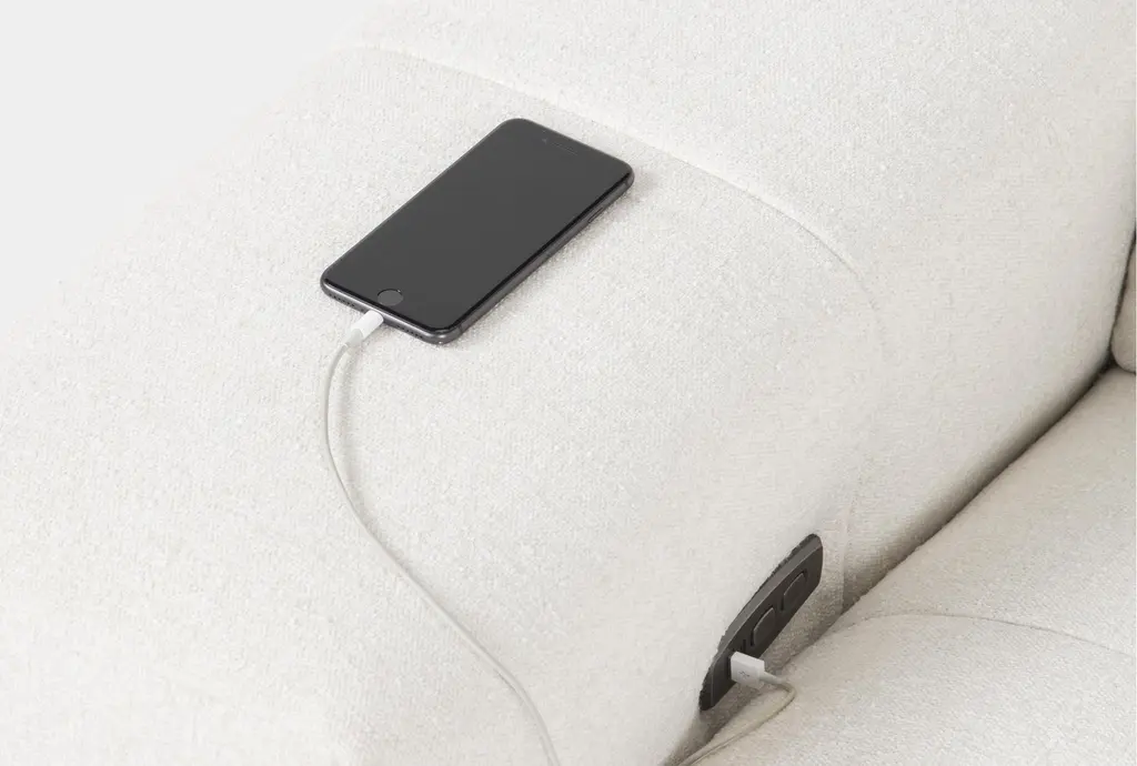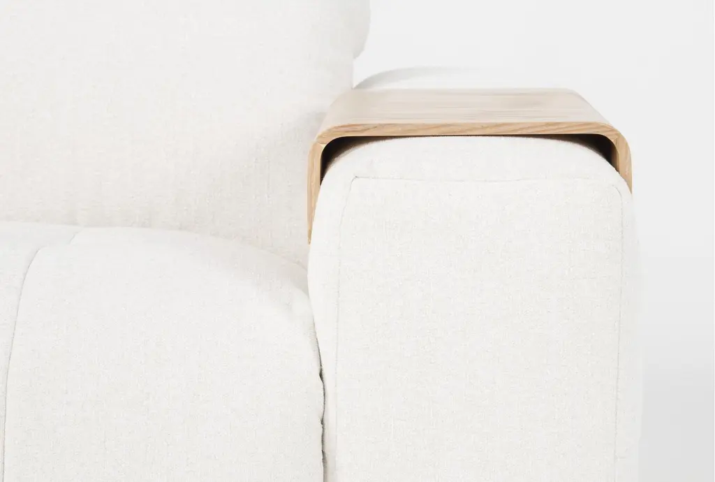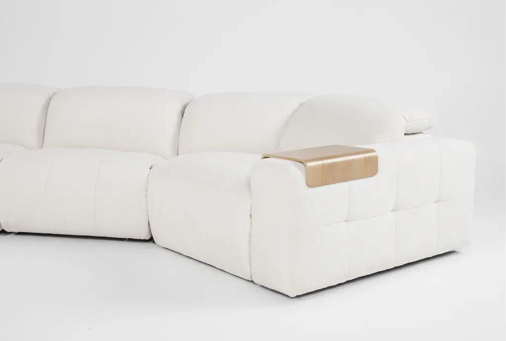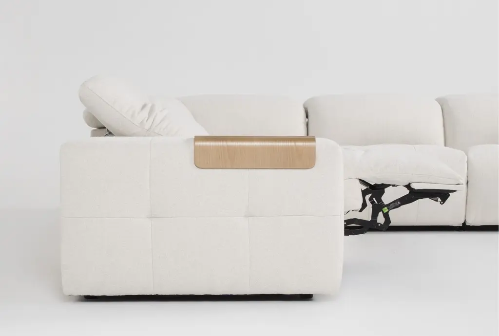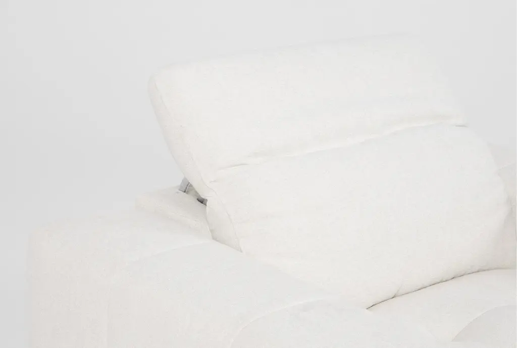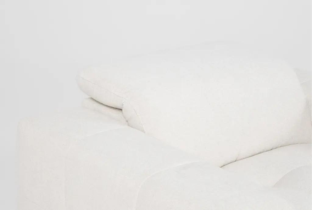 The Amallo Ivory 6 Piece Power Reclining Sectional with Right Arm Facing Cuddler Chaise & Bunching Storage Ottoman Set is a perfect addition to any modern living room. This sectional offers a comfortable and stylish seating solution with its soft, white fabric and adjustable headrests. The set includes a right arm facing cuddler chaise and a bunching storage ottoman, providing both relaxation and functionality.