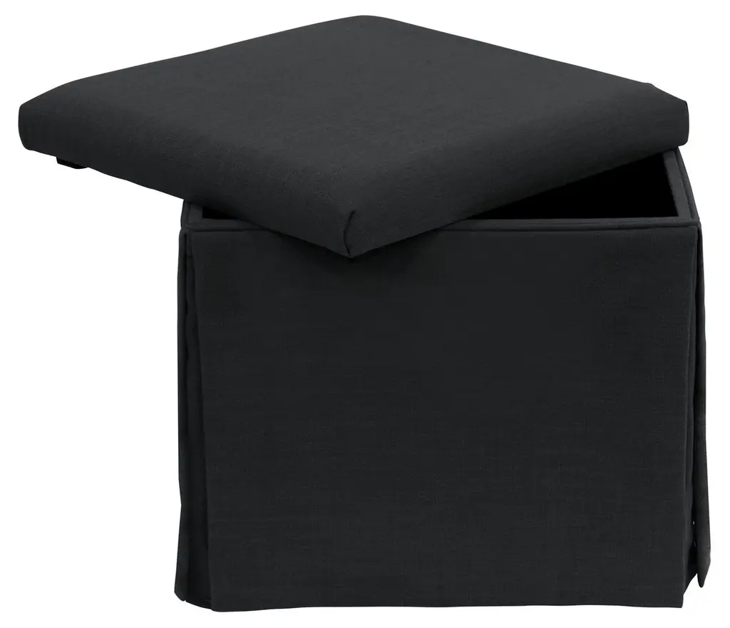 This skirted ottoman is designed with a sturdy pine frame and blended upholstery in a light blue hue. The top is generously padded for maximum comfort, and it opens to reveal always-welcome storage space. Handcrafted in the USA.