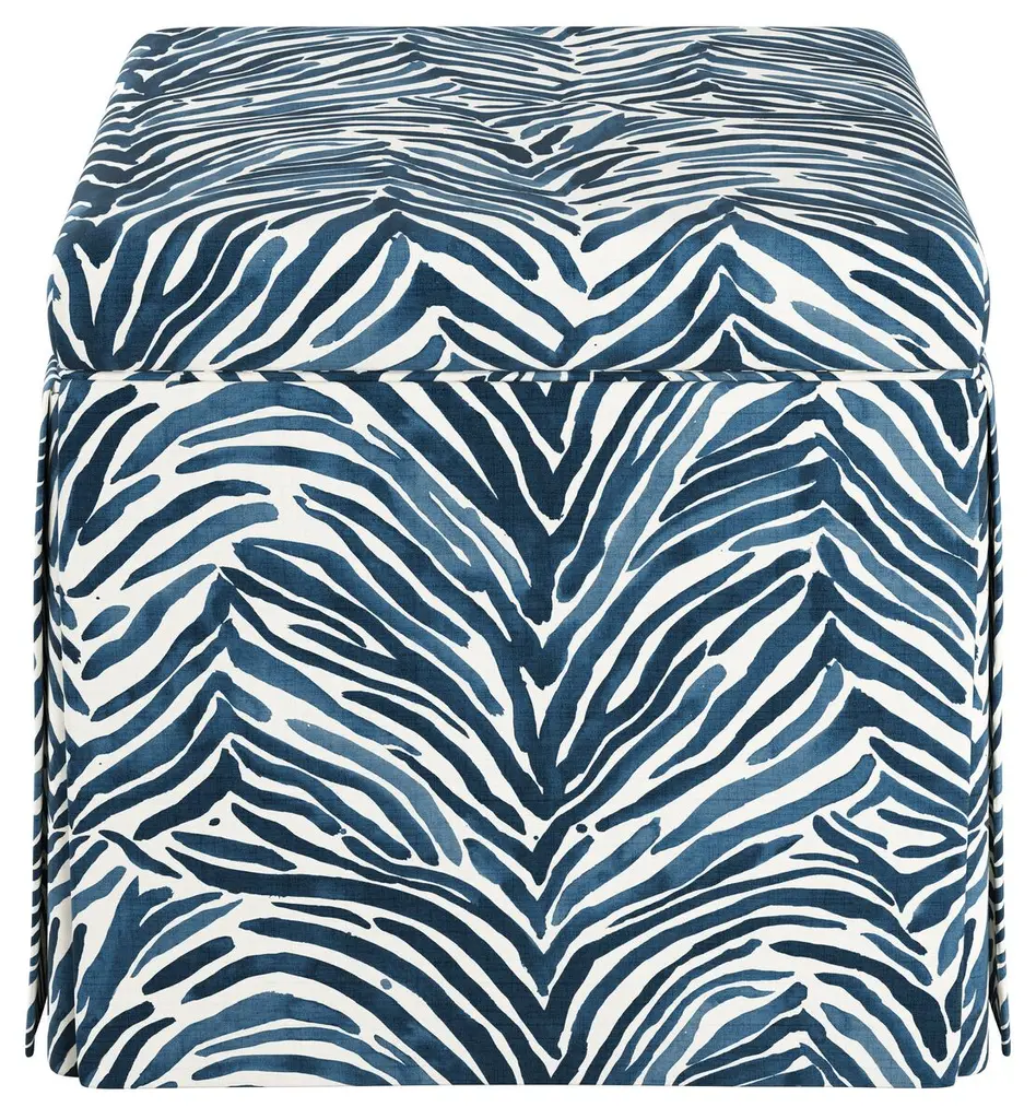 Crafted with a sturdy pine frame, this skirted ottoman enlivens any space with its bold linen-blend fabric in a zebra-inspired print. Best of all? This piece opens to reveal always-welcome storage space. Handcrafted in the USA.