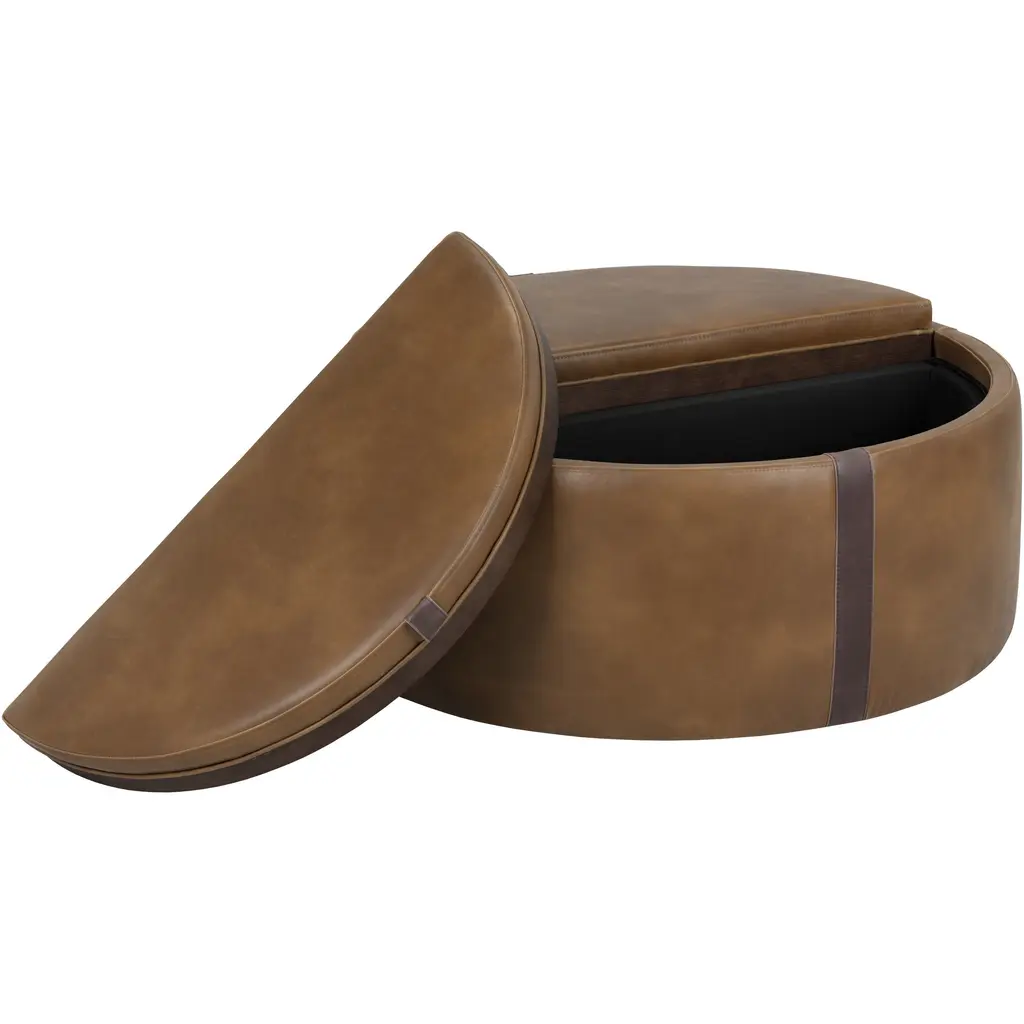 With a touch of retro influence, this modern wheeled storage ottoman will add form and function to any space. Features a handsome tobacco tan faux leather base with a contrasting autumn chestnut faux leather band. A convertible brown solid birch wood top completes this multi-purpose design. Also available in belfast heather grey fabric. Handle With Care: This design has been crafted with faux leather. Faux leather is manufactured to reflect the natural characteristics of leather as such, markings, wrinkles, grooves, and light scratches are appreciated characteristics. No two pieces will be alike. Visit our Product Care page for more information on how to ensure the lasting beauty of this piece.