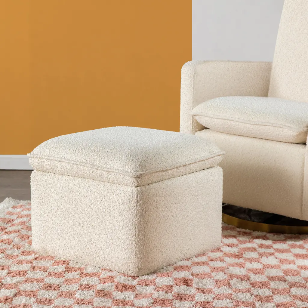 Elevate your nursery or cozy living space with the Cali Storage Ottoman from Babyletto. Its hand-upholstered boucle or eco-performance fabric adds texture and sophistication. The soft open and close mechanism ensures safety while the generous storage space keeps your baby's toys and blankets organized. Pair with the Cali Swivel Glider for a stylish and functional statement piece. Highlights