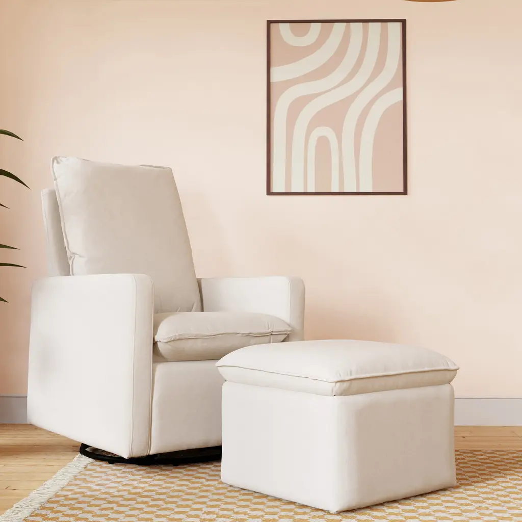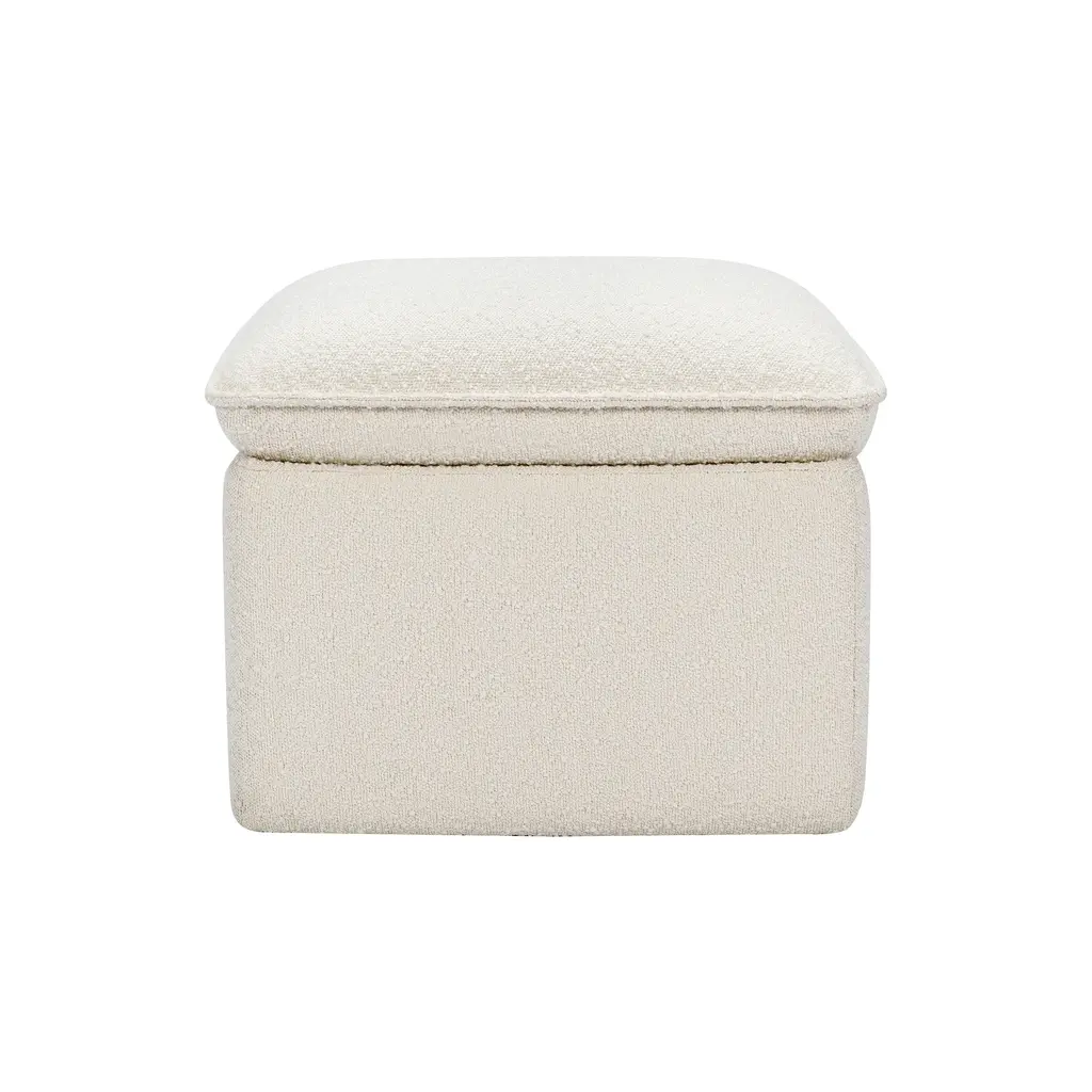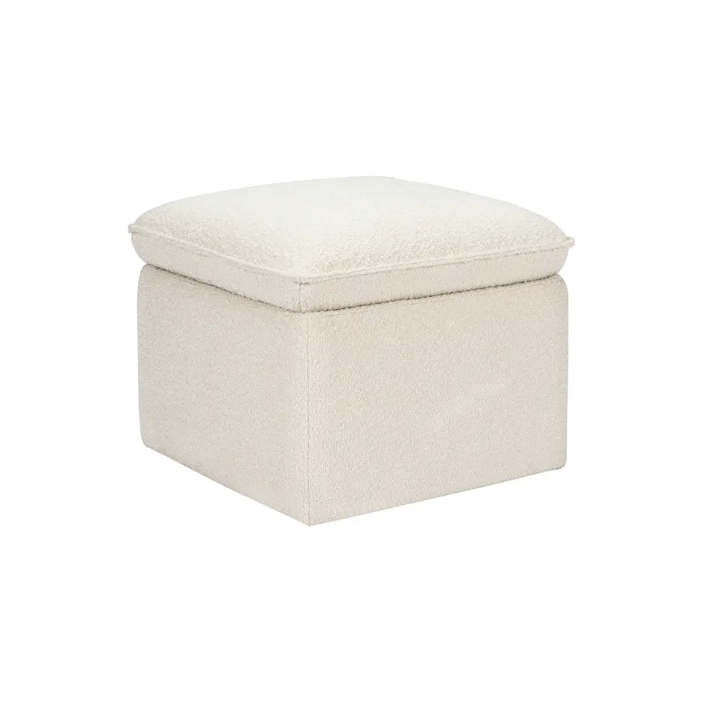 Elevate your nursery or cozy living space with the Cali Storage Ottoman from Babyletto. Its hand-upholstered boucle or eco-performance fabric adds texture and sophistication. The soft open and close mechanism ensures safety while the generous storage space keeps your baby's toys and blankets organized. Pair with the Cali Swivel Glider for a stylish and functional statement piece. Highlights