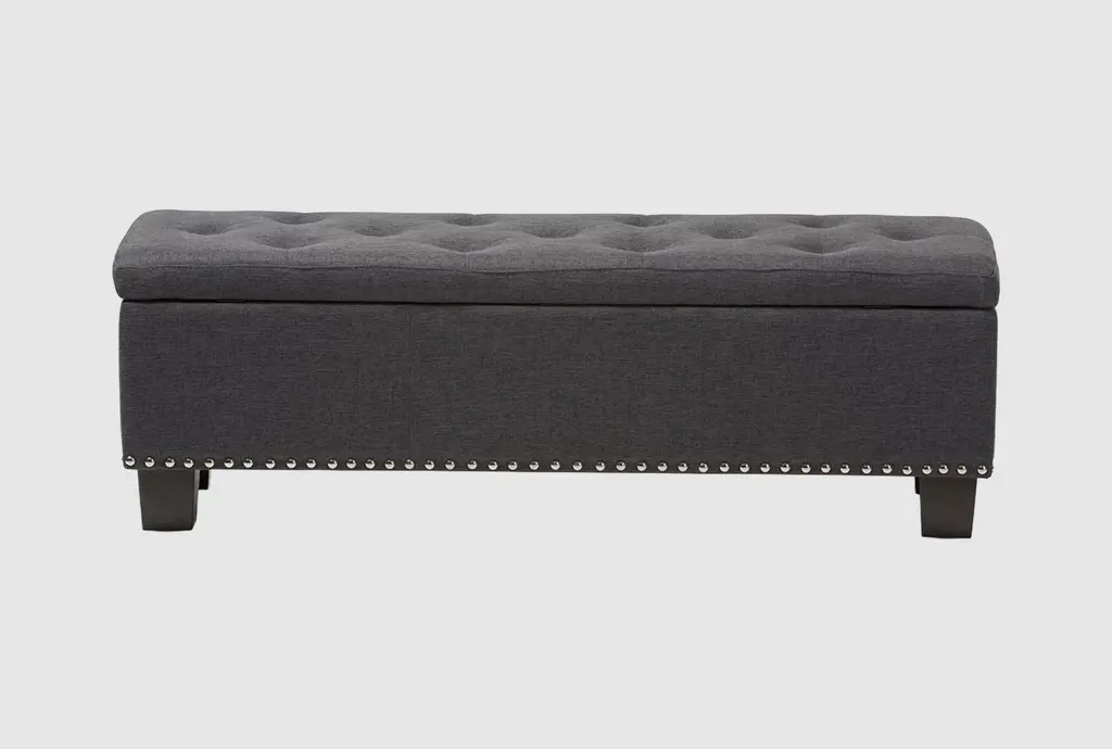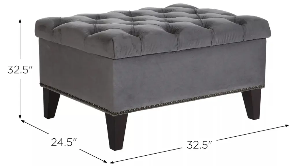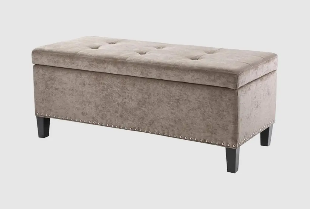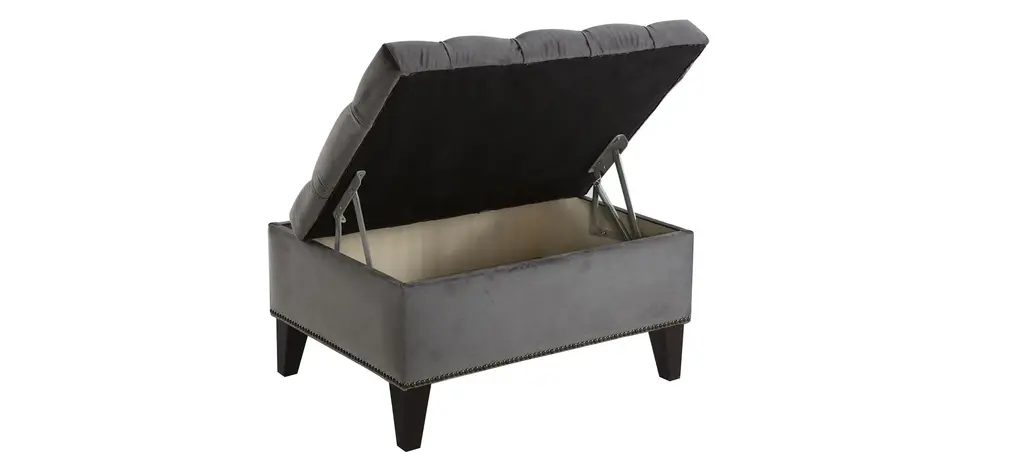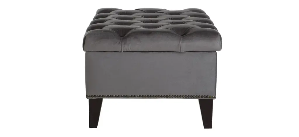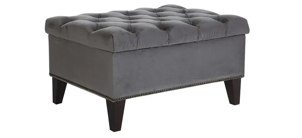 Perfect for perching your feet or stashing your favorite blanket, the Cecilia storage ottoman belongs in every room in the home. This rectangular ottoman features convenient storage beneath its surface that's roomy enough to hold your favorite blankets and pillows or books and board games. This savvy and chic ottoman is upholstered in a velvety performance fabric and features a plush button-tufted surface, vintage-inspired nialhead trim, and tapered wood legs for a timelessly modern appearance that fits in almost anywhere
