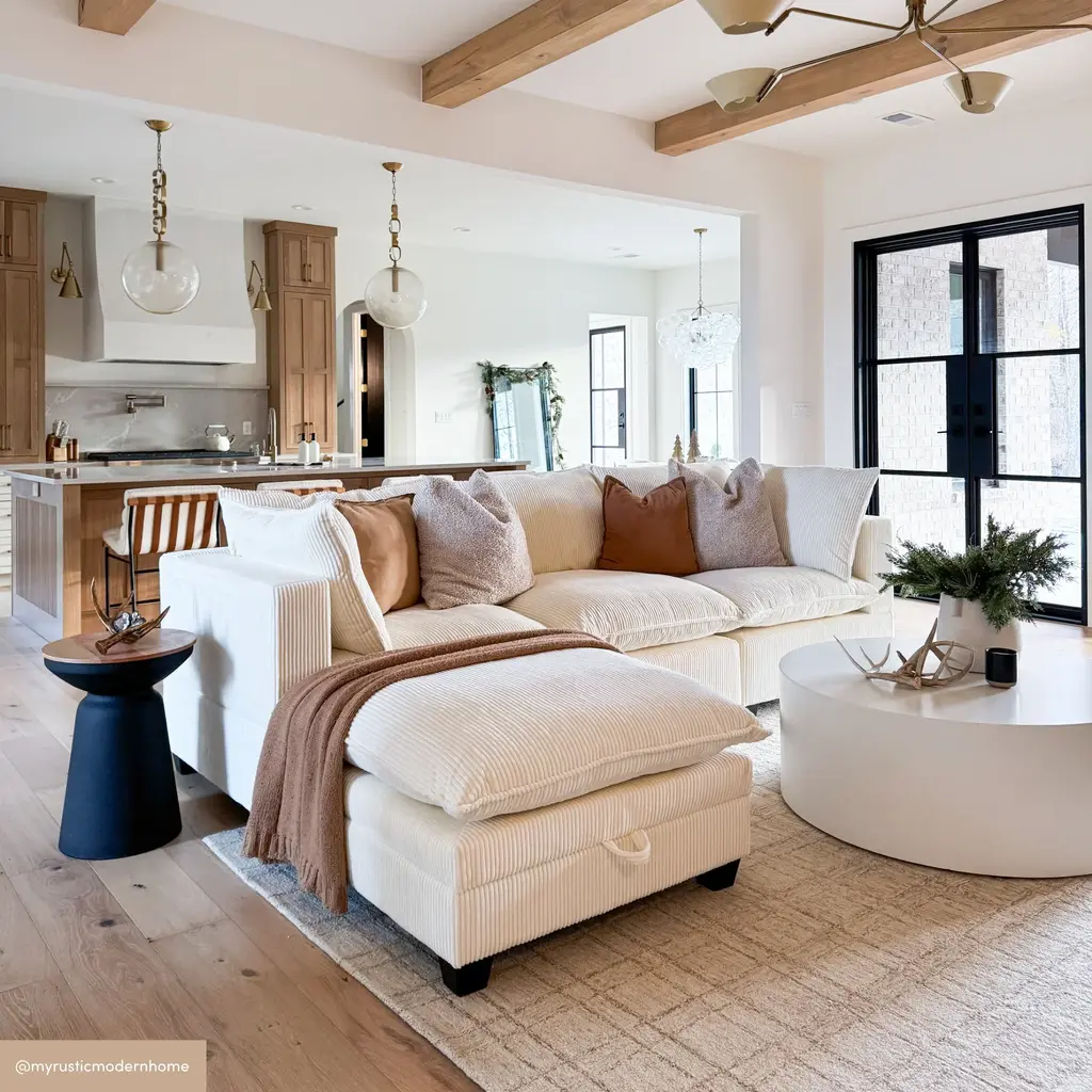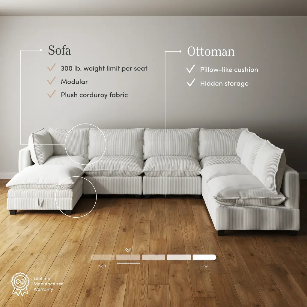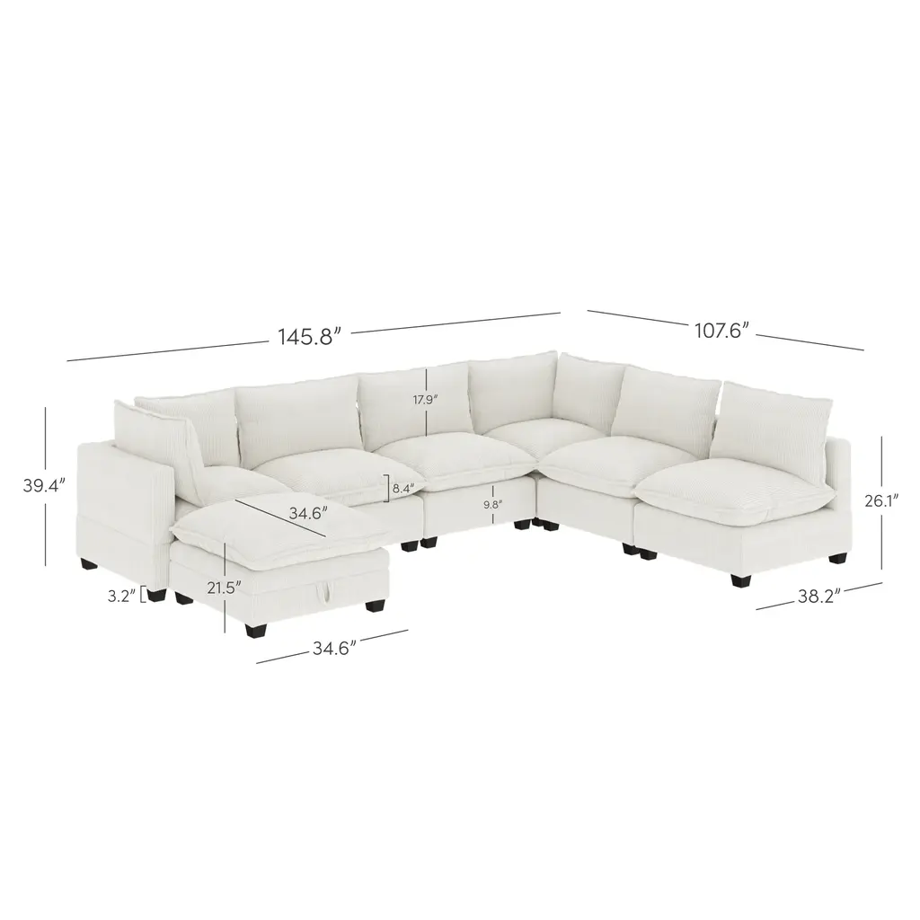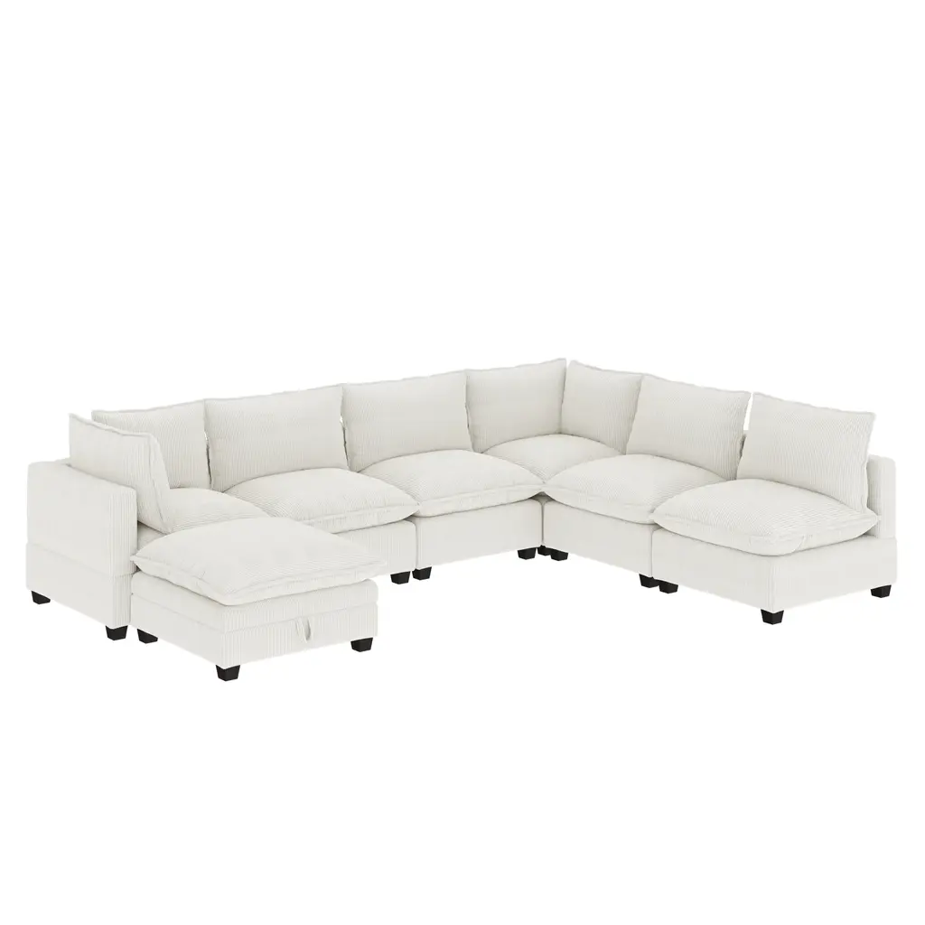 Corduroy 6-Seat Cloud Armless Sectional Sofa Couch & Storage Ottoman Pearl White