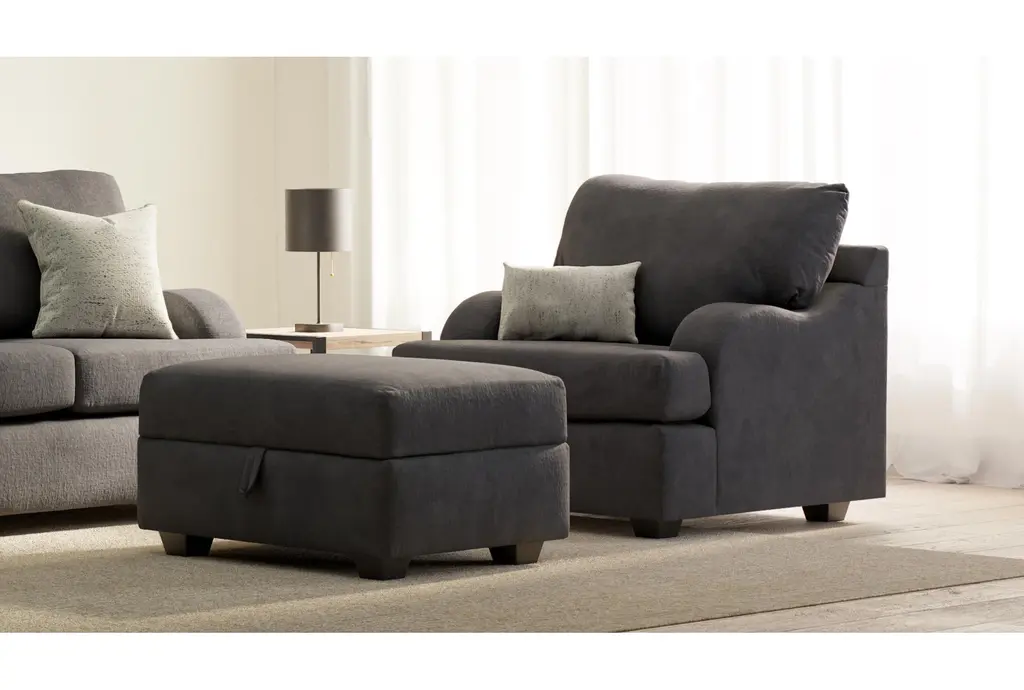The Esteban III Midnight Black 2 Piece Chair and Storage Ottoman Set is the perfect addition to any living room. This casual set features a chair and matching ottoman, both upholstered in soft and durable 100% polyester fabric. The midnight black color and recessed armrests provide a comfortable and neutral look that complements any decor.