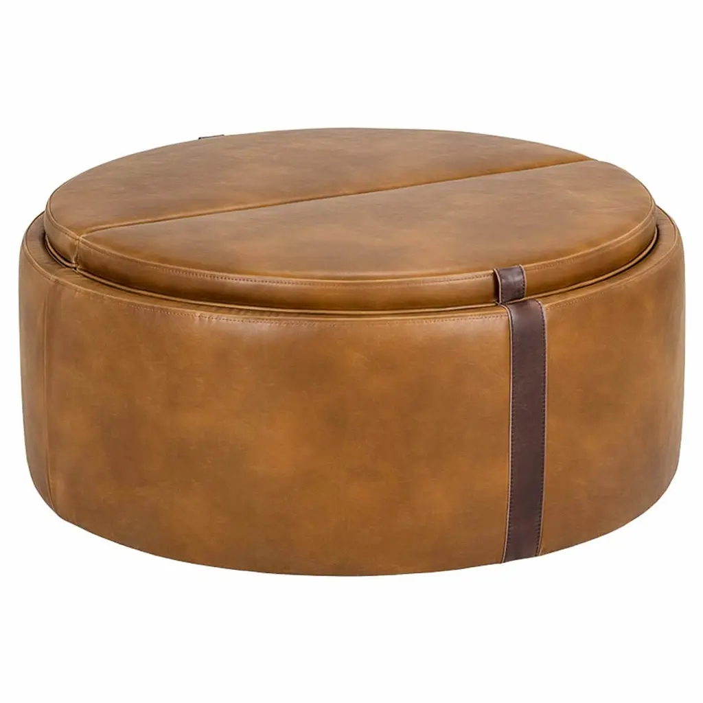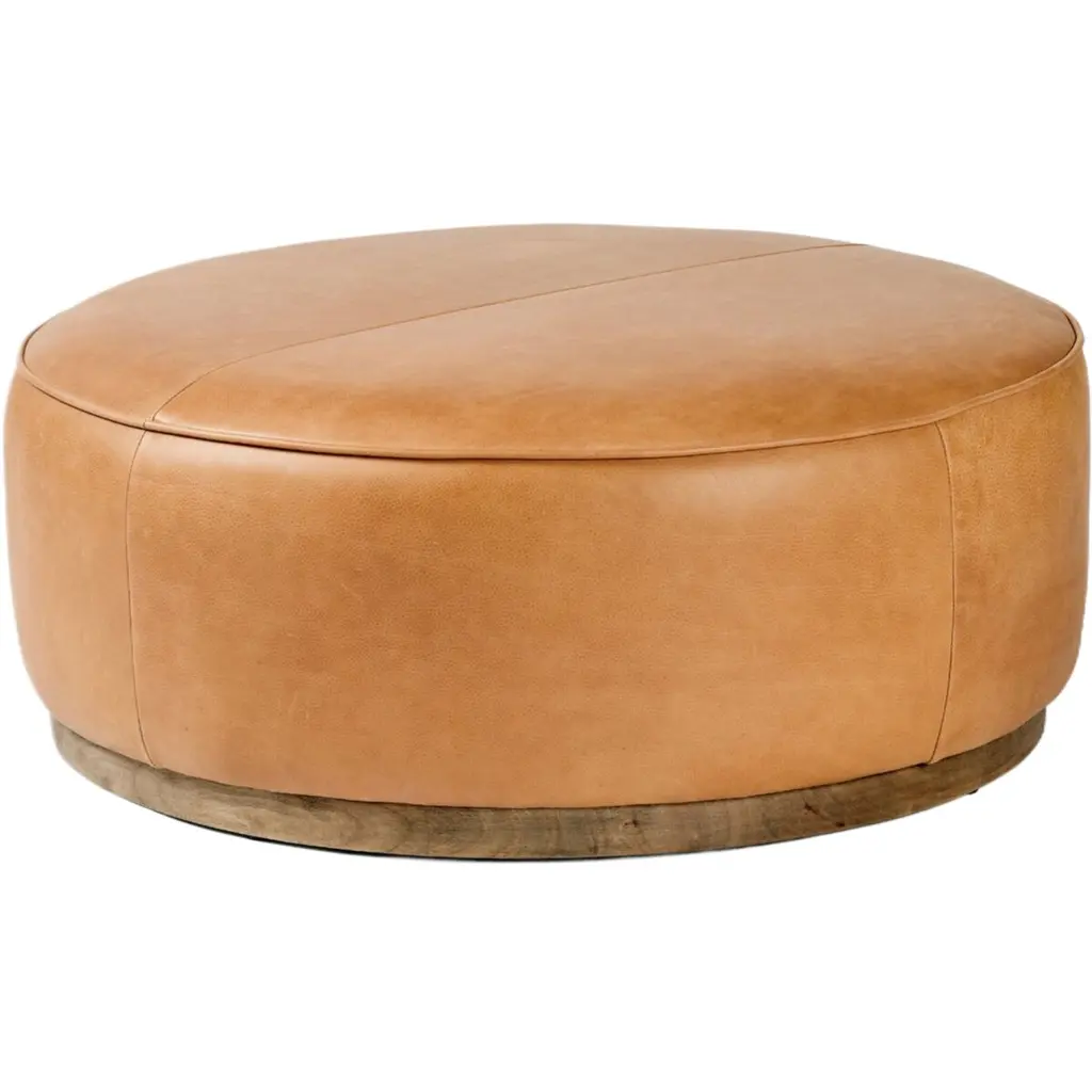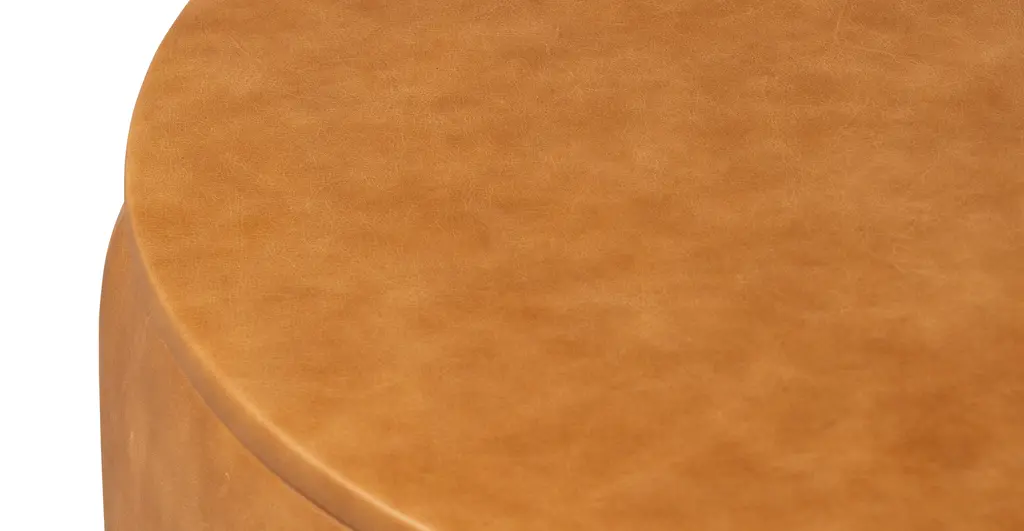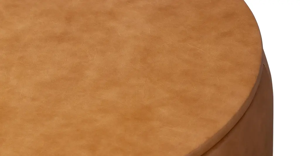 Meet the Herve Ottoman – a dual-role superstar that moonlights as art and storage magician! Lift its leather hat to uncover a secret stash for blankets, pillows, and sneaky clutter. It's like style and smarts joined hands for a living space party! With a round and roly-poly silhouette, it's perched on a wood base, toasted in warm walnut. Wrapped in premium Italian leather, each ottoman is a textural tale of whimsy and color capers!