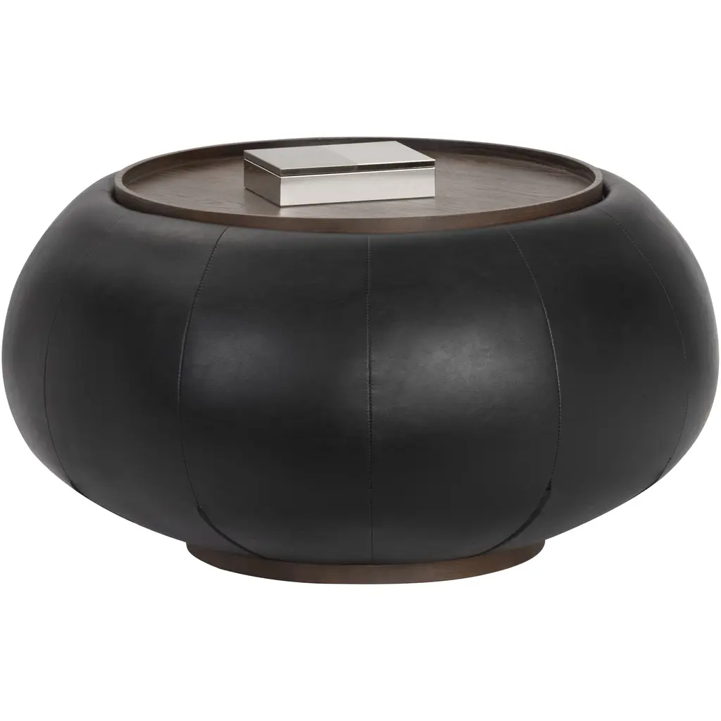 Meet the Herve Ottoman – a dual-role superstar that moonlights as art and storage magician! Lift its leather hat to uncover a secret stash for blankets, pillows, and sneaky clutter. It's like style and smarts joined hands for a living space party! With a round and roly-poly silhouette, it's perched on a wood base, toasted in warm walnut. Wrapped in premium Italian leather, each ottoman is a textural tale of whimsy and color capers!