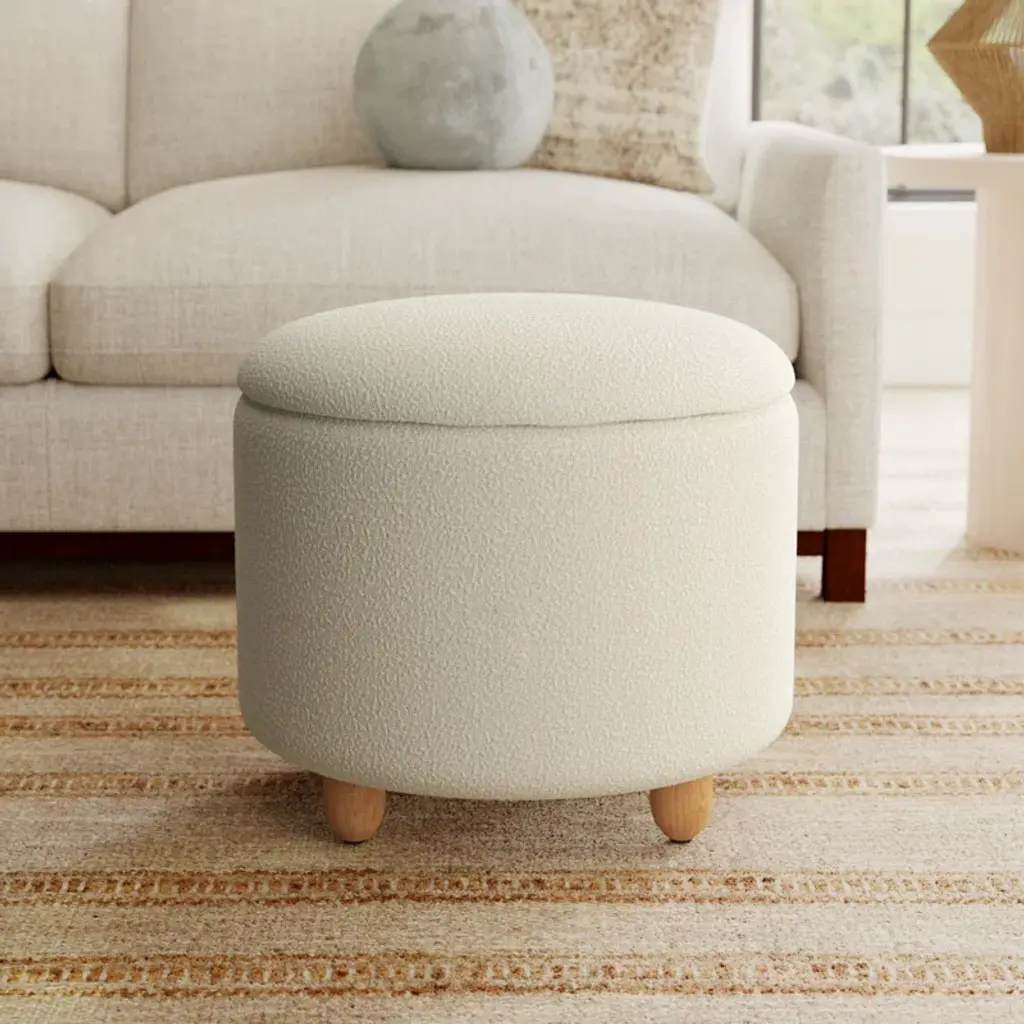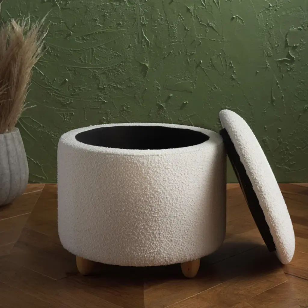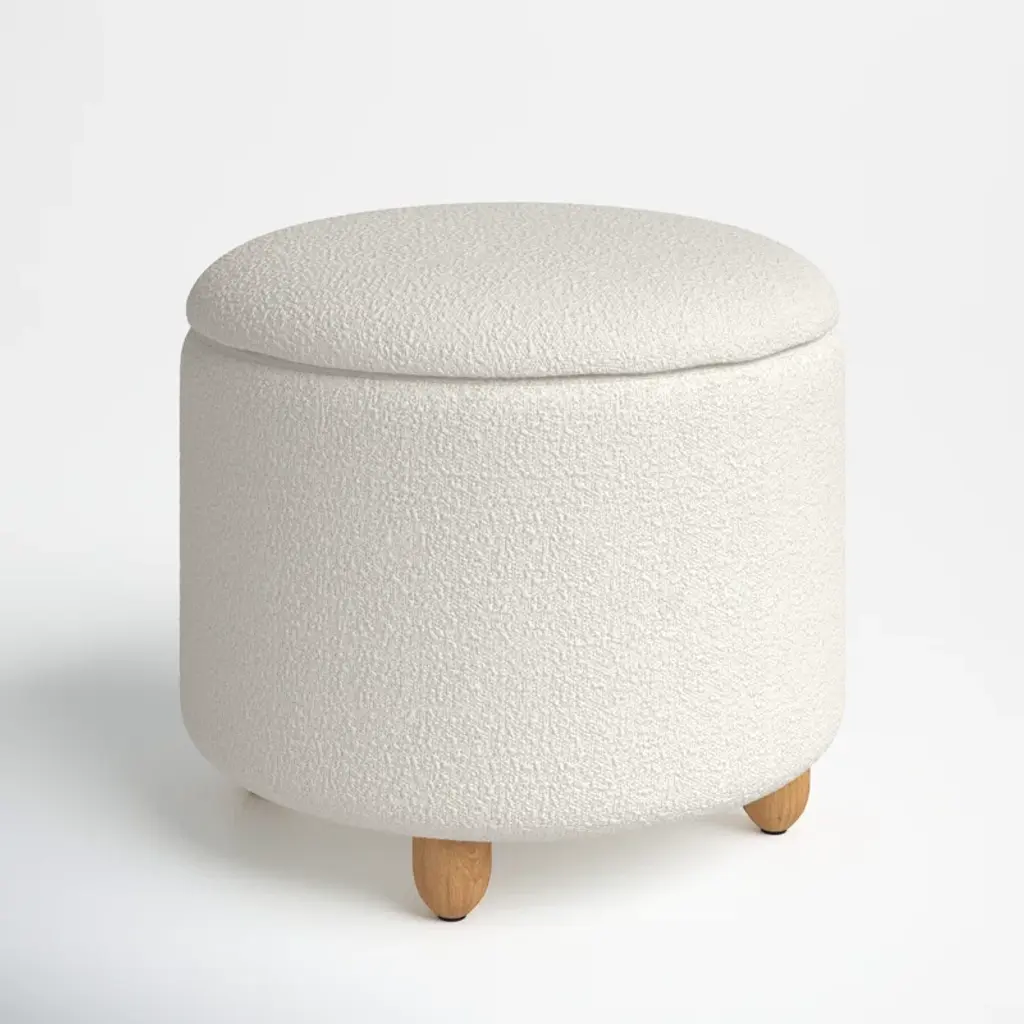 Bring style and convenience to your home with our storage ottoman. Expertly tailored, our ottoman shows off an elegant drum-shaped silhouette to harmonize with any style or decor. It is upholstered in a boucle and elevated upon oak legs to deliver rich and warm textures to your home. Underneath its sleek silhouette is ample storage to hide away your essentials and knick-knacks. The ottoman can keep your space clutter-free, and serve as a footrest or extra seat.