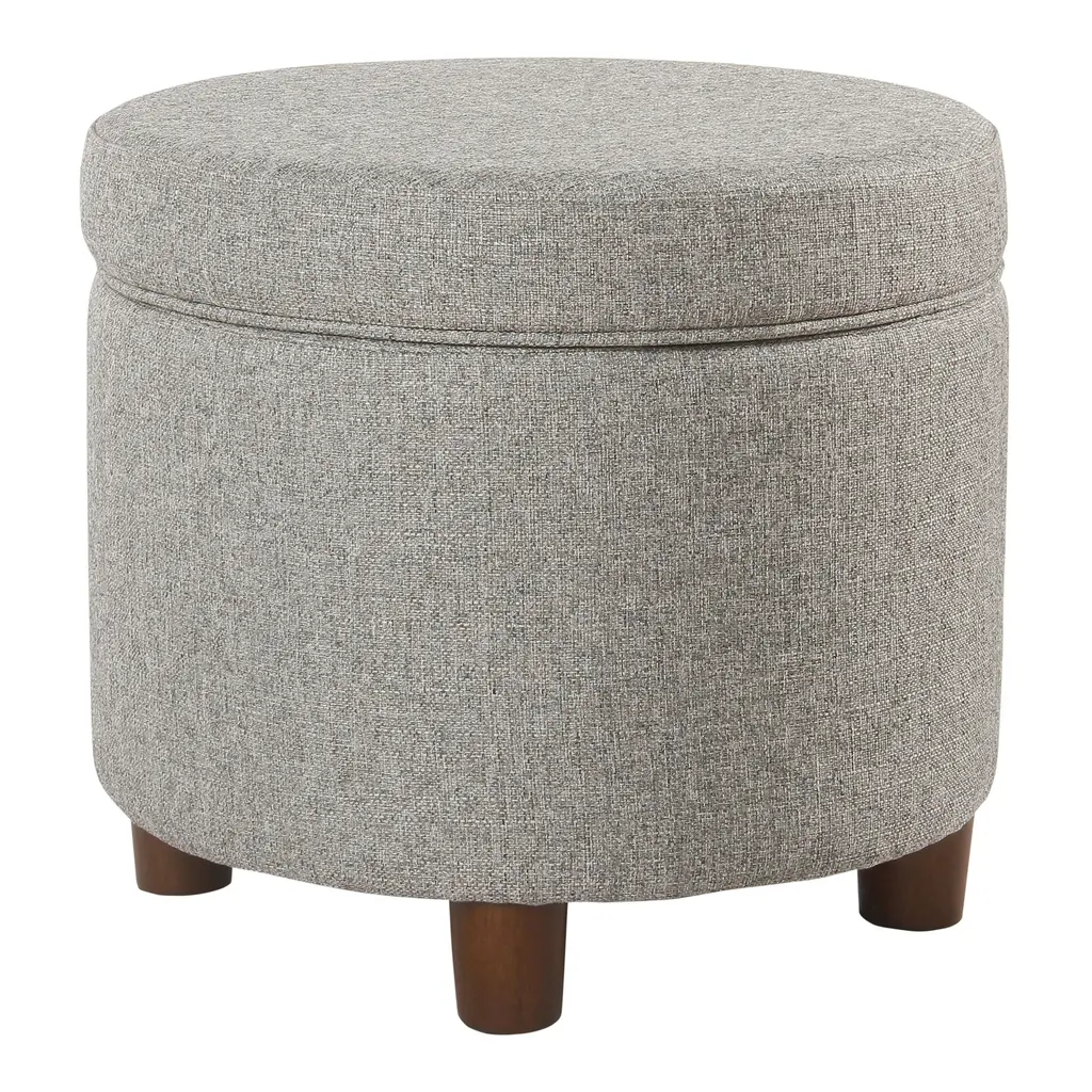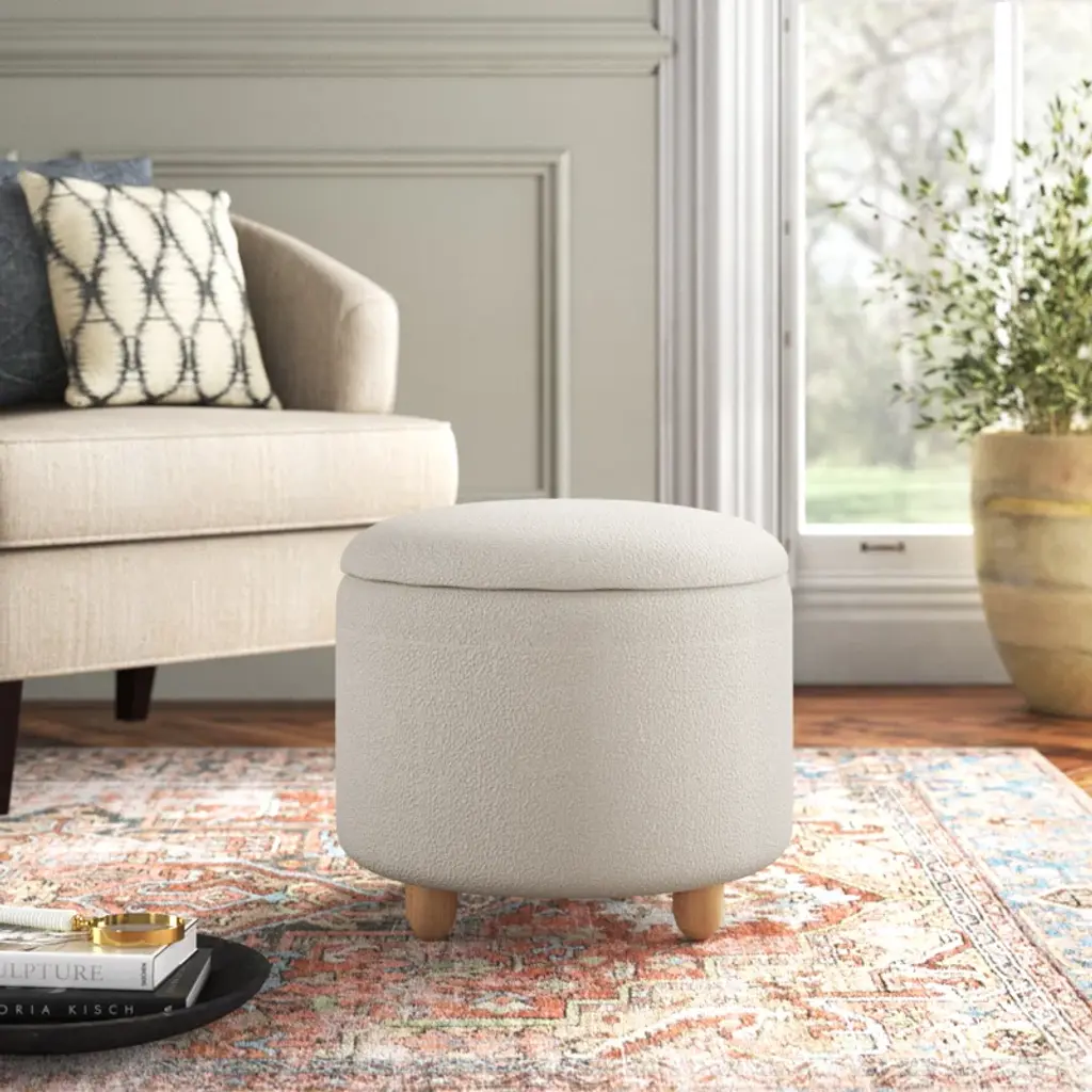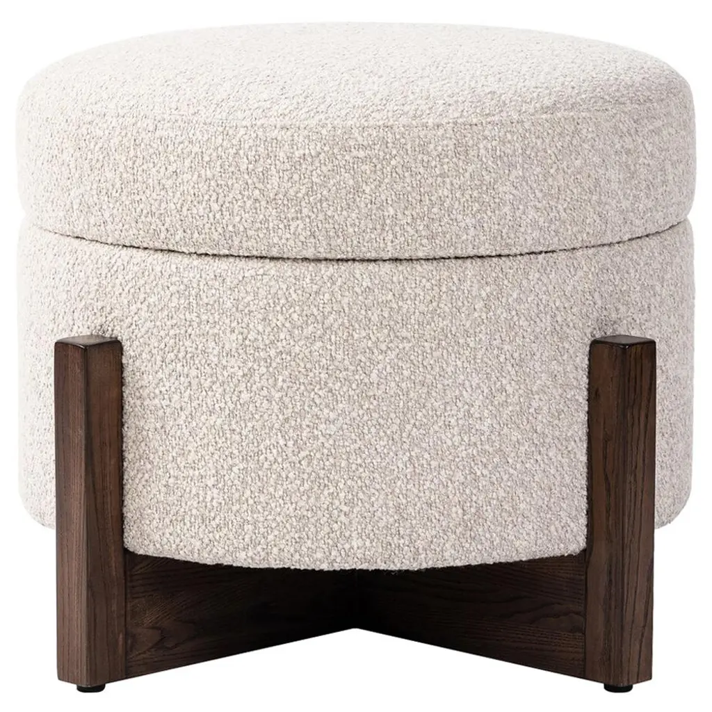 Bring style and convenience to your home with our storage ottoman. Expertly tailored, our ottoman shows off an elegant drum-shaped silhouette to harmonize with any style or decor. It is upholstered in a boucle and elevated upon oak legs to deliver rich and warm textures to your home. Underneath its sleek silhouette is ample storage to hide away your essentials and knick-knacks. The ottoman can keep your space clutter-free, and serve as a footrest or extra seat.