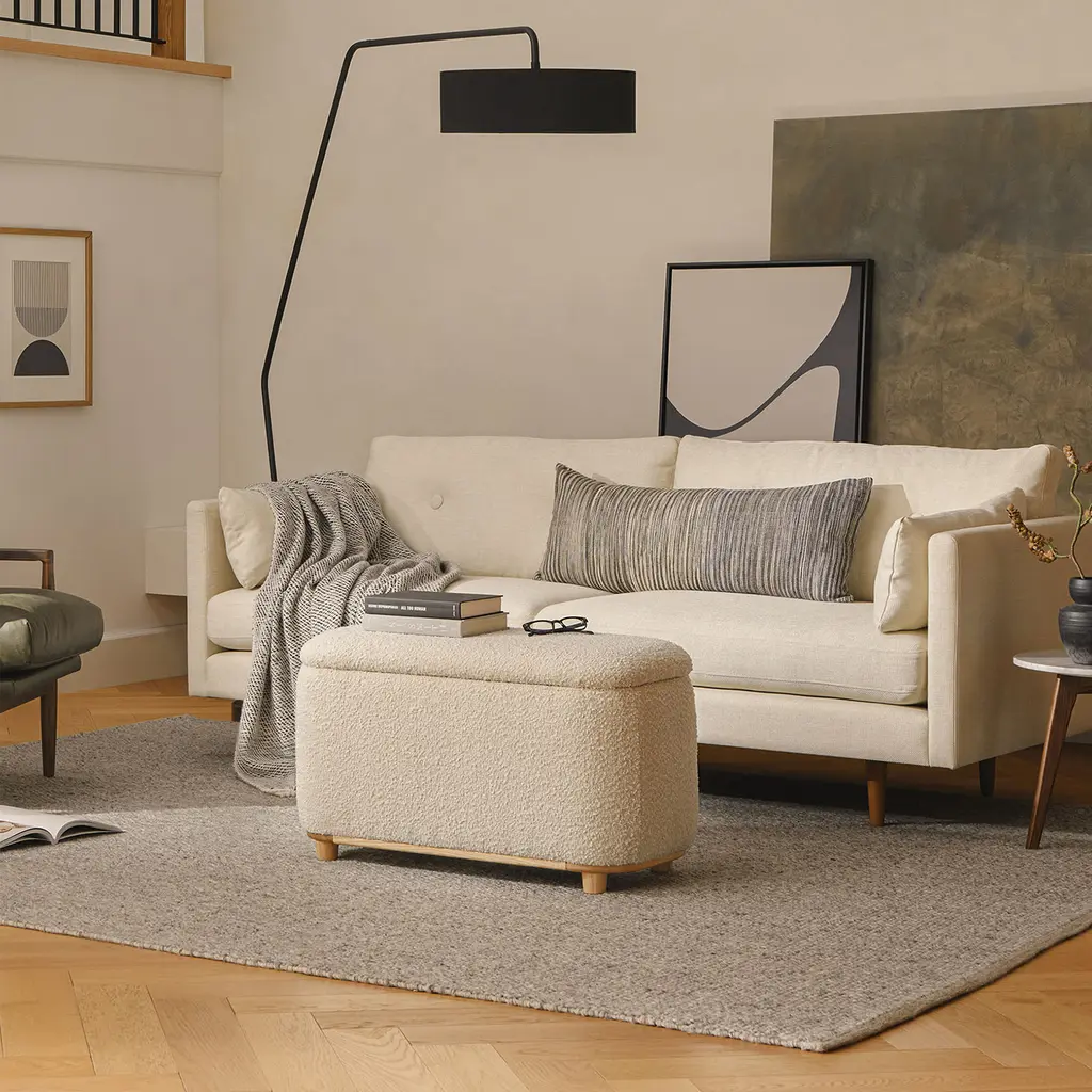 Holds your feet and your stuff. The Maribo Ottoman, with its soft-close lid and ample storage space, is a stylish double-threat.