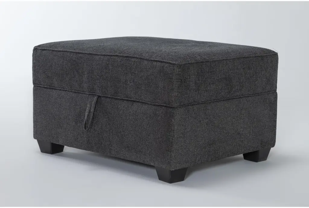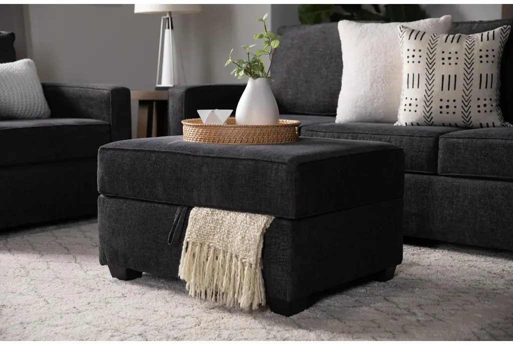 The Mathers Slate Grey Fabric Storage Ottoman combines modern style with practical functionality. Its charcoal finish offers a versatile and neutral addition to any bedroom or living room. Crafted from 100% polyester fabric, this ottoman provides both durability and comfort.