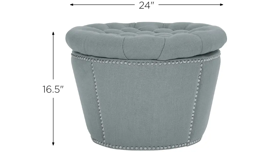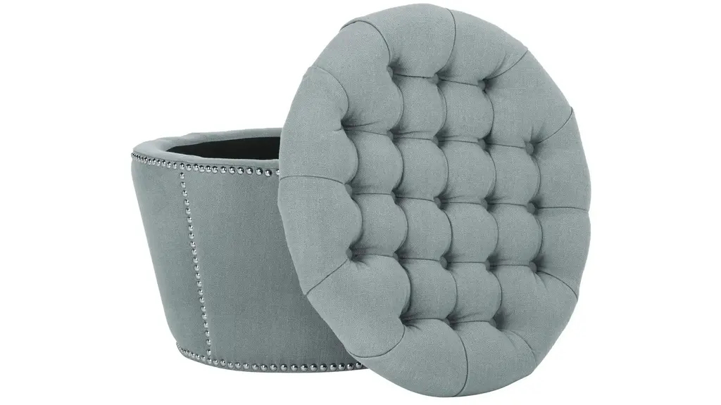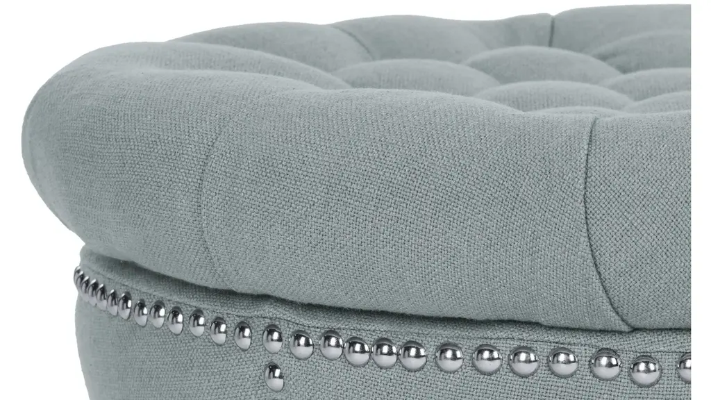 Organic in color and fabric, the chic Micha Storage Ottoman is a poetic and practical addition to any space. Micha's sky blue cotton linen blend is luxuriously button tufted on its lid which lifts to reveal hidden storage space inside. Silver nail head details add a designer smart touch.