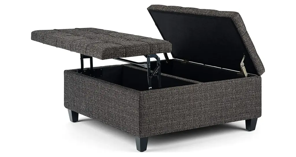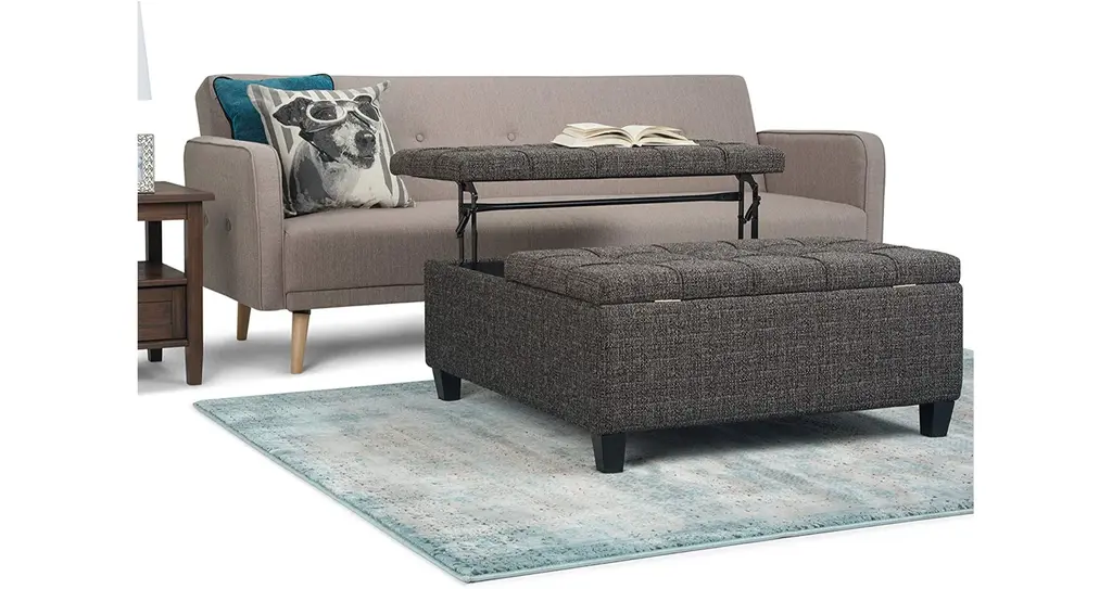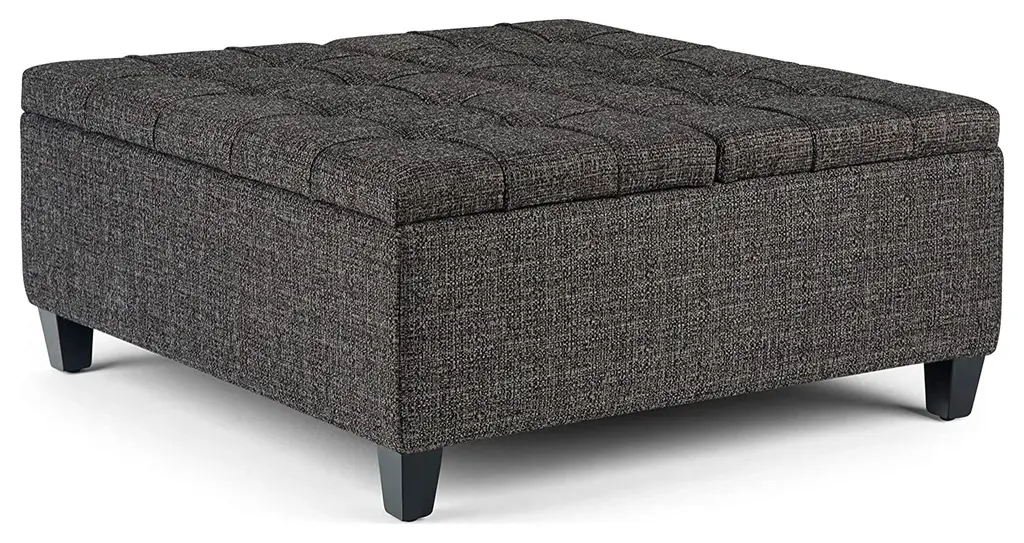 HAND CONSTRUCTED using solid wood, engineered woods and upholstered with durable upholsteryLARGE INTERIOR STORAGE SPACE with split lift topMULTI-FUNCTIONAL large square ottoman can be used in, living room, family room as a coffee table, foot stool, accent furniture or provide additional sittingDesign features tufted topDIMENSIONS: 36"W x 36"D x 16.5"H